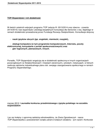 Działalność Stypendystów 2011-2015 TOP-Stypendyści i ich działalność W dwóch ostatnich edycjach programu TOP (edycja III: 2013/2014 oraz obecna - czwarta: 2014/2015) nasi stypendyści udzielają bezpłatnych konsultacji dla Seniorów z woj. śląskiego w ramach działalności prowadzonej przez Fundację Rozwoju Świętochłowic. Konsultacje dotyczą: - nauki języków obcych (jęz. angielski, niemiecki, rosyjski), - obsługi komputera (w tym programów komputerowych, Internetu, poczty elektronicznej, korzystanie z portali społecznościowych) oraz - gier logicznych, planszowych, innych. Ponadto, TOP-Stypendyści angażują się w działalność społeczną w innych organizacjach pozarządowych (w Świętochłowicach i miastach ościennych), szkołach, instytucjach, w których realizują założenia indywidualnego planu dot. swojego zaangażowania społecznego w ramach Programu Stypendialnego. marzec 2012: Laureatka konkursu przedmiotowego z języka polskiego na szczeblu wojewódzkim I po raz kolejny z ogromną radością odnotowaliśmy, że Zosia Ogrodowczyk - nasza TOP-Stypendystka z powodzeniem wzięła udział w kolejnym działaniu - tym razem: Konkursie 1/9 Działalność Stypendystów 2011-2015 Przedmiotowym organizowanym przez Kuratorium Oświaty w Katowicach. Składał się on z III etapów - szkolnego, rejonowego i wojewódzkiego. Za każdym razem był test, a określona ilość punktów pozwalała na przejście dalej. W etapie wojewódzkim (za wymaganą liczbę punktów) otrzymuje się tytuł laureata. Gratulujemy Zosiu i życzymy dalszych sukcesów! Brawo! http://www.womczest.edu.pl/pliki/konkursy/20112012-p-wo-l-by.pdf http://www.kuratorium.katowice.pl/userfiles/file/Konkursy%20turnieje%20olimpiady/Kon kursy%20przedmiotowe/regulaminy%202011%20WKP/j.polski/regulamin_pols.pdf marzec 2012: Najlepsze w recytowaniu W Młodzieżowym Domu Kultury odbyły się eliminacje do 57. Ogólnopolskiego Konkursu Recytatorskiego. Cieszymy się niezmiernie, że laureatką turnieju recytatorskiego została Jessica Kufa - nasza TOP-Stypendystka. Już niebawem Jessica będzie reprezentować Świętochłowice w etapie rejonowym, dlatego już teraz życzymy jej powodzenia! 2/9 Działalność Stypendystów 2011-2015 http://swietochlowice.naszemiasto.pl/artykul/1328845,swietochlowice-i-lo-najlepsze-na-k onkursie-recytatorskim,id,t.html#da69334e111a2e90,1,3,6 http://swietochlowice.naszemiasto.pl/artykul/1327981,krotko-najlepsi-recytatorzy-w-dom u-kultury,id,t.html#da69334e111a2e90,1,3,6 marzec 2012: Nowe logo Młodzieżowego Domu Kultury Z radością odnotowaliśmy kolejne wyróżnienie Zosi Ogrodowczyk - naszej stypendystki. Tym razem, za stworzenie projektu logotypu Młodzieżowego Domu Kultury w Świętochłowicach, propozycja Zosi została wyróżniona przede wszystkim za ciekawy wyraz artystyczny. Gratulujemy i życzymy dalszych sukcesów! http://www.tvstm.pl/artykul/nowe-logo-mdk-947 3/9 Działalność Stypendystów 2011-2015 luty 2012: Rada Młodzieżowa przy Prezydencie Miasta 21 lutego 2012 r. zainaugurowała swoją działalność Rada Młodzieżowa, jako gremium doradcze i opiniotwórcze, skupiające uczniów i absolwentów szkół ponadpodstawowych oraz innych jednostek oświatowych ze Świętochłowic. Cieszymy się, że do Rady powołani zostali także dwaj nasi Stypendyści: Dawid Malcherek oraz Mateusz Raabe. Życzymy Wam powodzenia i prawdziwej satysfakcji z podejmowanych inicjatyw! http://swce.pl/Rada-Mlodziezowa-inauguruje-dzialalnosc,11063 http://www.swietochlowice.pl/sprawy-w-r%C4%99kach-m%C5%82odzie%C5%BCy.html http://swietochlowice.naszemiasto.pl/artykul/galeria/1294221,swietochlowice-mlodziez-b edzie-pomagac-prezydentowi-w,id,t.html?kategoria=678#27ae1cd99488fbe6,1,3,60 luty 2012: Zmagania z turystyką Mimo iż bez większych sukcesów, dobrze że młodzi ludzie uczestniczą w takich działaniach. Mo wa o konkursie Wiedzy o Turystyce, który zorganizowała katowicka Akademia Wychowania Fizycznego. Konkurs był elementem Dnia Otwartego na wydziale Zarządzania Sportem i Turystyką. Wśród reprezentantów ze Świętochłowic, była jedna z naszych Stypendystek - Jessica Kufa. 4/9 Działalność Stypendystów 2011-2015 http://swce.pl/Zmagania-z-turystyka,11068 styczeń 2012: Plebiscyt na najpopularniejszego sportowca Świętochłowic Z przyjemnością informujemy, że Alan Szeremeta - nasz TOP-Stypendysta został nominowany w plebiscycie Dziennika Zachodniego i walczy o tytuł "Najpopularniejszego sportowca Świętochłowic". Zachęcamy do głosowania na Alana i trzymamy kciuki za otrzymanie jak największej liczby głosów poparcia (choć i tak największym wyróżnieniem jest sama nominacja w tym konkursie). http://swietochlowice.naszemiasto.pl/artykul/galeria/1210425,najpopularniejszy-sportowi ec-swietochlowic-glosowanie,galeria,1916201,id,t,tm,zid.html styczeń 2012: Moja misja w wolontariacie! Jedną z naszych TOP-Stypendystek jest Marysia Ziętek, która działa w ramach Salezjańskiego Wolontariatu Misyjnego AKWAABA Świętochłowice. Życzymy wytrwałości w działaniach u naszych Przyjaciół z AKWAABY i mamy nadzieję, że dzięki zaangażowaniu i wsparciu m.in. 5/9 Działalność Stypendystów 2011-2015 Marysi, SWM będzie podejmował kolejne ciekawe działania. http://www.facebook.com/media/set/?set=a.206190402806767.48875.133316716760803&t ype=1 grudzień 2011: Foto Miasto: piękne... bo Nasze! Zachęcamy do odwiedzania fotobloga prowadzonego przez Dagmarę, naszą TOP-Stypendystkę, który poświęcony jest miastu Świętochłowice (w obiektywie) oraz idei śląskości - czym jest i jak jest rozumiana przez młodych ludzi... Trzymamy kciuki za aktywny rozwój bloga i życzymy powodzenia w jego prowadzeniu! http://miastofoto.wordpress.com/autorzy/ grudzień 2011: Prezentacje 2011 W Młodzieżowym Domu Kultury prezentowane są prace zgłoszone na konkurs "Prezentacje’2011" - przegląd twórczości plastycznej uczniów świętochłowickich szkół, który po ra