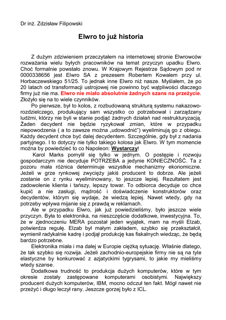 Dr in . Zdzis aw Filipowski Elwro to ju historia Z du ym zdziwieniem przeczyta em na internetowej stronie Elwrowców rozwa ania wielu by ych pracowników na temat przyczyn upadku Elwro. Cho formalnie powsta o znowu. W Krajowym Rejestrze S dowym pod nr 0000338656 jest Elwro SA z prezesem Robertem Kowalem przy ul. Horbaczewskiego 51/25. To jednak inne Elwro ni nasze. My la em, e po 20 latach od transformacji ustrojowej nie powinno by w tpliwo ci dlaczego firmy ju nie ma. Elwro nie mia o absolutnie adnych szans na prze ycie. o si na to wiele czynników. Po pierwsze, by to kolos, z rozbudowan struktur systemu nakazoworozdzielczego, produkuj cy sam wszystko co potrzebowa i zarz dzany lud mi, którzy nie byli w stanie podj adnych dzia nad restrukturyzacj . aden decydent nie b dzie ryzykowa zmian, które w przypadku niepowodzenia ( a to zawsze mo na „udowodni ”) wyeliminuj go z obiegu. Ka dy decydent chce by dalej decydentem. Szczególnie, gdy by z nadania partyjnego. I to dotyczy nie tylko takiego kolosa jak Elwro. W tym momencie mo na by powiedzie to co Napoleon: Wystarczy! Karol Marks pomyli si tylko w jednym. O post pie i rozwoju gospodarczym nie decyduje POTRZEBA a jedynie KONIECZNO . Ta z pozoru ma a ró nica determinuje wszystkie mechanizmy ekonomiczne. Je eli w grze rynkowej zwyci y jaki producent to dobrze. Ale je eli zostanie on z rynku wyeliminowany, to jeszcze lepiej. Rezultatem jest zadowolenie klienta i ta szy, lepszy towar. To odbiorca decyduje co chce kupi a nie zas ugi, m dro i do wiadczenie konstruktorów oraz decydentów, którym si wydaje, e wiedz lepiej. Nawet wtedy, gdy na potrzeby wp ywa mijanie si z prawd w reklamach. Ale w przypadku Elwro, jak ju powiedzieli my, by o jeszcze wiele przyczyn. By a to elektronika, na nieszcz cie dodatkowe, inwestycyjna. To, e w zjednoczeniu MERA pozosta jeden wyj tek, mam na my li Elzab, potwierdza regu . Elzab by ma ym zak adem, szybko si przekszta ci , wymieni radykalnie kadr i podj produkcj kas fiskalnych wiedz c, e b bardzo potrzebne. Elektronika mia a i ma dalej w Europie ci sytuacj . W nie dlatego, e tak szybko si rozwija. Je eli zachodnio-europejskie firmy nie s na tyle elastyczne by konkurowa z azjatyckimi tygrysami, to jakie my mieli my wtedy szanse. Dodatkowa trudno to produkcja du ych komputerów, które w tym okresie zosta y zast powane komputerami osobistymi. Najwi kszy producent du ych komputerów, IBM, mocno odczu ten fakt. Móg nawet nie prze i d ugo leczy rany. Jeszcze gorzej by o z ICL. To, e mieli my liczn kadr konstruktorów, konkuruj cych mi dzy sob o swoje tematy, a nie integruj cych si y, to te wada. Dobrymi ch ciami, pomys ami i powiedzmy tu, konstrukcjami piek o jest wybrukowane. Liczy si tylko wyprodukowany wyrób, który kto b dzie chcia kupi za cen daj globalnie zysk. Zwykle trzeba jeszcze du o rodków na marketing i reklam . Ale w pa stwowej firmie aden dyrektor si na to nie zgodzi. Mo e to zrobi tylko prawdziwy w ciciel, bo to jego pieni dze. Czy kto potrafi by mi wyt umaczy jak mogliby my przekona wolnorynkowego klienta do kupna komputera, gdy sami nie potrafili my w ca ej historii Elwro zastosowa ich do przetwarzania danych na produkcji? Nawet cho by do samej gospodarki materia owej, nie mówi c o planowaniu czy sterowaniu produkcj . Przecie w Elwro nigdy nie by o sieci komputerowej. Dopiero Telect j wprowadzi w 2000 r. Mieli my tylu programistów, a zwyk y arkusz kalkulacyjny do obliczenia narzutów aktualizowany by raz w roku. To powinno dzia cho quasi on-line, by symulowa decyzje o op acalno ci i sposobach jej poprawy. Obserwowa em decyzje, które w warunkach wolnej konkurencji szybko by pogr y firm . Tak si z o, e b c krótki czas na Politechnice mia em zaj cia ze studentami z przedmiotu: chemia wody, wi c znam troch temat. Tam tak e do pracy u ywa em czujników do pomiaru parametrów wody; przewodnictwa i nasycenia tlenem. Ale mierniki by y bateryjne i mie ci y si w walizeczce. Aby wykona terenowe badanie wody wystarczaj jonoselektywne elektrody, konduktometr, pH-metr i miernik rozpuszczonego tlenu. Wszystko mie ci si w walizce ( i to bez przys owiowych akumulatorów w plecaku ). Do tego terenówka, ewentualnie z pontonem. Pomiaru BZT5 i ChZT i tak w warunkach poligonowych si nie robi. My jednak produkowali my ca e mobilne laboratorium, Nysk z przyczep kempingow . Ciekawi mnie jak d ugo by o wo one to ca e szk o laboratoryjne nim przyczepa wróci a do pierwotnej funkcji oraz jak cz sto zwykle Nysk trzeba by o wyci ga traktorem z b ota. Produkowali my te komponenty RTV. Ale nieprawd jest, e prze cznik kana ów z Elwro mia ka dy polski telewizor. Osobi cie kupi em na pocz tku 1974 r. telewizor ju z klawiszowym prze cznikiem i zakresem UHF. Ju wtedy produkowali my ca kiem przestarza y wyrób. Ale produkcja daj ca chleb Elwrowcom by a zawsze traktowana marginalnie przez dyrekcj . I dowodem na to jest nawet tematyczna zawarto internetowej strony o Elwrowcach. Nad rozwojem innych elektronicznych wyrobów wielkoseryjnych pracowa a tylko ma a sekcja konstrukcyjno-technologiczna w Biurze Technologicznym. Nowe konstrukcje kalkulatorów i zmiany wprowadzano tylko na wniosek racjonalizatorski, który sk ada y 3, zawsze te same osoby. Z procesem technologicznym te by regres. Ta ma zosta a wyeliminowana. Jak robi kalkulatory decydowa wydzia produkcyjny. Technolog robi tylko materia ówk i wstawia czasy pod dyktando produkcji. Wrócili my do manufaktury. To szybko wysz o na wierzch. W 1990 roku nawi zano wspó prac kooperacyjn z firm Cherry, producenta miedzy innymi klawiatur komputerowych. W Elwro wykonano formy i rozpocz to produkcj obudów klawiatur. W za eniu mia by tak e monta . Ale na zmontowanie p ytki nasz zak ad potrzebowa 0,5 godziny. A u producenta operacja monta u trwa a a 1,5 minuty, bo jednocze nie dla 4 p yt. Wi c nasz poziom technologiczny monta u elektronicznego by kompromitacj . Równolegle z Elwro taka sam propozycj kooperacji dosta jeden z zak adów TESLA w Czechach. I oni sprostali wyzwaniu. U