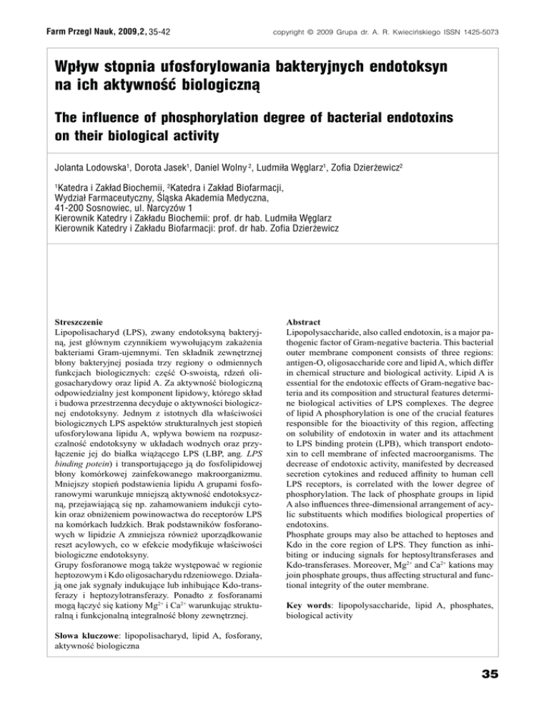 &ARM0RZEGL.AUK COPYRIGHT'RUPADR!2+WIECIÊSKIEGO)33. 7PYWSTOPNIAUFOSFORYLOWANIABAKTERYJNYCHENDOTOKSYN NAICHAKTYWNOu¿BIOLOGICZN 4HEINFLUENCEOFPHOSPHORYLATIONDEGREEOFBACTERIALENDOTOXINS ONTHEIRBIOLOGICALACTIVITY *OLANTA,ODOWSKA$OROTA*ASEK$ANIEL7OLNY,UDMIA7ÃGLARZ:OFIA$ZIEREWICZ +ATEDRAI:AKAD"IOCHEMII+ATEDRAI:AKAD"IOFARMACJI 7YDZIA&ARMACEUTYCZNYgLSKA!KADEMIA-EDYCZNA 3OSNOWIECUL.ARCYZÌW +IEROWNIK+ATEDRYI:AKADU"IOCHEMIIPROFDRHAB,UDMIA7ÃGLARZ +IEROWNIK+ATEDRYI:AKADU"IOFARMACJIPROFDRHAB:OFIA$ZIEREWICZ Streszczenie Lipopolisacharyd (LPS), zwany endotoksyną bakteryjną, jest głównym czynnikiem wywołującym zakażenia bakteriami Gram-ujemnymi. Ten składnik zewnętrznej błony bakteryjnej posiada trzy regiony o odmiennych funkcjach biologicznych: część O-swoistą, rdzeń oligosacharydowy oraz lipid A. Za aktywność biologiczną odpowiedzialny jest komponent lipidowy, którego skład i budowa przestrzenna decyduje o aktywności biologicznej endotoksyny. Jednym z istotnych dla właściwości biologicznych LPS aspektów strukturalnych jest stopień ufosforylowana lipidu A, wpływa bowiem na rozpuszczalność endotoksyny w układach wodnych oraz przyłączenie jej do białka wiążącego LPS (LBP, ang. LPS binding potein) i transportującego ją do fosfolipidowej błony komórkowej zainfekowanego makroorganizmu. Mniejszy stopień podstawienia lipidu A grupami fosforanowymi warunkuje mniejszą aktywność endotoksyczną, przejawiającą się np. zahamowaniem indukcji cytokin oraz obniżeniem powinowactwa do receptorów LPS na komórkach ludzkich. Brak podstawników fosforanowych w lipidzie A zmniejsza również uporządkowanie reszt acylowych, co w efekcie modyfikuje właściwości biologiczne endotoksyny. Grupy fosforanowe mogą także występować w regionie heptozowym i Kdo oligosacharydu rdzeniowego. Działają one jak sygnały indukujące lub inhibujące Kdo-transferazy i heptozylotransferazy. Ponadto z fosforanami mogą łączyć się kationy Mg2+ i Ca2+ warunkując strukturalną i funkcjonalną integralność błony zewnętrznej. Abstract Lipopolysaccharide, also called endotoxin, is a major pathogenic factor of Gram-negative bacteria. This bacterial outer membrane component consists of three regions: antigen-O, oligosaccharide core and lipid A, which differ in chemical structure and biological activity. Lipid A is essential for the endotoxic effects of Gram-negative bacteria and its composition and structural features determine biological activities of LPS complexes. The degree of lipid A phosphorylation is one of the crucial features responsible for the bioactivity of this region, affecting on solubility of endotoxin in water and its attachment to LPS binding protein (LPB), which transport endotoxin to cell membrane of infected macroorganisms. The decrease of endotoxic activity, manifested by decreased secretion cytokines and reduced affinity to human cell LPS receptors, is correlated with the lower degree of phosphorylation. The lack of phosphate groups in lipid A also influences three-dimensional arrangement of acylic substituents which modifies biological properties of endotoxins. Phosphate groups may also be attached to heptoses and Kdo in the core region of LPS. They function as inhibiting or inducing signals for heptosyltransferases and Kdo-transferases. Moreover, Mg2+ and Ca2+ kations may join phosphate groups, thus affecting structural and functional integrity of the outer membrane. Key words: lipopolysaccharide, lipid A, phosphates, biological activity Słowa kluczowe: lipopolisacharyd, lipid A, fosforany, aktywność biologiczna &ARM0RZEGL.AUK '|ª-J®RylR Lipopolisacharyd (LPS) jest jednym z najważniejszych składników strukturalnych zewnętrznej błony bakterii Gram -ujemnych. Uczestniczy bowiem w procesie komunikowania tych mikroorganizmów ze środowiskiem zewnętrznym [1]. Wpływa także na prawidłowe funkcjonowanie oraz przeżywalność komórek bakteryjnych chroniąc je przed działaniem kwasów żółciowych zainfekowanego makroorganizmu i hydrofobowych antybiotyków [2]. Ten heteropolimer, składający się z trzech połączonych kowalencyjnie komponentów strukturalnych: części O-swoistej, oligosacharydu rdzeniowego i lipidu A, odpowiedzialny jest za chorobotwórczość bakterii Gram-ujemnych. Stymuluje leukocyty i komórki śródbłonka, co powoduje uwolnienie licznych cytokin i mediatorów stanu zapalnego, m.in. interleukin (IL-1, IL-6, IL-8, IL-10), czynnika martwicy nowotworu (TNFα), produktów metabolizmu kwasu arachidonowego (prostaglandyny, leukotrieny), czynnika aktywującego płytki krwi, wolnych rodników tlenowych, nadtlenku wodoru i tlenku azotu [3-5]. Dla podkreślenia jego działań negatywnych nazwano go endotoksyną bakteryjną. Na aktywność biologiczną LPS wpływ ma przede wszystkim struktura chemiczna lipidu A, m. in. jego stopień ufosforylowania. Jednak grupy fosforanowe mogą też często występować w wewnętrznej części oligosacharydu rdzeniowego [6,7]. Nie można jednak wykluczyć podstawienia nimi reszt cukrowych w antygenie O [8]. Najczęstsze miejsca podstawienia fosforanami struktury LPS przedstawiono na ryc. 1. +-qR¸y|²É-p ¬ªy|²Al7l|q|alA®yRo ql||ql-Ai-¬J¥|JoRa| ¥p ¥¬ AiRulA®yRo Za wzorzec całkowitej aktywności biologicznej uznano lipid A wyizolowany z bakterii Escherichia coli. Jego szkielet cukrowy stanowi disacharyd D-glukozoaminylowy (GlcpN-β(1→6)-GlcpN) podstawiony dwiema grupami fosforanowymi. Jedna związana jest estrowo w pozycji 4’ Ryc. 1. Budowa chemiczna lipopolisacharydu [5] Fig. 1 Chemical structure of lipopolysaccharide [5] (GlcNII) na końcu nieredukującym, a druga α-glikozydowo w pozycji 1 (GlcNI) końca redukującego. Do tego disacharydu przyłączone są cztery reszty acylowe w pozycjach 2, 3, 2’, 3’ oraz dwie kolejne będące podstawnikami kwasów tłuszczowych znajdujących się w pozycjach 2’ i 3’ GlcNII [5,9]. Jest to więc difosforylowany heksaacyl lipid A o asymetrycznym
