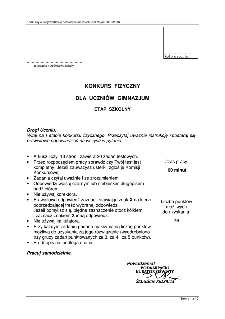 Konkursy w województwie podkarpackim w roku szkolnym 2005/2006 .................................... kod pracy ucznia ............................................. pieczątka nagłówkowa szkoły KONKURS FIZYCZNY DLA UCZNIÓW GIMNAZJUM ETAP SZKOLNY Drogi Uczniu, Witaj na I etapie konkursu fizycznego. Przeczytaj uważnie instrukcję i postaraj się prawidłowo odpowiedzieć na wszystkie pytania. • • • • • • • • • Arkusz liczy 10 stron i zawiera 20 zadań testowych. Przed rozpoczęciem pracy sprawdź czy Twój test jest kompletny. Jeżeli zauważysz usterki, zgłoś je Komisji Konkursowej. Zadania czytaj uważnie i ze zrozumieniem. Odpowiedzi wpisuj czarnym lub niebieskim długopisem bądź piórem. Nie używaj korektora. Prawidłową odpowiedź zaznacz stawiając znak X na literze poprzedzającej treść wybranej odpowiedzi. Jeżeli pomylisz się, błędne zaznaczenie otocz kółkiem i zaznacz znakiem X inną odpowiedź. Nie używaj kalkulatora. Przy każdym zadaniu podano maksymalną liczbę punktów możliwą do uzyskania za jego rozwiązanie (wyodrębniono trzy grupy zadań punktowanych za 3, za 4 i za 5 punktów). Brudnopis nie podlega ocenie. Czas pracy: 60 minut Liczba punktów możliwych do uzyskania: 79 Pracuj samodzielnie. Powodzenia! Strona 1 z 10 Konkursy w województwie podkarpackim w roku szkolnym 2005/2006 KONKURS FIZYCZNY – ETAP I ZADANIA ZA TRZY PUNKTY Zadanie 1. (0-3 pkt.) Po Nilu płynie łódź, częściowo zanurzona w wodzie. Jak zmieni się siła wyporu działająca na łódź, jeśli ta wypłynie na Morze Śródziemne ? A. Zmniejszy się B. Zwiększy się C. Nie zmieni się D. W wodzie słodkiej się zmniejszy, w słonej zwiększy E. W wodzie słodkiej się zwiększy, w słonej zmniejszy Zadanie 2. (0-3 pkt.) km . Mija go z przeciwka, długa na 150 m h km kolumna ciężarówek jadąca z szybkością 48 . Jak długo trwa mijanie? h A. 5 s. Motocyklista jedzie z szybkością 60 B. 10 s. C. 15 s. D. 20 s. E. 25 s. Zadanie 3. (0-3 pkt.) W płaszczyźnie poziomej obraca się jednostajnie, uwiązany na sznurku kamień. Jak zmieni się wartość siły dośrodkowej utrzymującej kamień w ruchu, jeżeli wartość prędkości liniowej wzrośnie 2 razy? A. Wzrośnie 2 razy B. Zmaleje 2 razy C. Zmaleje 4 razy D. Wzrośnie 4 razy E. Nie zmieni się Strona 2 z 10 Konkursy w województwie podkarpackim w roku szkolnym 2005/2006 Zadanie 4. (0-3 pkt.) Energia cieplna z rozgrzanego kaloryfera nagrzewa pokój głównie dzięki zjawisku: A. Przewodnictwa B. Dyfrakcji C. Dyspersji D. Konwekcji E. Promieniowania Zadanie 5. (0-3 pkt.) kg pływa przedmiot, którego stosunek m3 objętości części wynurzonej do objętości części zanurzonej wynosi 1. Gęstość W wodzie, której gęstość wynosi 1000 średnia przedmiotu wynosi: g cm 3 g C. 0,5 3 cm kg E. 200 3 m g cm 3 kg D. 50 3 m A. 50 B. 1 Zadanie 6. (0-3 pkt.) Powierzchnia małego tłoka w prasie hydraulicznej jest 6 razy mniejsza niż powierzchnia dużego. Jeżeli na ciecz wywrzemy pierwszym (małym) tłokiem parcie F1 , to ta ciecz wywrze na drugi tłok: A. Parcie F2 = F1, ciśnienie p2 = p1 B. Parcie F2 = 6 F1, ciśnienie p2 = p1 C. Parcie F2 = F1, ciśnienie p2 = 6 p1 D. Parcie F2 = 1/6 F1, ciśnienie p2 = p1 E. Parcie F2 = F1, ciśnienie p2 = 1/6 p1 F1 olej p1 S1 p2 S2 Strona 3 z 10 Konkursy w województwie podkarpackim w roku szkolnym 2005/2006 Zadanie 7. (0-3 pkt.) Sowa, której energia potencjalna ciężkości zależy od wysokości, tak jak obrazuje wykres (przyjmij g = 10 m ) ma masę: s2 A. 1 kg E p (J) B. 1,2 kg 60 C. 1,3 kg D. 1,4 kg 1 2 3 4 h ( m) E. 1,5 kg. ZADANIA ZA CZTERY PUNKTY Zadanie 8. (0-4 pkt.) Szeroką deskę o długości 6 m podparto z jednego końca na wysokości 2 m od podłoża i wciągano po niej szafę o masie 150 kg. Szafę wciągano po desce ruchem jednostajnym (tarcie pominąć, zaś g = 10 A. 50 N B. 0,5 kN m ) siłą: s2 C. 50 kN D. 150 N E. 1500 N Zadanie 9. (0-4 pkt.) Na każdym wykresie brakuje oznaczenia jednej osi. Wykres 1 Wykres 2 6 6 24 m/s 1 2 24 J 3 4 t (s) 1 2 3 4 s(m) A. Na 1. v (m/s). Na 2. F (N) B. Na 1. a (m/s2). Na 2. P (W) C. Na 1. s (m). Na 2. F (N) D. Na 1. a (m/s2) Na 2. F (N) E. Na 1. p (kg . m/s). Na 2. Ek (J) Strona 4 z 10 Konkursy w województwie podkarpackim w roku szkolnym 2005/2006 Zadanie 10. (0-4 pkt.) Po drewnianej platformie samochodu ciężarowego przesuwane jest ruchem jednostajnym pianino o masie 90 kg. Współczynnik tarcia dla substancji trących o siebie wynosi µ = 0,2. Przyjmując wartość przyśpieszenia ziemskiego g = 10 m s2 można obliczyć, że siła tarcia przeszkadzająca ruchowi wynosi: A. 1800 N B. 0,018 kN C. 0,18 kN D. 0,000018 MN E. 18 hN Zadanie 11. (0-4 pkt.) Na pudło (jak na rysunku) działają w płaszczyźnie poziomej dwie siły o wartościach F1 = 3 . 102 N i F2 = 4 . 102 N tak, że zaczęło się poruszać z przyspieszeniem a = 10 m/s2 (opory ruchu pominąć). Masa pudła wynosi: A. 500 g F2 B. 5 kg C. 50 000 g F1 D. 55 kg E. 0,5 t Zadanie 12. (0-4 pkt.) Siła F1 = 6N nadaje określone przyśpieszenie układowi klocków połączonym nieważką nitką. Przyspieszenie z jakim poruszają się klocki, oraz wartość siły F2 działającej na klocek o masie m2, przy założeniu, że pomijamy opory ruchu, wynoszą odpowiednio: 2,5 kg m2 F2 0,5 kg F1 = 6N m1 1 m , F2 = 4 N 2 s2 m a = 1 2 , F2 = 3 N s m a = 1,5 2 , F2 = 2N s m a = 2 2 , F2 = 1N s m a = 2 2 , F2 = 5 N s A. a = B. C. D. E. Strona 5 z 10 Konkursy w województwie podkarpackim w roku szkolnym 2005/2006 Zadanie 13. (0-4 pkt.) Pociąg ruszył z miejsca ruchem jednostajnie przyspieszonym prostoliniowym i w ciągu pierwszej sekundy przebył 3 m drogi. Po trzech sekundach ruchu i w trzeciej sekundzie ruchu przebędzie odpowiednio drogi: A. 6m i 9 m B. 9m i 6m C. 27m i 9m D. 27m i 15m E. 15m i 9 m Zadanie 14. (0-4 pkt.) Oblicz z jakim przyspieszeniem będzie spadać cegła o masie M = 1,5 kg uwiązana do nierozciągliwej liny zawieszonej na bloczku, jeśli do drugiego koń