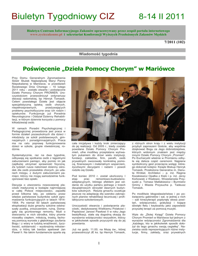 Biuletyn Tygodniowy CIZ 8-14 II 2011 Biuletyn Centrum Informacyjnego Zakonów opracowywany przez zespół portalu internetowego www.zyciezakonne.pl i sekretariat Konferencji Wyższych Przełożonych Zakonów Męskich 7/2011 (102) Wiadomość tygodnia Poświęcenie „Dzieła Pomocy Chorym” w Mariówce Przy Domu Generalnym Zgromadzenia Sióstr Służek Najświętszej Maryi Panny Niepokalanej w Mariówce, w przeddzień Światowego Dnia Chorego – 10 lutego 2011 roku - zostało otwarte i poświęcone Dzieło Pomocy Chorym PROMIEŃ. Uroczystościom przewodniczył ordynariusz diecezji radomskiej, bp Henryk Tomasik. Celem powstałego Dzieła jest objęcie specjalistyczną opieką osób chorych, niepełnosprawnych, przeżywających problemy psychofizyczne oraz ich rodzin i opiekunów. Funkcjonuje już Poradnia Neurologiczna i Oddział Dzienny Rehabilitacji, w którym dziennie korzysta z pomocy kilkadziesiąt osób. W ramach Poradni Psychologicznej i Pedagogicznej prowadzona jest praca w formie działań pozaszkolnych dla dzieci i młodzieży ze szkół podstawowych, gimnazjalnych i ponadgimnazjalnych. Praca ma na celu poprawę funkcjonowania dzieci w szkole, grupie rówieśniczej, rodzinie. Systematycznie, raz na dwa tygodnie, odbywają się spotkania osób z łagodnymi zaburzeniami pamięci, aby pomóc im jak najdłużej utrzymać sprawność fizyczną. Za tydzień rusza natomiast dzienny ośrodek dla osób przewlekle chorych, po udarach mózgu, z dużymi zaburzeniami pamięci, którzy nie mogą samodzielnie funkcjonować bez opieki. Decyzja o utworzeniu nowoczesnej placówki medycznej w bodajże najmniejszej w całej Polsce miejscowości, zapadła przed kilkoma laty, po oddaniu przez władze państwowe budynków szkół zgromadzenia funkcjonujących w latach 19141954. Po niemal 50 latach państwowej eksploatacji duże gmachy szkolne odstraszały pustką, zniszczeniem, ruiną. Domagały się gruntownego remontu. Myśl o stworzeniu w nich ośrodka, który promie niowałby ciepłem, miłością, troską, fachową pomocą wyrosła z głębokiego zaufania Bogu i z wiary w ludzką wrażliwość, życzliwość, solidarność – wyobraźnię miłosierdzia, o którą tak bardzo apelował Jan Paweł II. Na takim fundamencie oparła się cała inicjatywa i każdy krok zmierzający do jej realizacji. Od 2005 r., kiedy zostało powołane Działo Pomocy Chorym Promień, ufne modlitwy przeplatane wytrwałym pukaniem do drzwi wielu instytucji, fundacji, zakładów, firm, parafii, osób prywatnych owocowały konkretną pomocą, finansowym i materialnym wsparciem, życzliwymi decyzjami i radami i powoli rodziło się Dzieło. Pod koniec 2010 r. został ukończony I etap prac remontowo-budowlanoadaptacyjnych, którego efektem jest oddanie do użytku parteru jednego z trzech dwupiętrowych skrzydeł dawnych budynków szkolnych. Reszta gmachu oczekuje jeszcze na adaptację dla szeroko zakrojonych planów rehabilitacji leczniczej i profilaktyczno-szkoleniowych. Uroczystość otwarcia i poświęcenia placówki, dedykowanej Wielkiemu Polakowi i Papieżowi Janowi Pawłowi II w roku Jego beatyfikacji, stała się dogodną okazją do wyrażenia wdzięczności wszystkim, którzy w jakikolwiek sposób przyczynili się do jej powstania. Już na godz. 11.00, na Mszę św., której przewodniczył JE ks. bp Henryk Tomasik, 1 z różnych stron kraju i z wielu instytucji przybyli zaproszeni Goście, aby wspólnie dziękować Bogu za Jego dobrodziejstwa, których widomym znakiem jest między innymi Dzieło Pomocy Chorym „Promień”. Po Eucharystii właśnie w Promieniu odbyła się dalsza część ceremonii. Najpierw symboliczny gest przecięcia wstęgi, którego dokonali kolejno: Ksiądz Biskup Henryk Tomasik, Przełożona Generalna m. Danuta Wróbel, Architekci – p. inż. Regina Kozakiewicz Opałka z Kielc i p. inż. Jerzy Korkowski z Wadowic, Wicestarosta Przysuski p. Tomasz Matlakiewicz i Burmistrz Gminy i Miasta Przysucha p. Tadeusz Tomasik. Po modlitwie błogosławieństwa i po poświęceniu gabinetów i sal, w jednej z nich – sali kinezyterapii popłynęły słowa powitań, wdzięczności, gratulacji i kojące dźwięki fletu i keyboardu jako zapowiedź przyszłej terapii za pomocą muzyki. Wpis do „Złotej Księgi” Dzieła Pomocy Chorym Promień w Mariówce był jednym z wyrazów wdzięczności Zgromadzenia dla „każdego, kto w jakikolwiek sposób dołożył do tego gmachu swoją cegiełkę”. Nazwiska osób reprezentujących różne instytucje, firmy, zakłady, oraz prywatnych Darczyńców zapisane zostały na kolejnych kartach ku wdzięcznej pamięci potomnych. Słowa, którymi Przełożona Generalna m. Danuta Wróbel zakończyła swoje wystąpienie wyraźnie podkreślają, że choć wiele udało się dokonać, to jeszcze więcej jest przed nami. „Zgromadzenie, nawiązując do swoich tradycji, nazwało to miejsce PROMIEŃ. Oby Pan sprawił, aby każdy przekraczający próg tego domu wychodził rozpromieniony - nie tylko nadzieją na lepsze zdrowie fizyczne i psychiczne, ale przede wszystkim doświadczoną miłością, która rodzi się z Boga i jest najlepszym środkiem medycznym na wszystkie choroby człowieka. Pełni tej miłości życzę serdecznie (…) wszystkim, którzy nadal będą to dzieło wspierać, dotować, tworzyć, poszerzać, kontynuować. Szczęść Boże!” wsparcie, i dlatego do tych rekolekcji przywiązujemy dużą wagę, i robimy wszystko, żeby wyjechać stąd z większym bagażem doświadczeń, aby wracając do parafii wyrażać to, co najlepsze, co tutaj wobec opinii innych wydało zamierzone efekty" tłumaczy ks. Marian Haczyk z Sędziszowa. o. Stanisław Tomoń Za: www.jasnagora.com powiedział w wywiadzie na żywo: Pallotti wykorzystywał to co miał. Wykorzystywał druk, książki. My wykorzystujemy środki masowego przekazu, które są dzisiaj po pierwsze bardzo łatwo dostępne, po drugie są to środki, które bardzo mocno wpływają na wszystkich ludzi. Studio radio