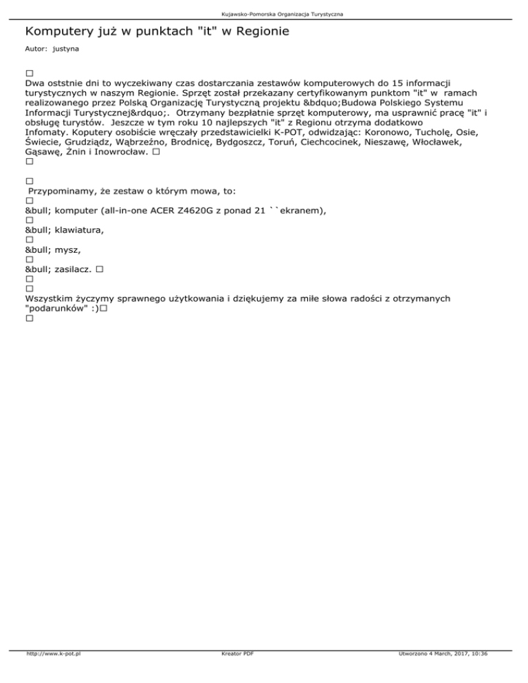Kujawsko-Pomorska Organizacja Turystyczna Komputery już w punktach "it" w Regionie Autor: justyna Dwa oststnie dni to wyczekiwany czas dostarczania zestawów komputerowych do 15 informacji turystycznych w naszym Regionie. Sprzęt został przekazany certyfikowanym punktom "it" w ramach realizowanego przez Polską Organizację Turystyczną projektu „Budowa Polskiego Systemu Informacji Turystycznej”. Otrzymany bezpłatnie sprzęt komputerowy, ma usprawnić pracę "it" i obsługę turystów. Jeszcze w tym roku 10 najlepszych "it" z Regionu otrzyma dodatkowo Infomaty. Koputery osobiście wręczały przedstawicielki K-POT, odwidzając: Koronowo, Tucholę, Osie, Świecie, Grudziądz, Wąbrzeźno, Brodnicę, Bydgoszcz, Toruń, Ciechcocinek, Nieszawę, Włocławek, Gąsawę, Żnin i Inowrocław. Przypominamy, że zestaw o którym mowa, to: • komputer (all-in-one ACER Z4620G z ponad 21 ``ekranem), • klawiatura, • mysz, • zasilacz. Wszystkim życzymy sprawnego użytkowania i dziękujemy za miłe słowa radości z otrzymanych "podarunków" :) http://www.k-pot.pl Kreator PDF Utworzono 4 March, 2017, 10:36