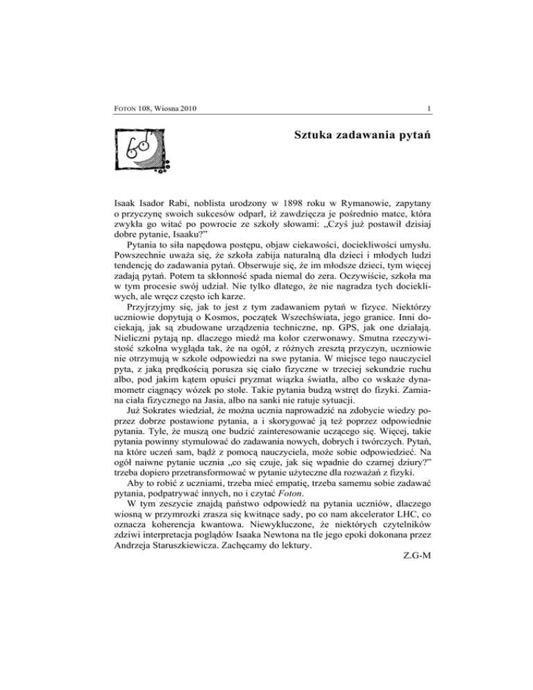 FOTON 108, Wiosna 2010 1 Sztuka zadawania pytań Isaak Isador Rabi, noblista urodzony w 1898 roku w Rymanowie, zapytany o przyczynę swoich sukcesów odparł, iż zawdzięcza je pośrednio matce, która zwykła go witać po powrocie ze szkoły słowami: „Czyś już postawił dzisiaj dobre pytanie, Isaaku?” Pytania to siła napędowa postępu, objaw ciekawości, dociekliwości umysłu. Powszechnie uważa się, że szkoła zabija naturalną dla dzieci i młodych ludzi tendencję do zadawania pytań. Obserwuje się, że im młodsze dzieci, tym więcej zadają pytań. Potem ta skłonność spada niemal do zera. Oczywiście, szkoła ma w tym procesie swój udział. Nie tylko dlatego, że nie nagradza tych dociekliwych, ale wręcz często ich karze. Przyjrzyjmy się, jak to jest z tym zadawaniem pytań w fizyce. Niektórzy uczniowie dopytują o Kosmos, początek Wszechświata, jego granice. Inni dociekają, jak są zbudowane urządzenia techniczne, np. GPS, jak one działają. Nieliczni pytają np. dlaczego miedź ma kolor czerwonawy. Smutna rzeczywistość szkolna wygląda tak, że na ogół, z różnych zresztą przyczyn, uczniowie nie otrzymują w szkole odpowiedzi na swe pytania. W miejsce tego nauczyciel pyta, z jaką prędkością porusza się ciało fizyczne w trzeciej sekundzie ruchu albo, pod jakim kątem opuści pryzmat wiązka światła, albo co wskaże dynamometr ciągnący wózek po stole. Takie pytania budzą wstręt do fizyki. Zamiana ciała fizycznego na Jasia, albo na sanki nie ratuje sytuacji. Już Sokrates wiedział, że można ucznia naprowadzić na zdobycie wiedzy poprzez dobrze postawione pytania, a i skorygować ją też poprzez odpowiednie pytania. Tyle, że muszą one budzić zainteresowanie uczącego się. Więcej, takie pytania powinny stymulować do zadawania nowych, dobrych i twórczych. Pytań, na które uczeń sam, bądź z pomocą nauczyciela, może sobie odpowiedzieć. Na ogół naiwne pytanie ucznia „co się czuje, jak się wpadnie do czarnej dziury?” trzeba dopiero przetransformować w pytanie użyteczne dla rozważań z fizyki. Aby to robić z uczniami, trzeba mieć empatię, trzeba samemu sobie zadawać pytania, podpatrywać innych, no i czytać Foton. W tym zeszycie znajdą państwo odpowiedź na pytania uczniów, dlaczego wiosną w przymrozki zrasza się kwitnące sady, po co nam akcelerator LHC, co oznacza koherencja kwantowa. Niewykluczone, że niektórych czytelników zdziwi interpretacja poglądów Isaaka Newtona na tle jego epoki dokonana przez Andrzeja Staruszkiewicza. Zachęcamy do lektury. Z.G-M