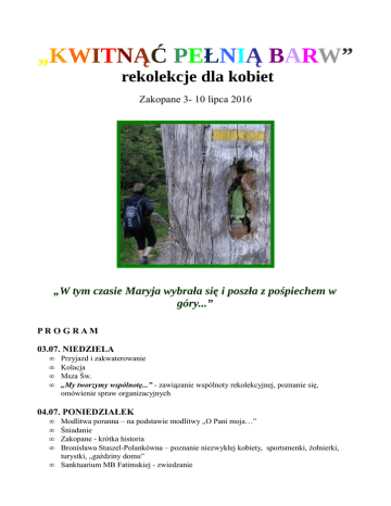„KWITNĄĆ PEŁNIĄ BARW” rekolekcje dla kobiet Zakopane 3- 10 lipca 2016 „W tym czasie Maryja wybrała się i poszła z pośpiechem w góry...” PROGRAM 03.07. NIEDZIELA • • • • Przyjazd i zakwaterowanie Kolacja Msza Św. „My tworzymy wspólnotę...” - zawiązanie wspólnoty rekolekcyjnej, poznanie się, omówienie spraw organizacyjnych 04.07. PONIEDZIAŁEK • • • • • Modlitwa poranna – na podstawie modlitwy „O Pani moja…” Śniadanie Zakopane - krótka historia Bronisława Staszel-Polankówna – poznanie niezwykłej kobiety, sportsmenki, żołnierki, turystki, „gaździny domu” Sanktuarium MB Fatimskiej - zwiedzanie • • • • Msza Św. Zakopane: Willa Koliba, Cmentarz na Pęksowym Brzysku, Muzeum Tatrzańskie, Kościół św. Rodziny, Gubałówka – wjazd lub spacer, kaplica MB nieustającej pomocy, widok na Tatry, kawa i lody, zjazd lub zejście Obiadokolacja Dyskusja na temat zadań i realiów życia współczesnej kobiety 05.07. WTOREK • • • • • • • Modlitwa poranna – na podstawie modlitwy „O Pani moja…” Śniadanie Sanktuarium Matki Bożej Królowej Tatr ODPUST – Wiktorówki, zwiedzanie sanktuarium, historia, Msza odpustowa g. 11.00 Spacer na Rusinową Polanę – z jednym z najpiękniejszych widoków na Tatry Obiadokolacja Liga Kobiet – historia, teraźniejszość, przyszłość (prezentacja - grupa bydgoska) Rozmowa 06.07. ŚRODA • • • 1) 2) • • • Modlitwa poranna – na podstawie modlitwy „O Pani moja…” Śniadanie Piękno Przyrody: Dolina Chochołowska- Schronisko na Polanie Chochołowskiej Dolina Chochołowska- Schronisko na Polanie Chochołowskiej – wejście na Grześ, Rakoń Obiadokolacja Msza Św. Medytacja o kobiecości i Adoracja w ciszy 07.07 CZWARTEK • • • Modlitwa poranna – na podstawie modlitwy „O Pani moja…” Śniadanie Piękno przyrody: 1) Dolina Kościeliska - Schronisko na hali Ornak 2) Dolina Małej Łąki -Giewont- Schronisko na hali Ornak • Obiadokolacja • Msza Św. • Kobiety w Ruchu Szensztackim (początki, wybitne postacie, wspólnoty-różne drogi) 08.07 PIĄTEK • • • Modlitwa poranna – na podstawie modlitwy „O Pani moja…” Śniadanie Piękno przyrody: 1) Morskie Oko- Schronisko – dla chętnych wariant „wyżej" • Obiadokolacja • Msza Św. • Geniusz kobiety w nauczaniu Kościoła 09.07 SOBOTA • • • • • • • Modlitwa poranna – na podstawie modlitwy „O Pani moja…” Śniadanie Kasprowy Wierch/ Wizyta u Św. Brata Alberta/ inne pomysły Podsumowanie, plany, refleksje :) Obiadokolacja Msza Św. Pogodny, choć pożegnalny wieczór… 10.07. NIEDZIELA • • • • Modlitwa poranna – na podstawie modlitwy „O Pani moja…” Śniadanie Msza Św. Wyjazd