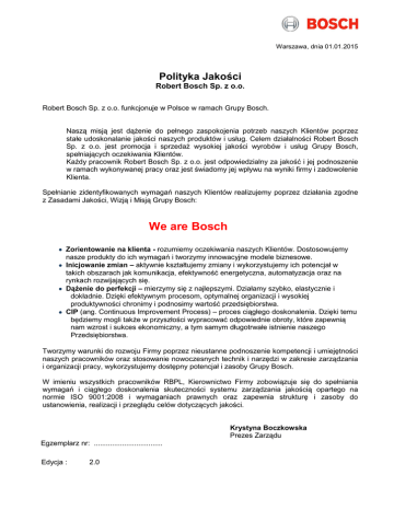 Warszawa, dnia 01.01.2015 Polityka Jakości Robert Bosch Sp. z o.o. Robert Bosch Sp. z o.o. funkcjonuje w Polsce w ramach Grupy Bosch. Naszą misją jest dążenie do pełnego zaspokojenia potrzeb naszych Klientów poprzez stałe udoskonalanie jakości naszych produktów i usług. Celem działalności Robert Bosch Sp. z o.o. jest promocja i sprzedaż wysokiej jakości wyrobów i usług Grupy Bosch, spełniających oczekiwania Klientów. Każdy pracownik Robert Bosch Sp. z o.o. jest odpowiedzialny za jakość i jej podnoszenie w ramach wykonywanej pracy oraz jest świadomy jej wpływu na wyniki firmy i zadowolenie Klienta. Spełnianie zidentyfikowanych wymagań naszych Klientów realizujemy poprzez działania zgodne z Zasadami Jakości, Wizją i Misją Grupy Bosch: We are Bosch Zorientowanie na klienta - rozumiemy oczekiwania naszych Klientów. Dostosowujemy nasze produkty do ich wymagań i tworzymy innowacyjne modele biznesowe. Inicjowanie zmian – aktywnie kształtujemy zmiany i wykorzystujemy ich potencjał w takich obszarach jak komunikacja, efektywność energetyczna, automatyzacja oraz na rynkach rozwijających się. Dążenie do perfekcji – mierzymy się z najlepszymi. Działamy szybko, elastycznie i dokładnie. Dzięki efektywnym procesom, optymalnej organizacji i wysokiej produktywności chronimy i podnosimy wartość przedsiębiorstwa. CIP (ang. Continuous Improvement Process) – proces ciągłego doskonalenia. Dzięki temu będziemy mogli także w przyszłości wypracować odpowiednie obroty, które zapewnią nam wzrost i sukces ekonomiczny, a tym samym długotrwałe istnienie naszego Przedsiębiorstwa. Tworzymy warunki do rozwoju Firmy poprzez nieustanne podnoszenie kompetencji i umiejętności naszych pracowników oraz stosowanie nowoczesnych technik i narzędzi w zakresie zarządzania i organizacji pracy, wykorzystujemy dostępny potencjał i zasoby Grupy Bosch. W imieniu wszystkich pracowników RBPL, Kierownictwo Firmy zobowiązuje się do spełniania wymagań i ciągłego doskonalenia skuteczności systemu zarządzania jakością opartego na normie ISO 9001:2008 i wymaganiach prawnych oraz zapewnia strukturę i zasoby do ustanowienia, realizacji i przeglądu celów dotyczących jakości. Krystyna Boczkowska Prezes Zarządu Egzemplarz nr: .................................. Edycja : 2.0