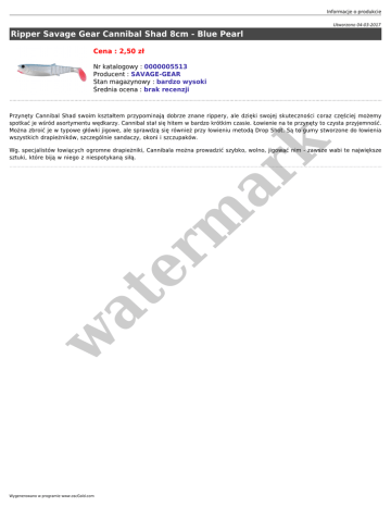 Informacje o produkcie Utworzono 04-03-2017 Ripper Savage Gear Cannibal Shad 8cm - Blue Pearl Cena : 2,50 zł Nr katalogowy : 0000005513 Producent : SAVAGE-GEAR Stan magazynowy : bardzo wysoki Średnia ocena : brak recenzji er m ar k Przynęty Cannibal Shad swoim kształtem przypominają dobrze znane rippery, ale dzięki swojej skuteczności coraz częściej możemy spotkać je wśród asortymentu wędkarzy. Cannibal stał się hitem w bardzo krótkim czasie. Łowienie na te przynęty to czysta przyjemność. Można zbroić je w typowe główki jigowe, ale sprawdzą się również przy łowieniu metodą Drop Shot. Są to gumy stworzone do łowienia wszystkich drapieżników, szczególnie sandaczy, okoni i szczupaków. w at Wg. specjalistów łowiących ogromne drapieżniki, Cannibala można prowadzić szybko, wolno, jigować nim - zawsze wabi te największe sztuki, które biją w niego z niespotykaną siłą. Wygenerowano w programie www.oscGold.com