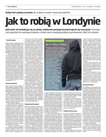 4 Temat tygodnia Głos Nauczycielski nr 21 20 maja 2015 www.glos.pl Każdy funt wydany na pomoc dla „trudnych uczniów” zwraca się trzykrotnie Jak to robią w Londynie Jeśli rodzic nie kontaktuje się ze szkołą, codziennie pod jego drzwiami zjawia się nauczyciel. Uczniowie zaczynają dzień od wspólnego śniadania, a szkoły razem rozwiązują problemy wychowawcze. Gdzie? W Londynie! Rząd Ewy Kopacz przyjął program walki z agresją w szkołach (szczegóły – ramka). Jego najważniejszą częścią jest instalowanie w szkołach monitoringu. Próżno w nim szukać rozwiązań, które z powodzeniem stosują inne kraje. A ich specjaliści chętnie dzielą się pomysłami z polskimi nauczycielami i dyrektorami. – Walka z agresją w szkole jest kluczowa generalnie dla jakości edukacji – zauważył prof. Jan Fazlagić z Akademii Finansów i Biznesu VISTULA w Warszawie podczas zorganizowanej przez tę uczelnię konferencji pt. „Skuteczne metody przeciwdziałania agresji w szkole” (15 maja br.). Do podzielenia się swoimi doświadczeniami zaproszono dwóch brytyjskich ekspertów – prof. Philipa Garnera z Uniwersytetu w Northampton i Davida Bartrama, eksperta ds. pracy z uczniami ze specjalnymi potrzebami edukacyjnymi i konsultanta rządu, jeśli chodzi o agresję w szkołach. Obaj ze szczegółami opowiadali, w jaki sposób obniżenie poziomu agresji u młodych ludzi wpłynęło na jakość kształcenia w londyńskich szkołach (wywiad z ekspertami – s. 5). Trzeba coś zmienić Jeszcze w 2003 r. Londyn uchodził za jedno z najgorszych miejsc do wychowywania dzieci w Wielkiej Brytanii – szkoły miały opinię placówek niebezpiecznych dla młodych ludzi, a poziom kształcenia – szczególnie w dzielnicach, gdzie mieszka uboższa, imigrancka część społeczeństwa – należał do najniższych w kraju. Powszechną opinię potwierdzały statystyki, w których londyńskie szkoły lądowały na końcu stawki, jeśli chodzi o poziom nauczania i na początku, gdy mówiono o poziomie agresji. Lokalne władze i rząd Wielkiej Brytanii doszli do wniosku, że trzeba coś w tej sprawie zrobić, szczególnie że londyńskie szkoły to znacząca część brytyjskiej oświaty – kształci się w nich 1,3 mln dzieci spośród 9 mln w całym kraju. Zarządzający stołeczną oświatą uznali jednocześnie, że nie da się podnieść jakości kształcenia bez wdrożenia skutecznego planu pomocy uczniom z najsłabszymi wynikami, uczniom ze specjalnymi potrzebami edukacyjnymi oraz tymi, którzy przejawiają destrukcyjne zachowania. W placówkach miejskich wdrożono specjalny program do walki z agresją. – W 2001 r. Londyn był najsłabszy w Wielkiej Brytanii pod względem wyników nauczania. W 2013 r. jest jednym z najlepszych. Londyn jest też regionem kraju o najlepszych efek- tach pracy wychowawczej z uczniami. A wszystko to w mieście, które dotykają najpoważniejsze problemy społeczne, np. ubóstwo – streścił efekty programu David Bertram, nauczyciel w Lampton School, szkoły, która jest przykładem tego, jak skutecznie można walczyć z agresją i poprawić w ten sposób efekty nauczania. Spośród 1420 uczniów co trzeci dostaje w szkole bezpłatny posiłek, co piąty jest dzieckiem ze specjalnymi potrzebami edukacyjnymi, a dla ok. 60 proc. angielski nie jest pierwszym językiem. – Jesteśmy jednocześnie jedną ze 100 najlepszych szkół, jeśli chodzi o postępy uczniów w nauce – pochwalił się Bertram. Londyński program opiera się na pięciu filarach: współpracy między szkołami i uczenia się od siebie nawzajem, elastycznych programach nauczania dostosowanych do potrzeb każdego ucznia, analizie i dotarciu do przyczyn złego zachowania poszczególnych uczniów, dobrej współpracy z rodzicami oraz na dyscyplinie w klasie. Gdy specjaliści uszeregowali szkoły o najlepszych i najgorszych wynikach oraz poziomie agresji, okazało się, że nie ma prostego przełożenia na zamożność danej społeczności. To znaczy – zarówno w zamożnych, jak i biednych dzielnicach były szkoły uczące świetnie i dużo gorzej. – Zaobserwowaliśmy znaczące zróżnicowanie – w środowisku o takim samym stopniu zamożności były bardzo różne szkoły. Zaczęliśmy się zastanawiać, co robią te najlepsze, czego nie robią te gorsze – tłumaczył David Bartram. Tak pojawił się pomysł, by pomóc szkołom w nawiązaniu współpracy i dzieleniu się doświadczeniami. W tym celu powołano specjalną instytucję, gdzie specjaliści – analizując środowisko funkcjonowania placówek – „kojarzyli” szkoły z sobą. Diagnozowanie agresji Eksperci zauważyli też, że poziom agresji u uczniów wzrasta nagle w wieku 11-12 lat, by znacząco spaść w wieku 16 lat. Skok agresji związany był przede wszystkim z przejściem uczniów ze szkoły podstawowej do gimnazjum, a co się z tym wiąże – ze zmianą środowiska, grupy rówieśniczej, przyjaciół. Najgorzej reagowały dzieci ze specjalnymi potrzebami edukacyjnymi. – Doszliśmy do wniosku, że kluczowe jest dostosowanie programów nauczania do konkretnych uczniów. Dlatego dbamy o to, by u dzieci w wieku 11 lat zidentyfikować specjalne potrzeby – relacjonował Bartram. W przeciętnej klasie na 24 uczniów, 15 uczy się według programów dostosowanych do ich potrzeb. Oznacza to, że 40 proc. zajęć, w których uczestniczą, Przede wszystkim w przełamaniu ich oporu w posyłaniu dzieci na zajęcia specjalne. – Ważna jest tu rozmowa z każdym z rodziców. Dziewięciu na dziesięciu udaje się przekonać. Pomagają w tym adwokaci zmian – rodzice dzieci, które taką pomoc już otrzymały – mówił ekspert. W przekonaniu rodziców pomogło pokazanie efektów pracy z dziećmi ze specjalnymi potrzebami edukacyjnymi – dlatego położono duży nacisk na pomiar postępów uczniów oraz nadzór ze strony kuratorium. Ale kuratorium rozlicza szkoły nie z tego, jak wypełniają biurokratyczne powinnoś
