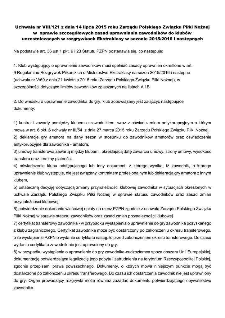 Uchwała nr VIII/121 z dnia 14 lipca 2015 roku Zarządu Polskiego Związku Piłki Nożnej w sprawie szczegółowych zasad uprawniania zawodników do klubów uczestniczących w rozgrywkach Ekstraklasy w sezonie 2015/2016 i następnych Na podstawie art. 36 ust.1 pkt. 9 i 23 Statutu PZPN postanawia się, co następuje: 1. Klub występujący o uprawnienie zawodników musi spełniać zasady uprawnień określone w art. 9 Regulaminu Rozgrywek Piłkarskich o Mistrzostwo Ekstraklasy na sezon 2015/2016 i następne (uchwała nr V/69 z dnia 21 kwietnia 2015 roku Zarządu Polskiego Związku Piłki Nożnej), w szczególności dotyczące limitów zawodników zgłaszanych na listach A i B. 2. Do wniosku o uprawnienie zawodnika do gry, klub zobowiązany jest załączyć następujące dokumenty: 1) kontrakt zawarty pomiędzy klubem a zawodnikiem, wraz z oświadczeniem antykorupcyjnym o którym mowa w art. 6 pkt. 6 uchwały nr III/54 z dnia 27 marca 2015 roku Zarządu Polskiego Związku Piłki Nożnej, 2) deklaracje gry amatora na dany sezon w stosunku do zawodników amatorów oraz oświadczenie antykorupcyjne dla zawodnika - amatora, 3) umowę transferową zawartą między klubami, określającą datę zawarcia umowy, strony umowy, wysokość transferu oraz terminy płatności, 4) oświadczenie klubu odstępującego lub inny dokument, z którego wynika, iż zawodnik, o którego uprawnienie klub występuje, nie jest związany kontraktem profesjonalnym lub deklaracją gry amatora z innym klubem, 5) ostateczną decyzję dotyczącą zmiany przynależności klubowej zawodnika w sytuacjach określonych w uchwale Zarządu Polskiego Związku Piłki Nożnej w sprawie statusu zawodników oraz zasad zmian przynależności klubowej, 6) potwierdzenie dokonania właściwej opłaty na rzecz PZPN zgodnie z uchwałą Zarządu Polskiego Związku Piłki Nożnej w sprawie statusu zawodników oraz zasad zmian przynależności klubowej 7) certyfikat transferowy zawodnika - w przypadku wystąpienia o uprawnienie do gry zawodnika pozyskanego z klubu zagranicznego. Certyfikat zawodnika może być dostarczony po zakończeniu okresu transferowego, o ile wystąpienie PZPN o wydanie certyfikatu nastąpiło przed zakończeniem okresu transferowego. Do czasu wydania certyfikatu zawodnik nie jest uprawniony do gry. 8) w przypadku wystąpienia o uprawnienie do gry zawodnika-cudzoziemca spoza obszaru Unii Europejskiej, dokumentację potwierdzającą legalizację jego pobytu i zatrudnienia na terytorium Rzeczypospolitej Polskiej, zgodnie przepisami prawa powszechnego. Dokumenty, o których mowa niniejszym punkcie mogą być dostarczone po zakończeniu okresu transferowego. Do czasu ich dostarczenia zawodnik nie jest uprawniony do gry. Organ prowadzący rozgrywki może również zażądać dokumentu potwierdzającego obywatelstwo zawodnika. 3. Oryginał kontraktu powinien być dostarczony przez klub do organu prowadzącego rozgrywki w terminie 7 (siedmiu) dni od daty jego zawarcia. Obowiązek powyższy dotyczy również wszelkich zmian w kontrakcie. Kontrakt powinien być dostarczony w zamkniętej kopercie wraz zwypełnionym formularzem podpisanym przez zawodnika oraz upoważnionego przedstawiciela klubu, według załącznika nr 1 do niniejszej uchwały. 4. Klub zobowiązany jest do dostarczenia kompletu dokumentów zawodników zgłoszonych uprzednio do jakichkolwiek innych rozgrywek krajowych niż prowadzone przez Ekstraklasę SA. Powyższe odnosi się w szczególności do umów transferowych/umów o czasowym zezwoleniu na grę w innym klubie lub innych dotyczących zawodników pozyskanych uprzednio do zespołów juniorskich. 5. Do rozgrywek Ekstraklasy mogą być uprawnieni wyłącznie zawodnicy zgłoszeni w systemie Extranet PZPN. 6. Potwierdzenie zawodnika do klubu przez właściwy Związek Piłki Nożnej oznacza, iż wszelkie informacje z zakresu zmiany przynależności klubowej i statusu zawodnika zawarte w systemie Extranet są prawdziwe, zainteresowany klub uiścił wszelkie stosowne opłaty na rzecz Związku Piłki Nożnej, a zawodnicy zostali prawidłowo wyrejestrowani z odpowiedniego związku piłki nożnej i prawidłowo potwierdzeni do gry w nowym klubie, chyba, że z dołączonej dokumentacji, sporządzonej przez związek piłki nożnej, wynika odmiennie. 7. Na żądanie organu prowadzącego rozgrywki, klub może być zobowiązany do przekazania dokumentów innych niż wymienione w ust. 2. 8. Organ prowadzący rozgrywki może wskazać terminy, określić warunki oraz sposób dostarczenia dokumentów przez klub. 9. Realizację uchwały powierza się związkom piłki nożnej i Ekstraklasie S.A. 10. Traci moc uchwała nr VI/97 Zarządu PZPN z dnia 19 kwietnia 2011 roku w sprawie szczegółowych zasad uprawniania zawodników do klubów uczestniczących w rozgrywkach Ekstraklasy w sezonie 2011/2012 i następnych. 10. Niniejsza Uchwała wchodzi w życie z dniem podjęcia, z mocą obowiązującą od dnia 1 lipca 2015 r. Prezes PZPN Zbigniew Boniek
