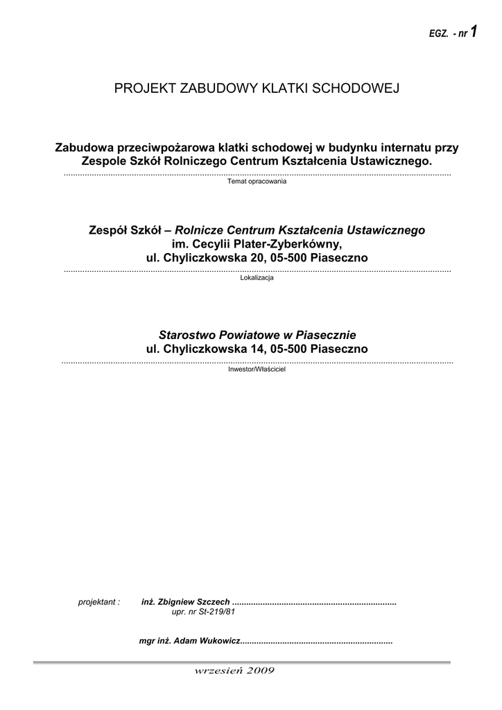 EGZ. - nr PROJEKT ZABUDOWY KLATKI SCHODOWEJ Zabudowa przeciwpożarowa klatki schodowej w budynku internatu przy Zespole Szkół Rolniczego Centrum Kształcenia Ustawicznego. ..................................................................................................................................................................... Temat opracowania Zespół Szkół – Rolnicze Centrum Kształcenia Ustawicznego im. Cecylii Plater-Zyberkówny, ul. Chyliczkowska 20, 05-500 Piaseczno ..................................................................................................................................................................... Lokalizacja Starostwo Powiatowe w Piasecznie ul. Chyliczkowska 14, 05-500 Piaseczno ....................................................................................................................................................................... Inwestor/Właściciel projektant : inż. Zbigniew Szczech ...................................................................... upr. nr St-219/81 mgr inż. Adam Wukowicz................................................................. wrzesień 2009 1 Inwestycja: Zabudowa przeciwpożarowa klatki schodowej Adres: Piaseczno, ul. Chyliczkowska 20 ZAWARTOŚĆ OPRACOWANIA OPIS TECHNICZNY............................................................................................................................................................. 2 1. 2. 3. 4. 5. 6. OPIS OGÓLNY............................................................................................................................................................ 2 PODSTAWA OPRACOWANIA ................................................................................................................................. 2 CEL OPRACOWANIA................................................................................................................................................ 2 OPIS ROZWIĄZAŃ BUDOWLANYCH. ................................................................................................................... 2 INSTALACJA WEWNĘTRZNA................................................................................................................................. 3 ZABEZPIECZENIE PRZECIWPOŻAROWE............................................................................................................. 3 Klasyfikacja pożarowa. .................................................................................................................................................... 3 Odległość od obiektów sąsiadujących.............................................................................................................................. 3 Parametry pożarowe występujących substancji palnych.................................................................................................. 3 Przewidywana gęstość obciążenia ogniowego. ................................................................................................................ 3 Zagrożenie wybuchem pomieszczeń i przestrzeni wewnętrznych. .................................................................................... 3 Podział obiektu na strefy pożarowe.................................................................................................................................. 4 Warunki ewakuacji, oznakowanie na potrzeby ewakuacji dróg ewakuacyjnych.............................................................. 4 Dobór urządzeń przeciwpożarowych w obiekcie.............................................................................................................. 4 Drogi pożarowe................................................................................................................................................................ 4 7. ZAŁĄCZNIKI – DOKUMENTY FORMALNO-PRAWNE........................................................................................ 4 PROJEKT – CZĘŚĆ GRAFICZNA..................................................................................................................................... 5 8. SPIS RYSUNKÓW............................................................................................................................................................ 5 Rys. A0. Rzut piwnicy - skala 1:100....................................................................................................................... 5 Rys. A1. Rzut parteru - skala 1:100 ...................................................................................................................... 5 Rys. A2. Rzut I piętra - skala 1:100 ...................................................................................................................... 5 Rys. A3. Rzut II piętra - skala 1:100 .................................................................................................................... 5 Rys. A4. Rzut poddasza - skala 1:100 ................................................................................................................... 5 Rys. A5. Elewacje południowo-zachodnia i północno-zachodnia - skala 1:100......................................................... 5 Rys. A6. Przekrój pionowy - skala 1:100 .............................................................................................................. 5 Rys. A7. Zestawienie stolarki drzwiowej - bez skali................................................................................................ 5 Rys. A8. Schemat klapy dymowej................................................................................................................................ 5 1 Inwestycja: Zabudowa przeciwpożarowa klatki schodowej Adres: Piaseczno, ul. Chyliczkowska 20 OPIS TECHNICZNY 1. OPIS OGÓLNY INWESTOR - Starostwo Powiatowe w Piasecznie , ul. Chyliczkowska 14, 05-500 Piaseczno OBIEKT - budynek internatu przy Zespole Szkół Rolniczych 