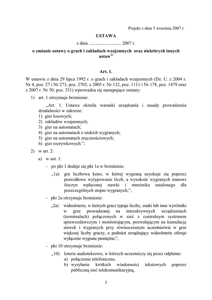 Projekt z dnia 5 września 2007 r. USTAWA z dnia ............................ 2007 r. o zmianie ustawy o grach i zakładach wzajemnych oraz niektórych innych ustaw1) Art. 1. W ustawie z dnia 29 lipca 1992 r. o grach i zakładach wzajemnych (Dz. U. z 2004 r. Nr 4, poz. 27 i Nr 273, poz. 2703, z 2005 r. Nr 132, poz. 1111 i Nr 178, poz. 1479 oraz z 2007 r. Nr 50, poz. 331) wprowadza się następujące zmiany: 1) art. 1 otrzymuje brzmienie: „Art. 1. Ustawa określa warunki urządzania i zasady prowadzenia działalności w zakresie: 1) gier losowych; 2) zakładów wzajemnych; 3) gier na automatach; 4) gier na automatach o niskich wygranych; 5) gier na automatach zręcznościowych; 6) gier rozrywkowych.”; 2) w art. 2: a) w ust. 1: - po pkt 1 dodaje się pkt 1a w brzmieniu: „1a) gra liczbowa keno, w której wygraną uzyskuje się poprzez prawidłowe wytypowanie liczb, a wysokość wygranych stanowi iloczyn wpłaconej stawki i mnoŜnika ustalonego dla poszczególnych stopni wygranych;”, - pkt 2a otrzymuje brzmienie: „2a) wideoloterie, w których gracz typuje liczby, znaki lub inne wyróŜniki w grze prowadzonej na interaktywnych urządzeniach (terminalach) połączonych w sieć z centralnym systemem sprawozdawczym i monitorującym, pozwalającym na kumulację stawek i wygranych przy równoczesnym uczestnictwie w grze większej liczby graczy, a podmiot urządzający wideoloterie oferuje wyłącznie wygrane pienięŜne;”, - pkt 10 otrzymuje brzmienie: „10) loterie audioteksowe, w których uczestniczy się przez odpłatne: a) połączenie telefoniczne, b) wysyłanie krótkich wiadomości tekstowych poprzez publiczną sieć telekomunikacyjną, 1 a podmiot urządzający loterię oferuje wygrane pienięŜne lub rzeczowe.”, b) ust. 2a i 2b otrzymują brzmienie: „2a. Grami na automatach są gry na urządzeniach mechanicznych, elektromechanicznych i elektronicznych o wygrane pienięŜne lub rzeczowe. 2b. Grami na automatach o niskich wygranych są gry na urządzeniach mechanicznych, elektromechanicznych i elektronicznych o wygrane pienięŜne lub rzeczowe, w których wartość jednorazowej wygranej nie moŜe być wyŜsza niŜ równowartość 15 euro, a wartość maksymalnej stawki za udział w jednej grze nie moŜe być wyŜsza niŜ 0,07 euro. Równowartość 15 euro i 0,07 euro ustala się według kursu kupna, ogłaszanego przez Narodowy Bank Polski, z dnia 1 grudnia poprzedniego roku kalendarzowego. JeŜeli zmiana kursu euro powoduje konieczność zmiany w oprogramowaniu automatów o niskich wygranych z uwagi na zmianę wartości jednorazowej wygranej oraz wartości maksymalnej stawki za udział w jednej grze, podmiot urządzający i prowadzący działalność w zakresie gier na automatach o niskich wygranych ma obowiązek dostosować wartość tych stawek oraz wygranych w terminie nie dłuŜszym niŜ 60 dni.”, c) po ust. 2b dodaje się ust. 2c – 2e w brzmieniu: „2c. Grami na automatach zręcznościowych, zwanymi dalej „grami zręcznościowymi”, są gry na urządzeniach mechanicznych, elektromechanicznych i elektronicznych, w których moŜliwość uzyskania wygranej zaleŜy tylko i wyłącznie od zręczności grającego, a sama gra nie zawiera Ŝadnych pośrednich lub bezpośrednich elementów losowych. 2d. Grami rozrywkowymi są gry na urządzeniach mechanicznych, elektromechanicznych i elektronicznych, w których grający nie ma moŜliwości uzyskania wygranej pienięŜnej lub rzeczowej, urządzane w celach zarobkowych. Gry rozrywkowe mogą zawierać lub nie zawierać pośrednie lub bezpośrednie elementy losowe. 2e. Pod pojęciem „wygranej rzeczowej” naleŜy rozumieć równieŜ wygraną w postaci moŜliwości przedłuŜenia gry bez konieczności wpłaty stawki.”, d) ust. 3 otrzymuje brzmienie: „3. Minister właściwy do spraw finansów publicznych rozstrzyga, w drodze decyzji, czy gra, zakład (przedsięwzięcie, działalność) posiadające cechy wymienione w ust. 1 – 2d, jest grą losową, zakładem wzajemnym, grą na automacie, grą na automacie o niskich wygranych, grą zręcznościową albo grą rozrywkową w rozumieniu ustawy.”, e) po ust. 3 dodaje się ust. 3a i 3b w brzmieniu: 2 „3a. Do wniosku o wydanie rozstrzygnięcia, o którym mowa w ust. 3, strona jest obowiązana przedstawić opis planowanego albo realizowanego przedsięwzięcia zawierający w szczególności zasady jego urządzania, przewidywane nagrody, sposób wyłaniania zwycięzców oraz, w przypadku gry na automatach lub gry na automatach o niskich wygranych, badanie techniczne danego automatu. Przepis ten stosuje się odpowiednio do postępowania prowadzonego z urzędu. 3b. W wypadku gdy zebrany w sprawie materiał dowodowy nie jest wystarczający do podjęcia rozstrzygnięcia, o którym mowa w ust. 3, minister właściwy do spraw finansów publicznych odmawia, w drodze decyzji, wydania rozstrzygnięcia.”; 3) art. 3 otrzymuje brzmienie: „Art. 3. Urządzanie i prowadzenie działalności w zakresie gier i zakładów wzajemnych, o których mowa w art. 2, jest dozwolone wyłącznie na zasadach określonych w ustawie.”; 4) po art. 3 dodaje się art. 3a w brzmieniu: „Art. 3a. 1. Urządzanie i prowadzenie w sieci Internet gier i zakładów wzajemnych, o których mowa w art. 2 ust. 1 – 2b, zwanych dalej „grami internetowymi”, jest zakazane. 2. Przez sieć Internet rozumie się globalną, ogólnoświatową, dostępną publicznie sieć komputerową wykorzystującą róŜne protokoły komunikacyjne do wymiany danych.”; 5) w art. 4: a) ust. 1 otrzymuje brzmienie: „1. Monopol Państwa stanowi prowadzenie działalności w zakresie gier liczbowych, w tym gry liczbowej keno, loterii pienięŜnych, wideoloterii i gry telebingo.”, b) uchyla się ust. 4; 6) po art. 6 dodaje się art. 6a w brzmieniu: „Art. 6a. Gry zręcznościowe oraz gry rozrywkowe mogą być urządzane przez osoby fizyczne, osoby prawne lub jednostki organizacyjne niemające osobowości prawnej na podstawie zgłosz