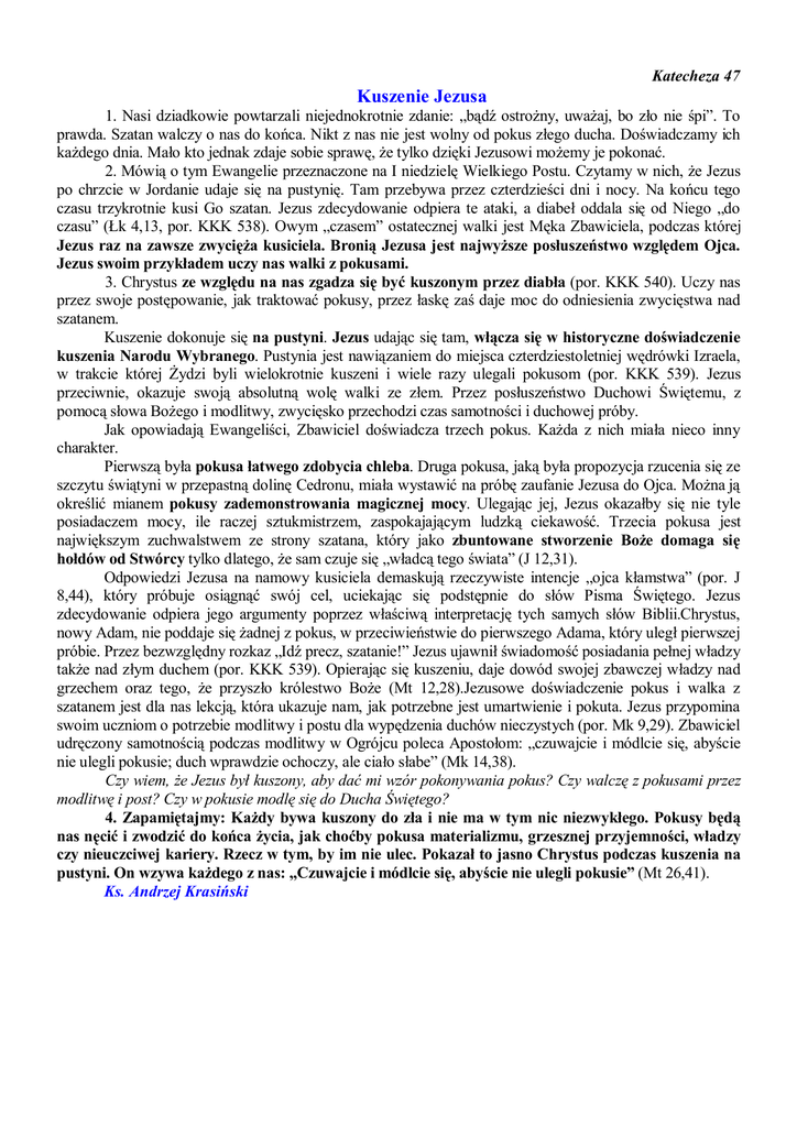 Katecheza 47 Kuszenie Jezusa 1. Nasi dziadkowie powtarzali niejednokrotnie zdanie: „bądź ostrożny, uważaj, bo zło nie śpi”. To prawda. Szatan walczy o nas do końca. Nikt z nas nie jest wolny od pokus złego ducha. Doświadczamy ich każdego dnia. Mało kto jednak zdaje sobie sprawę, że tylko dzięki Jezusowi możemy je pokonać. 2. Mówią o tym Ewangelie przeznaczone na I niedzielę Wielkiego Postu. Czytamy w nich, że Jezus po chrzcie w Jordanie udaje się na pustynię. Tam przebywa przez czterdzieści dni i nocy. Na końcu tego czasu trzykrotnie kusi Go szatan. Jezus zdecydowanie odpiera te ataki, a diabeł oddala się od Niego „do czasu” (Łk 4,13, por. KKK 538). Owym „czasem” ostatecznej walki jest Męka Zbawiciela, podczas której Jezus raz na zawsze zwycięża kusiciela. Bronią Jezusa jest najwyższe posłuszeństwo względem Ojca. Jezus swoim przykładem uczy nas walki z pokusami. 3. Chrystus ze względu na nas zgadza się być kuszonym przez diabła (por. KKK 540). Uczy nas przez swoje postępowanie, jak traktować pokusy, przez łaskę zaś daje moc do odniesienia zwycięstwa nad szatanem. Kuszenie dokonuje się na pustyni. Jezus udając się tam, włącza się w historyczne doświadczenie kuszenia Narodu Wybranego. Pustynia jest nawiązaniem do miejsca czterdziestoletniej wędrówki Izraela, w trakcie której Żydzi byli wielokrotnie kuszeni i wiele razy ulegali pokusom (por. KKK 539). Jezus przeciwnie, okazuje swoją absolutną wolę walki ze złem. Przez posłuszeństwo Duchowi Świętemu, z pomocą słowa Bożego i modlitwy, zwycięsko przechodzi czas samotności i duchowej próby. Jak opowiadają Ewangeliści, Zbawiciel doświadcza trzech pokus. Każda z nich miała nieco inny charakter. Pierwszą była pokusa łatwego zdobycia chleba. Druga pokusa, jaką była propozycja rzucenia się ze szczytu świątyni w przepastną dolinę Cedronu, miała wystawić na próbę zaufanie Jezusa do Ojca. Można ją określić mianem pokusy zademonstrowania magicznej mocy. Ulegając jej, Jezus okazałby się nie tyle posiadaczem mocy, ile raczej sztukmistrzem, zaspokajającym ludzką ciekawość. Trzecia pokusa jest największym zuchwalstwem ze strony szatana, który jako zbuntowane stworzenie Boże domaga się hołdów od Stwórcy tylko dlatego, że sam czuje się „władcą tego świata” (J 12,31). Odpowiedzi Jezusa na namowy kusiciela demaskują rzeczywiste intencje „ojca kłamstwa” (por. J 8,44), który próbuje osiągnąć swój cel, uciekając się podstępnie do słów Pisma Świętego. Jezus zdecydowanie odpiera jego argumenty poprzez właściwą interpretację tych samych słów Biblii.Chrystus, nowy Adam, nie poddaje się żadnej z pokus, w przeciwieństwie do pierwszego Adama, który uległ pierwszej próbie. Przez bezwzględny rozkaz „Idź precz, szatanie!” Jezus ujawnił świadomość posiadania pełnej władzy także nad złym duchem (por. KKK 539). Opierając się kuszeniu, daje dowód swojej zbawczej władzy nad grzechem oraz tego, że przyszło królestwo Boże (Mt 12,28).Jezusowe doświadczenie pokus i walka z szatanem jest dla nas lekcją, która ukazuje nam, jak potrzebne jest umartwienie i pokuta. Jezus przypomina swoim uczniom o potrzebie modlitwy i postu dla wypędzenia duchów nieczystych (por. Mk 9,29). Zbawiciel udręczony samotnością podczas modlitwy w Ogrójcu poleca Apostołom: „czuwajcie i módlcie się, abyście nie ulegli pokusie; duch wprawdzie ochoczy, ale ciało słabe” (Mk 14,38). Czy wiem, że Jezus był kuszony, aby dać mi wzór pokonywania pokus? Czy walczę z pokusami przez modlitwę i post? Czy w pokusie modlę się do Ducha Świętego? 4. Zapamiętajmy: Każdy bywa kuszony do zła i nie ma w tym nic niezwykłego. Pokusy będą nas nęcić i zwodzić do końca życia, jak choćby pokusa materializmu, grzesznej przyjemności, władzy czy nieuczciwej kariery. Rzecz w tym, by im nie ulec. Pokazał to jasno Chrystus podczas kuszenia na pustyni. On wzywa każdego z nas: „Czuwajcie i módlcie się, abyście nie ulegli pokusie” (Mt 26,41). Ks. Andrzej Krasiński