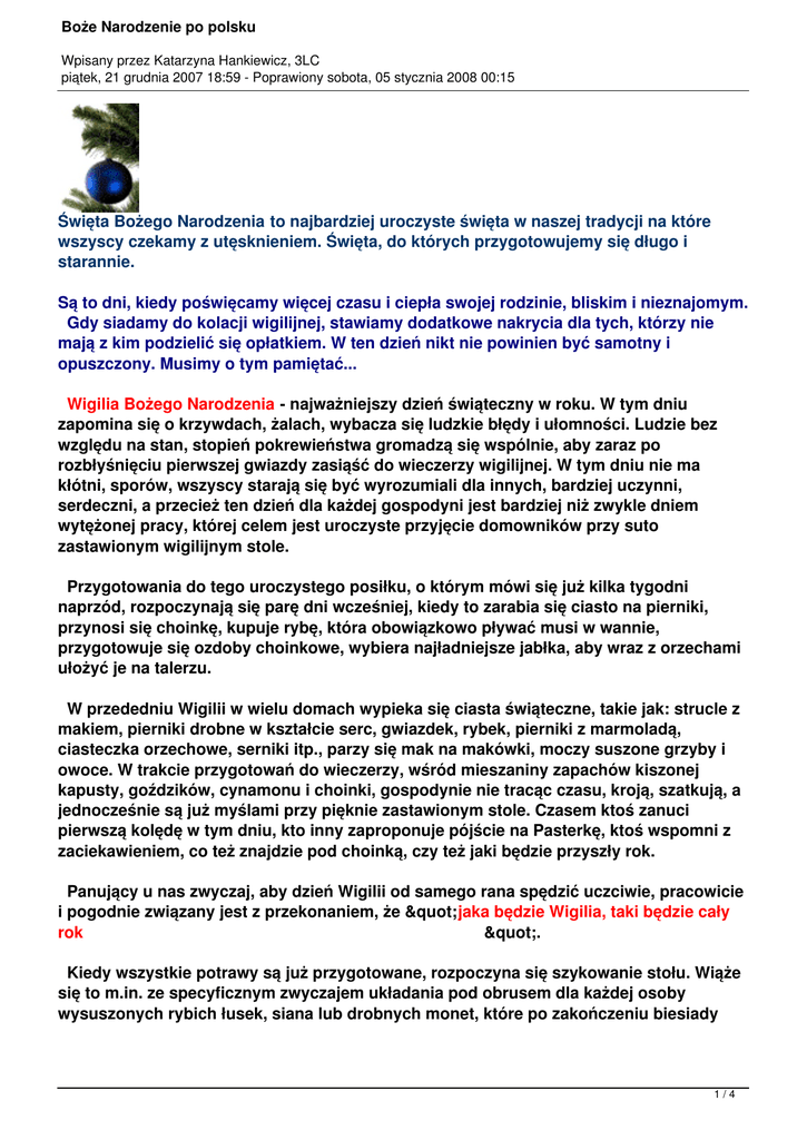 Boże Narodzenie po polsku Wpisany przez Katarzyna Hankiewicz, 3LC piątek, 21 grudnia 2007 18:59 - Poprawiony sobota, 05 stycznia 2008 00:15 Święta Bożego Narodzenia to najbardziej uroczyste święta w naszej tradycji na które wszyscy czekamy z utęsknieniem. Święta, do których przygotowujemy się długo i starannie. Są to dni, kiedy poświęcamy więcej czasu i ciepła swojej rodzinie, bliskim i nieznajomym. Gdy siadamy do kolacji wigilijnej, stawiamy dodatkowe nakrycia dla tych, którzy nie mają z kim podzielić się opłatkiem. W ten dzień nikt nie powinien być samotny i opuszczony. Musimy o tym pamiętać... Wigilia Bożego Narodzenia - najważniejszy dzień świąteczny w roku. W tym dniu zapomina się o krzywdach, żalach, wybacza się ludzkie błędy i ułomności. Ludzie bez względu na stan, stopień pokrewieństwa gromadzą się wspólnie, aby zaraz po rozbłyśnięciu pierwszej gwiazdy zasiąść do wieczerzy wigilijnej. W tym dniu nie ma kłótni, sporów, wszyscy starają się być wyrozumiali dla innych, bardziej uczynni, serdeczni, a przecież ten dzień dla każdej gospodyni jest bardziej niż zwykle dniem wytężonej pracy, której celem jest uroczyste przyjęcie domowników przy suto zastawionym wigilijnym stole. Przygotowania do tego uroczystego posiłku, o którym mówi się już kilka tygodni naprzód, rozpoczynają się parę dni wcześniej, kiedy to zarabia się ciasto na pierniki, przynosi się choinkę, kupuje rybę, która obowiązkowo pływać musi w wannie, przygotowuje się ozdoby choinkowe, wybiera najładniejsze jabłka, aby wraz z orzechami ułożyć je na talerzu. W przededniu Wigilii w wielu domach wypieka się ciasta świąteczne, takie jak: strucle z makiem, pierniki drobne w kształcie serc, gwiazdek, rybek, pierniki z marmoladą, ciasteczka orzechowe, serniki itp., parzy się mak na makówki, moczy suszone grzyby i owoce. W trakcie przygotowań do wieczerzy, wśród mieszaniny zapachów kiszonej kapusty, goździków, cynamonu i choinki, gospodynie nie tracąc czasu, kroją, szatkują, a jednocześnie są już myślami przy pięknie zastawionym stole. Czasem ktoś zanuci pierwszą kolędę w tym dniu, kto inny zaproponuje pójście na Pasterkę, ktoś wspomni z zaciekawieniem, co też znajdzie pod choinką, czy też jaki będzie przyszły rok. Panujący u nas zwyczaj, aby dzień Wigilii od samego rana spędzić uczciwie, pracowicie i pogodnie związany jest z przekonaniem, że "jaka będzie Wigilia, taki będzie cały rok ". Kiedy wszystkie potrawy są już przygotowane, rozpoczyna się szykowanie stołu. Wiąże się to m.in. ze specyficznym zwyczajem układania pod obrusem dla każdej osoby wysuszonych rybich łusek, siana lub drobnych monet, które po zakończeniu biesiady 1/4 Boże Narodzenie po polsku Wpisany przez Katarzyna Hankiewicz, 3LC piątek, 21 grudnia 2007 18:59 - Poprawiony sobota, 05 stycznia 2008 00:15 każdy z obecnych na wieczerzy chowa skrzętnie do "sakiewki", aby przez cały rok nie zabrakło mu pieniędzy. Biały obrus - śnieżnej białości - bez załamań, przykrywa powierzchnię stołu. Najładniejsze naczynia, dawniej gliniane, układane są starannie w równych odstępach. Sztućce odpowiednie do wszystkich potraw są przygotowane przy każdym komplecie naczyń. Na białym talerzyku czy serwetce złożone są opłatki wigilijne. Stół udekorowany jest gałązkami choinki, przyozdobiony kolorowymi dekoracjami. Gdy stół jest już przygotowany, wszyscy domownicy ubierają odświętne stroje. Pod choinkę składa się prezenty, a gospodyni wnosi potrawy. Wszyscy domownicy stają przy swoich miejscach wyznaczonych przez głowę rodziny - ojca, który rozpoczyna modlitwę przed przyjęciem posiłku. Zwyczaj ten jest równie ważny jak dzielenie się opłatkiem i życzenie sobie nawzajem wszelkiej pomyślności, po których można wreszcie zasiąść do stołu. Najbardziej na tę chwilę czekają dzieci, gdyż wygłodniałe po całym dniu postu nie mogą oprzeć się pokusie jedzenia. A jest przecież co jeść... Stół wigilijny jest zastawiony po brzegi samymi wspaniałościami. Znaleźć na nim można m.in.: zupę grochową, inną niż zwykle, zupę migdałową lub grzybową, czy też fasolową. Po zupie spożywa się karpia gotowanego z warzywami polanego masłem z dodatkiem pieczywa lub karpia smażonego na maśle i z ziemniakami. W przeszłości na polskich stołach wigilijnych zamiast karpia podawało się śledzie solone, zwłaszcza w mniej zamożnych rodzinach. Dzisiaj śledź czasami stanowi uzupełnienie wieczerzy wigilijnej. Prawdziwym przysmakiem są makówki. Sporządzane w zależności od regionu: na mleku lub wodzie, z bułek lub sucharków oraz maku z bakaliami i miodem, czy dawniej w zależności od zamożności gospodarzy: z samego maku, bułek, mleka i cukru. Po makówkach następuje pora spożywania kompotu. Spożywania, nie picia, gdyż jest to kompot wyjątkowy: są w nim suszone śliwki, jabłka, gruszki, rodzynki i rarytas - suszone figi. Bywa, że w kompocie takim znajdują się również suszone jagody i morele. Tak kończy się pierwsza część tego uroczystego wieczoru. Można wstać od stołu. Ale według starej tradycji wstaje się naraz, wspólnie, gdyż podczas trwania wieczerzy przestrzegany był zwyczaj, który mówił, że kto pierwszy w trakcie wieczerzy wstanie od stołu, ten w najbliższym roku odejdzie z rodziny. Z chwilą wstania wolno było też zacząć rozmowy, gdyż podczas trwania wieczerzy przestrzegana była, nawet jeszcze niekiedy i dziś jest, cisza. Stwarza ona wyjątkowy klimat tej uroczystości. Druga część wieczoru przeznaczona jest na wspólne śpiewanie kolęd i wróżby, w trakcie których spożywa się pierniki i inne wypieki. Wówczas to wróży się z 12 łupin cebuli imitujących 12 miesięcy, w tym jednej z solą. Panna, która natrafi na łupinę z solą, pewna jest, że w tym miesiącu przyszłego roku wyjdzie za mąż. Znaną wróżbą wigilijną