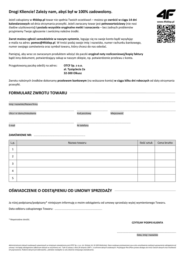 Drogi Kliencie! Zależy nam, abyś był w 100% zadowolony. Jeżeli zakupiony w 4fsklep.pl towar nie spełnia Twoich oczekiwań – możesz go zwrócić w ciągu 14 dni kalendarzowych od dnia otrzymania przesyłki. Jeżeli zwracany towar jest pełnowartościowy (nie nosi śladów użytkowania) i posiada wszystkie oryginalne metki i oznaczenia – bez żadnych problemów przyjmiemy Twoje zgłoszenie i zwrócimy należne środki. www.4fsklep.pl Zwrot możesz zgłosić samodzielnie w naszym systemie, logując się na swoje konto bądź wysyłając e-maila na adres: [email protected]. W treści podaj swoje imię i nazwisko, numer rachunku bankowego, numer swojego zamówienia oraz symbol towaru, który chcesz do nas odesłać. Pamiętaj, aby wraz ze zwracanym produktem włożyć do paczki oryginał noty rozliczeniowej/kopię faktury bądź inny dokument, potwierdzający zakup w naszym sklepie, np. potwierdzenie przelewu z konta. Przygotowaną paczkę odeślij na adres: OTCF Sp. z o.o. al. Tysiąclecia 2a 32-300 Olkusz Zwrotu należnych środków dokonamy przelewem bankowym (na wskazane konto) w ciągu kilku dni roboczych od daty otrzymania przesyłki. FORMULARZ ZWROTU TOWARU ………………………………………………………………………………………………………………………………………………………………………………………………………………………………………………………………… Imię i nazwisko/Nazwa firmy …………………………………………………………………………………………………… Ulica i nr domu/mieszkania ……………………………………………… Kod pocztowy …………………………………………………………………………………………………… Miejscowość …………………………………………………………………………………………………… E-mail …………………………………………………………………………………. Nr telefonu ZAMÓWIENIE NR: ……………………………………………………………………………… L.p. Nazwa towaru Ilość sztuk Cena brutto 1 2 3 4 5 OŚWIADCZENIE O ODSTĄPIENIU OD UMOWY SPRZEDAŻY Ja niżej podpisana/podpisany* niniejszym informuję o moim odstąpieniu od umowy sprzedaży wyżej wymienionego Towaru. Data odbioru zakupionego Towaru: ……………………………………………………………………….. * Niepotrzebne skreślić. CZYTELNY PODPIS KLIENTA ………..……………………………………………………………………………….. Data, imię i nazwisko Administratorem danych osobowych ujawnionych w niniejszym oświadczeniu jest OTCF Sp. z o.o. (ul. Ochota 14, 32-020 Wieliczka). Dane osobowe przetwarzane są w celu umożliwienia realizacji uprawnienia odstąpienia od umowy i nie będą udostępniane odbiorcom danych w rozumieniu art. 7 pkt 6 ustawy z dnia 29 sierpnia 1997 r. o ochronie danych osobowych. Przysługuje Pani/Panu prawo dostępu do treści swoich danych oraz możliwość ich poprawiania. Podanie danych jest dobrowolne, jednakże niezbędne w celu złożenia niniejszego oświadczenia.