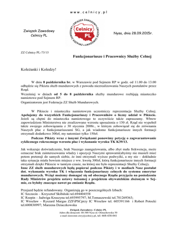 www.celnicy.pl Związek Zawodowy Celnicy PL Nysa, dnia 28.09.2015r. ZZ Celnicy PL-73/15 Funkcjonariusze i Pracownicy Służby Celnej Koleżanki i Koledzy! W dniu 8 października br. w Warszawie pod Sejmem RP w godz. od 11.00 do 13.00 odbędzie się Pikieta służb mundurowych z powodu niezrealizowania Naszych postulatów przez Rząd. Wcześniej w dniach od 5 do 8 października służby mundurowe rozbijają miasteczko namiotowe pod Sejmem RP. Organizatorem jest Federacja ZZ Służb Mundurowych. W Pikiecie i miasteczku namiotowym uczestniczy reprezentacja Służby Celnej. Apelujemy do wszystkich Funkcjonariuszy i Pracowników o liczny udział w Pikiecie. Jeżeli są chętni do miasteczka namiotowego to oczywiście także zapraszamy. Wbrew zapowiedziom Ministerstwa nie zrealizowano wzrostu uposażenia o 150 zł. Rząd nie wypełnił także swojego zobowiązania z 30 stycznia 2008r., w którym zobowiązał się do zrównania Naszych płac z funkcjonariuszami SG, a jak wiadomo funkcjonariusze innych formacji otrzymali dodatkowo 300zł, my natomiast tylko 150zł. Podczas Pikiety wraz z innymi Związkami ponowimy petycję o zagwarantowanie cyklicznego rokrocznego wzrostu płac i wykonanie wyroku TK K39/13. Jak wskazuje doświadczenie, brak Naszego zaangażowania, albo zbyt mała frekwencja, może oznaczać brak zainteresowania władzy i opozycji Naszymi sprawami(abyśmy nie musieli mieć potem pretensji do samych siebie, że inni otrzymali wyższe podwyżki, a my nie – dokładnie taka sytuacja miała bowiem miejsce z ww. kwotą 300zł, którą funkcjonariusze innych formacji otrzymali dzięki Pikiecie w tamtym czasie, na której nie było reprezentacji Służby Celnej). Inne ZZ służb mundurowych będą popierać podczas Pikiety i w mediach Nasz postulat dot. wykonania wyroku TK i włączenia funkcjonariuszy celnych do systemu emerytur mundurowych. Wciąż możemy domagać się od obecnego Rządu przyjęcia na posiedzeniu Rady Ministrów projektu ustawy tożsamej z projektem obywatelskim złożonym w Sejmie, co byłoby znaczące nawet po zmianie Rządu. Przejazd będzie refundowany. Organizują go w poszczególnych Izbach: IC Szczecin – Krzysztof Skibiński tel.694404558 IC Rzepin – Jadwiga Kruszyna tel.693995797; M.Tomaszewski tel.781269363; IC Wrocław – Ryszard Margas ZZFiPSCprzy IC Wrocław tel. 605391166 i Robert Potocki tel.600830997; Marzena Dziaczkowska Związek Zawodowy- Celnicy PL Adres dla doręczeń: 48-300 Nysa ul. Otmuchowska 50 e-mail [email protected], tel: 668-438-041 www.celnicy.pl IC Opole – Robert Schneider 603525672, Artur Kwaśniewski tel.600990827, Arkadiusz Zblewski, Andrzej Rajca 692387888 IC Katowice – Danuta Pencarska 502690297 IC Kraków – Maria Mrugała 668380349 IC Łódź – Tomasz Mazur 438274786; Wojciech Dąbrowski tel.603302090 IC Poznań – Rafał Kucharski 664139726 i Marek Begier tel 616583605 IC Przemyśl – Tomasz Ziobrowski 695162069 i Andrzej Marciniec 603937762 IC Biała Podlaska – W. Szot 728465160 i Zofia Gzara 83 342 7501 lub Andrzej Górski 506295459 i Dariusz Nowak tel. 669997868 IC Białystok – Mariusz Piotrowicz 668597693, Krzysztof Małaszewicz 664083085 i Adam Gauk tel.501082600, Rafał Dobrogowski 602872367, Kamila Dunaj 857458747; IC Olsztyn – Rafał Markiewicz 728266268; Piotr Wawrzyn 505095346; Agnieszka Dolot tel.506133061 IC Gdynia – Ryszard Kot 727551550, Jarosław Kapuścik 513197994, Joanna Stępień 664743488; Jacek Opara 533094887 IC Warszawa – Marta Gzik 608099810; Jolanta Haron 784371012 IC Toruń – prosimy o samodzielne organizowanie przejazdu, a celem rozliczenia kosztów przejazdu prosimy o kontakt z Przewodniczącym ZZ Celnicy PL. Jeżeli są Urzędy lub komórki organizacyjne, z których funkcjonariusze chcieliby samodzielnie zorganizować dojazd grupą lub w kilka osób prosimy o kontakt z Przewodniczącym pod nr tel. 668438041 celem uzgodnienia szczegółów. Prosimy o mobilizację wszystkich, szczególnie prosimy o wsparcie Funkcjonariuszy i Pracowników Izby Celnej w Warszawie oraz z okolicznych miejscowości, które mają blisko do Warszawy, w tym Łódź, Siedlce, Radom, Płock, Ciechanów i inne. Tak jak licznie zbieraliśmy podpisy pod obywatelskim projektem ustawy, tak samo licznie powinniśmy podejmować dalsze działania wzmacniające ten projekt. Wielka determinacja środowiska zawodowego podczas zbierania podpisów, udowodniła Nam wszystkim, że mamy ogromną wolę i nieugiętą wiarę w osiągnięcie celu, a to już połowa sukcesu. Jeżeli tylko nie ustąpi Nasza determinacja i wykażemy konsekwencję w działaniu, na pewno zwyciężymy. Jesteśmy blisko celu. Nie zawiedźmy. Prosimy o zgłoszenia na samą Pikietę, jak również chętnych do miasteczka namiotowego. Zgłoszenia u ww. osób w terminie do dnia 02.10.2015r. włącznie. Na wydarzeniach stawiamy się w umundurowaniu. Można zabrać gwizdki, syreny itp. Nie wolno używać petard i innych środków pirotechnicznych, nie wolno mieć ze sobą broni. Pozdrawiam: Sławomir Siwy Przewodniczący ZZ Celnicy PL Związek Zawodowy- Celnicy PL Adres dla doręczeń: 48-300 Nysa ul. Otmuchowska 50 e-mail [email protected], tel: 668-438-041