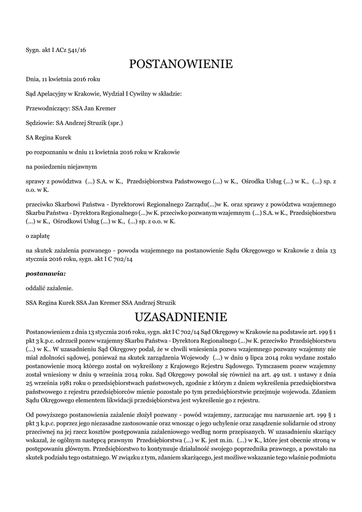 Sygn. akt I ACz 541/16 POSTANOWIENIE Dnia, 11 kwietnia 2016 roku Sąd Apelacyjny w Krakowie, Wydział I Cywilny w składzie: Przewodniczący: SSA Jan Kremer Sędziowie: SA Andrzej Struzik (spr.) SA Regina Kurek po rozpoznaniu w dniu 11 kwietnia 2016 roku w Krakowie na posiedzeniu niejawnym sprawy z powództwa (...) S.A. w K., Przedsiębiorstwa Państwowego (...) w K., Ośrodka Usług (...) w K., (...) sp. z o.o. w K. przeciwko Skarbowi Państwa - Dyrektorowi Regionalnego Zarządu(...)w K. oraz sprawy z powództwa wzajemnego Skarbu Państwa - Dyrektora Regionalnego (...)w K. przeciwko pozwanym wzajemnym (...) S.A. w K., Przedsiębiorstwu (...) w K., Ośrodkowi Usług (...) w K., (...) sp. z o.o. w K. o zapłatę na skutek zażalenia pozwanego - powoda wzajemnego na postanowienie Sądu Okręgowego w Krakowie z dnia 13 stycznia 2016 roku, sygn. akt I C 702/14 postanawia: oddalić zażalenie. SSA Regina Kurek SSA Jan Kremer SSA Andrzej Struzik UZASADNIENIE Postanowieniem z dnia 13 stycznia 2016 roku, sygn. akt I C 702/14 Sąd Okręgowy w Krakowie na podstawie art. 199 § 1 pkt 3 k.p.c. odrzucił pozew wzajemny Skarbu Państwa - Dyrektora Regionalnego (...)w K. przeciwko Przedsiębiorstwu (...) w K.. W uzasadnieniu Sąd Okręgowy podał, że w chwili wniesienia pozwu wzajemnego pozwany wzajemny nie miał zdolności sądowej, ponieważ na skutek zarządzenia Wojewody (...) w dniu 9 lipca 2014 roku wydane zostało postanowienie mocą którego został on wykreślony z Krajowego Rejestru Sądowego. Tymczasem pozew wzajemny został wniesiony w dniu 9 września 2014 roku. Sąd Okręgowy powołał się również na art. 49 ust. 1 ustawy z dnia 25 września 1981 roku o przedsiębiorstwach państwowych, zgodnie z którym z dniem wykreślenia przedsiębiorstwa państwowego z rejestru przedsiębiorców mienie pozostałe po tym przedsiębiorstwie przejmuje wojewoda. Zdaniem Sądu Okręgowego elementem likwidacji przedsiębiorstwa jest wykreślenie go z rejestru. Od powyższego postanowienia zażalenie złożył pozwany - powód wzajemny, zarzucając mu naruszenie art. 199 § 1 pkt 3 k.p.c. poprzez jego niezasadne zastosowanie oraz wnosząc o jego uchylenie oraz zasądzenie solidarnie od strony przeciwnej na jej rzecz kosztów postępowania zażaleniowego według norm przepisanych. W uzasadnieniu skarżący wskazał, że ogólnym następcą prawnym Przedsiębiorstwa (...) w K. jest m.in. (...) w K., które jest obecnie stroną w postępowaniu głównym. Przedsiębiorstwo to kontynuuje działalność swojego poprzednika prawnego, a powstało na skutek podziału tego ostatniego. W związku z tym, zdaniem skarżącego, jest możliwe wskazanie tego właśnie podmiotu jako pozwanego wzajemnie w trybie sprostowania. Nadto przedmiot powództwa wzajemnego jest również aktualny względem następcy prawnego pierwotnie pozwanego wzajemnie. Powód wzajemny podkreślił, że pozwane wzajemnie przedsiębiorstwo nie dopełniło spoczywających na nim ciężarów procesowych, nie powiadamiając niezwłocznie o zmianach organizacyjnych jakie zaszły w jego strukturze. Takie postępowanie nie może zaś obciążać negatywnymi skutkami Skarbu Państwa. W odpowiedzi na zażalenie pozwany wzajemny wniósł o oddalenie zażalenia oraz zasądzenie od powoda wzajemnego kosztów postępowania według norm przepisanych. W uzasadnieniu wskazał, że w chwili wniesienia powództwa wzajemnego podmiot przeciwko któremu było ono skierowane utracił byt prawny, wskutek jego wykreślenia z Krajowego Rejestru Sądowego. Tym samym powództwo zostało skierowane do podmiotu, który nie posiadał zdolności sądowej. Pozwany wzajemnie podkreślił, że mając na uwadze zasadę jawności wpisów w Krajowym Rejestrze Sądowym, powód wzajemny miał możliwość zweryfikowania, czy podmiot wobec którego występuje z pozwem rzeczywiście istnieje. Natomiast twierdzenia skarżącego w przedmiocie tożsamości podmiotów nie są zasadne. Sąd Apelacyjny zważył co następuje: Zażalenie okazało się niezasadne i w związku z tym podlegało oddaleniu. Problem, który pojawił się w niniejszej sprawie dotyczy istnienia zdolności sądowej po stronie jednego z podmiotów występujących jako powód, a to konkretnie Przedsiębiorstwa (...) w K.. Podmiot taki nie istniał z pewnością w chwili wytoczenia powództwa wzajemnego przez stronę pozwaną. W dniu 8 kwietnia 2014 roku Wojewoda (...) na podstawie art. 18 ustawy z dnia 25 września 1981 roku o przedsiębiorstwach państwowych oraz rozporządzenia Rady Ministrów z dnia 30 listopada 1981 roku w sprawie wykonania ustawy o przedsiębiorstwach państwowych dokonał podziału wskazanego podmiotu przez utworzenie dwóch samodzielnych przedsiębiorstw państwowych pod nazwą: (...) z siedzibą w K. oraz Państwowy Zarząd (...) z siedzibą w K.. Przedsiębiorstwa te powstały w oparciu o wydzielone, zorganizowane części załogi oraz zespoły środków trwałych i odpowiadające im części środków obrotowych należące do przedsiębiorstwa ulegającego podziałowi. Działalność Przedsiębiorstwa (...) w K., zgodnie z treścią zarządzenia, miała ustać z dniem 15 kwietnia 2014 roku (k.667-669). Wykreślenie tego podmiotu z Krajowego Rejestru Sądowego nastąpiło w dniu 9 lipca 2014 roku (k.670-675). Natomiast pozew wzajemny został złożony w dniu 9 września 2014 roku (data stempla na kopercie- k.497). W związku z powyższym, niezależnie od tego którą z dat uznać za rzeczywisty dzień zaprzestania funkcjonowania pozwanego wzajemnie przedsiębiorstwa nie ma wątpliwości, że na dzień złożenia pozwu wzajemnego taki podmiot w obrocie prawnym nie istniał. Co istotne zakończenie bytu prawnego przez pozwane wzajemnie przedsiębiorstwo, mimo iż nastąpiło w drodze reorganizacji a nie likwidacji, miało charakter całkowity. Wbrew stanowisku Sądu Okręgowego, nie doszło do przejęcia majątku przedsiębiorstwa przez wojewodę, ponieważ nie dokonano jego likwidacji ale przek