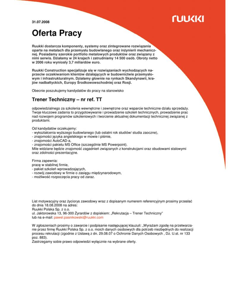 31.07.2008 Oferta Pracy Ruukki dostarcza komponenty, systemy oraz zintegrowane rozwiązania oparte na metalach dla przemysłu budowlanego oraz inżynierii mechanicznej. Posiadamy szerokie portfolio metalowych produktów oraz związany z nimi serwis. Działamy w 24 krajach i zatrudniamy 14 500 osób. Obroty netto w 2006 roku wyniosły 3,7 miliardów euro. Ruukki Construction specjalizuje się w rozwiązaniach wychodzących naprzeciw oczekiwaniom klientów działających w budownictwie przemysłowym i infrastrukturalnym. Działamy głownie na rynkach Skandynawii, krajów nadbałtyckich, Europy Środkowowschodniej oraz Rosji. Obecnie poszukujemy kandydatów do pracy na stanowisko Trener Techniczny – nr ref. TT odpowiedzialnego za szkolenia wewnętrzne i zewnętrzne oraz wsparcie techniczne działu sprzedaży. Twoje kluczowe zadania to przygotowywanie i prowadzenie szkoleń technicznych, prowadzenie prac nad rozwojem programów szkoleniowych i tworzenie aktualnej dokumentacji technicznej związanej z produktami. Od kandydatów oczekujemy: - wykształcenia wyższego budowlanego (lub ostatni rok studiów/ studia zaoczne), - znajomości języka angielskiego w mowie i piśmie, - znajomości AutoCAD-a, - znajomości pakietu MS Office (szczególnie MS Powerpoint). Mile widziane będzie znajomość zagadnień związanych z konstrukcjami oraz obudowami stalowymi oraz zdolności prezentacyjne. Firma zapewnia: pracę w stabilnej firmie, - pakiet szkoleń wprowadzających, - rozwój zawodowy w firmie o zasięgu międzynarodowym, - możliwość rozpoczęcia pracy od zaraz. List motywacyjny oraz życiorys zawodowy wraz z dopisanym numerem referencyjnym prosimy przesłać do dnia 18.08.2008 na adres: Ruukki Polska Sp. z o.o. ul. Jaktorowska 13, 96-300 Żyrardów z dopiskiem: „Rekrutacja – Trener Techniczny” lub na e-mail: [email protected] W zgłoszeniach prosimy o zawarcie i podpisanie następującej klauzuli: „Wyrażam zgodę na przetwarzanie przez firmę Ruukki Polska Sp. z o.o. moich danych osobowych dla potrzeb niezbędnych do realizacji procesu rekrutacji (zgodnie z Ustawą z dn. 29.08.07 o Ochronie Danych Osobowych , Dz. U.st. nr 133 poz. 883). Zastrzegamy sobie prawo odpowiedzi wyłącznie na wybrane oferty.