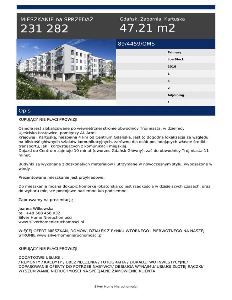 MIESZKANIE na SPRZEDAŻ 231 282 Gdańsk, Zabornia, Kartuska 47.21 m2 89/4459/OMS Primary LowBlock 2016 1 4 2 Adjoining 1 Opis KUPUJĄCY NIE PŁACI PROWIZJI Osiedle jest zlokalizowane po wewnętrznej stronie obwodnicy Trójmiasta, w dzielnicy Ujeścisko-Łostowice, pomiędzy Al. Armii Krajowej i Kartuską, niespełna 4 km od Centrum Gdańska. Jest to dogodna lokalizacja ze względu na bliskość głównych szlaków komunikacyjnych, zarówno dla osób posiadających własne środki transportu, jak i korzystających z komunikacji miejskiej. Dojazd do Centrum zajmuje 10 minut (dworzec Gdańsk Główny), zaś do obwodnicy Trójmiasta 11 minut. Budynki są wykonane z doskonałych materiałów i utrzymane w nowoczesnym stylu, wyposażone w windy . Prezentowane mieszkanie jest przykładowe. Do mieszkania można dokupić komórkę lokatorską co jest rzadkością w dzisiejszych czasach, oraz do wyboru miejsce postojowe naziemne lub podziemne. Zapraszamy na prezentację Joanna Wilkowska tel. +48 508 458 032 Silver Home Nieruchomości www.silverhomenieruchomosci.pl WIĘCEJ OFERT MIESZKAŃ, DOMÓW, DZIAŁEK Z RYNKU WTÓRNEGO I PIERWOTNEGO NA NASZEJ STRONIE www.silverhomenieruchomosci.pl KUPUJĄCY NIE PŁACI PROWIZJI DODATKOWE USŁUGI : / REMONTY / KREDYTY / UBEZPIECZENIA / FOTOGRAFIA / DORADZTWO INWESTYCYJNE/ DOPASOWANIE OFERTY DO POTRZEB NABYWCY/ OBSŁUGA WYNAJMU/ USŁUGI ZŁOTEJ RĄCZKI/ WYSZUKIWANIE NIERUCHMOŚCI NA SPECJALNE ZAMÓWIENIE KLIENTA . Silver Home Nieruchomości Ogłoszenie ma charakter informacyjny i nie stanowi oferty w rozumieniu przepisów kodeksu cywilnego Joanna Wilkowska tel. +48 508 458 032 Silver Home Nieruchomości www.silverhomenieruchomosci.pl KUPUJĄCY/ NAJEMCA NIE PŁACI PROWIZJI / REMONTY / KREDYTY / UBEZPIECZENIA / FOTOGRAFIA / Ogłoszenie ma charakter informacyjny i nie stanowi oferty w rozumieniu przepisów kodeksu cywilnego Silver Home Nieruchomości tel. 508 458 032; 508 458 022 email: [email protected] Silver Home Nieruchomości Powered by TCPDF (www.tcpdf.org)