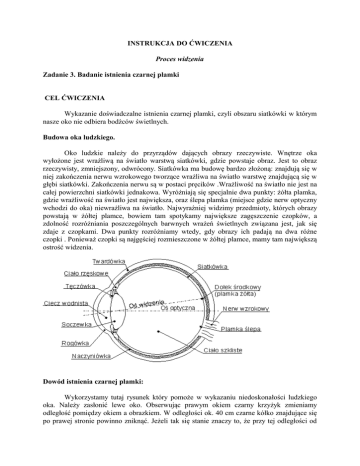 INSTRUKCJA DO ĆWICZENIA Proces widzenia Zadanie 3. Badanie istnienia czarnej plamki CEL ĆWICZENIA Wykazanie doświadczalne istnienia czarnej plamki, czyli obszaru siatkówki w którym nasze oko nie odbiera bodźców świetlnych. Budowa oka ludzkiego. Oko ludzkie należy do przyrządów dających obrazy rzeczywiste. Wnętrze oka wyłożone jest wrażliwą na światło warstwą siatkówki, gdzie powstaje obraz. Jest to obraz rzeczywisty, zmniejszony, odwrócony. Siatkówka ma budowę bardzo złożoną: znajdują się w niej zakończenia nerwu wzrokowego tworzące wrażliwa na światło warstwę znajdującą się w głębi siatkówki. Zakończenia nerwu są w postaci pręcików .Wrażliwość na światło nie jest na całej powierzchni siatkówki jednakowa. Wyróżniają się specjalnie dwa punkty: żółta plamka, gdzie wrażliwość na światło jest największa, oraz ślepa plamka (miejsce gdzie nerw optyczny wchodzi do oka) niewrażliwa na światło. Najwyraźniej widzimy przedmioty, których obrazy powstają w żółtej plamce, bowiem tam spotykamy największe zagęszczenie czopków, a zdolność rozróżniania poszczególnych barwnych wrażeń świetlnych związana jest, jak się zdaje z czopkami. Dwa punkty rozróżniamy wtedy, gdy obrazy ich padają na dwa różne czopki . Ponieważ czopki są najgęściej rozmieszczone w żółtej plamce, mamy tam największą ostrość widzenia. Dowód istnienia czarnej plamki: Wykorzystamy tutaj rysunek który pomoże w wykazaniu niedoskonałości ludzkiego oka. Należy zasłonić lewe oko. Obserwując prawym okiem czarny krzyżyk zmieniamy odległość pomiędzy okiem a obrazkiem. W odległości ok. 40 cm czarne kółko znajdujące się po prawej stronie powinno zniknąć. Jeżeli tak się stanie znaczy to, że przy tej odległości od obrazka i przy tej geometrii rysunku obraz czarnego kółka znalazł się w siatkówce gdzie nie występują żadne fotoreceptory, czyli w tzw. czarnej plamce. Dodatkowo można zaobserwować jaki w pionie obszar obejmuje czarna plamka poruszając głową w górę i w dół. Interpretacja wyników: - Określić odległość dla której obraz czarnego kółka znajdzie się w obszarze czarnej plamki. Określić zakres plamki w płaszczyźnie poziomej szacując wielkość kąta odchylenia głowy przy którym kółko pozostanie niewidoczne. Omówić zagrożenia dla człowieka wynikające z istnienia czarnej plamki.