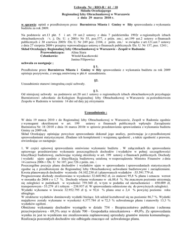 Uchwała Nr : RIO-R / 61 / 10 Składu Orzekającego Regionalnej Izby Obrachunkowej w Warszawie z dnia 29 marca 2010 r. w sprawie: opinii o przedłoŜonym przez Burmistrza Miasta i Gminy w IłŜy sprawozdaniu z wykonania budŜetu za rok 2009. Na podstawie art.13 pkt. 5 i art. 19 ust.2 ustawy z dnia 7 października 1992r o regionalnych izbach obrachunkowych / t. j; Dz. U. z 2001r Nr 55, poz.577, z późn. zm./, art.199 ust.2 ustawy o finansach publicznych z 30 czerwca 2005r /Dz. U. Nr 249 poz. 2104, z późn. zm./ w związku z art.121,ust.7 ustawy z dnia 27 sierpnia 2009 r przepisy wprowadzające ustawę o finansach publicznych /Dz. U. Nr 157, poz. 1241/, Skład Orzekający Regionalnej Izby Obrachunkowej w Warszawie - Zespół w Radomiu: Przewodnicząca: Alina Siara Członkowie: Witold Kaczkowski Janina Filipowicz uchwala co następuje ; § 1. PrzedłoŜone przez Burmistrza Miasta i Gminy w IłŜy sprawozdanie z wykonania budŜetu za rok 2009 opiniuje pozytywnie, z uwagą omówioną w pkt.4 uzasadnienia. §2. Uzasadnienie stanowi integralną część uchwały. § 3. Od niniejszej uchwały na podstawie art.20 ust.1 ustawy o regionalnych izbach obrachunkowych przysługuje Burmistrzowi odwołanie do Kolegium Regionalnej Izby Obrachunkowej w Warszawie za pośrednictwem Zespołu w Radomiu w terminie 14 dni od daty jej otrzymania Uzasadnienie : W dniu 19 marca 2010 r do Regionalnej Izby Obrachunkowej w Warszawie, Zespół w Radomiu zgodnie z wymogami określonymi w art. 199 ustawy o finansach publicznych wpłynęło Zarządzenie Burmistrza Nr: 18 /2010 z dnia 16 marca 2010r w sprawie przedstawienia sprawozdania z wykonania budŜetu Gminy za 2009 rok. Skład Orzekający opiniując powyŜsze sprawozdanie dokonał jego analizy, porównując je z przedłoŜonymi sprawozdaniami statystycznymi. Zbadano ich kompletność i wzajemną zgodność , a takŜe zgodność z prawem, stwierdzając co następuje: 1. W części opisowej sprawozdania omówiono wykonanie budŜetu . W załącznikach do sprawozdania opisowego przedstawiono wykonanie poszczególnych dochodów i wydatków w pełnej szczegółowości klasyfikacji budŜetowej, zachowując wymóg określony w art. 199 ustawy o finansach publicznych. Dochody i wydatki ujęto zgodnie z klasyfikacją budŜetową ustaloną w rozporządzeniu Ministra Finansów z dnia 14 czerwca 2006 r /Dz. U Nr 107, poz.726 z późn. zm. /. Poszczególne pozycje planu dochodów i wydatków ujęte w sprawozdaniu i sprawozdaniach statystycznych zgodne są z przedłoŜonymi do Regionalnej Izby Obrachunkowej uchwałami budŜetowymi i zarządzeniami. Kwota planowanych dochodów wyniosła -34.102.230 zł i planowanych wydatków -35.591.779 zł. Prognozowane dochody zrealizowano w wysokości 32.668.962 zł, co stanowi 95,8 % planu i oznacza wzrost w stosunku do 2008 r o 1,7 %. Dochody własne wykonano w ok.88,4 %. Na znacznym poziomie utrzymują się zaległości w podatkach w wysokości 759.360 zł, w tym w podatku od nieruchomości – 450.009 zł, transportowym - 53.279 zł i rolnym – 238.937 zł. W sprawozdaniu odniesiono się do powyŜszych zaległości. Wydatki wykonano w kwocie 32.952.795 zł tj. w 92,6 % planu oraz o 2,4 % powyŜej poziomu roku ubiegłego. W strukturze wydatków dominowały wydatki bieŜące. Ich udział kształtował się na poziomie 86,7 %. Wydatki majątkowe zostały wykonane w wysokości 4.377.784 zł w 72,3 % uchwalonego planu i stanowiły 13,3 % wydatków ogółem . ObniŜone wykonanie dochodów wystąpiło w dziale 754 - Bezpieczeństwo publiczne i ochrona przeciwpoŜarowa - 69,3% oraz w dziale 700 - Gospodarka mieszkaniowa – 49,0%. Ze sprawozdania wynika Ŝe jest to wynikiem nie zrealizowania zaplanowanej sprzedaŜy gruntów mienia komunalnego. Realizacja pozostałych dochodów nie odbiegała znacząco od uchwalonego planu. Z punktu widzenia istotności dla budŜetu gminy obniŜony stopień realizacji planu wydatków wystąpił w dziale 010 – Rolnictwo i łowiectwo – w 52,2%, w dziale 754 – Bezpieczeństwo publiczne i ochrona przeciwpoŜarowa- w 69,3% oraz w dziale 900 – Gospodarka komunalna i ochrona środowiska – w 72,8% . W pozostałych działach realizacja wydatków nie odbiegała znacząco od uchwalonego planu . W wyniku analizy sprawozdań na koniec roku 2009 nie stwierdzono przekroczenia planu wydatków. Natomiast zaciągnięte zobowiązania niewymagalne mieszczą się w granicach upowaŜnienia. Nie stwierdzono nieprawidłowości w zakresie wykazanych w sprawozdaniu źródeł dochodów i przeznaczenia wydatków na zadania własne, w tym na realizację zadań obligatoryjnych, na zadania zlecone i na pomoc między jednostkami samorządu terytorialnego. 2. W wyniku realizacji budŜetu za 2009 r Gmina osiągnęła deficyt budŜetowy w kwocie 283.833 zł, który został sfinansowany kredytem, poŜyczką i wolnymi środkami. 3. Na podstawie sprawozdania RB - Z ustalono, iŜ zobowiązania Gminy na koniec roku 2009 wg tytułów dłuŜnych wyniosły 3.338.655 zł i stanowią 10,2 % wykonanych dochodów. Na powyŜszą kwotę składają się zobowiązania z tytułu zaciągniętych kredytów i poŜyczek w kwocie 3.312.600 zł oraz zobowiązania wymagalne w wysokości 26.055 zł , które wystąpiły w zakładzie budŜetowym Gminy . Natomiast wskaźnik obciąŜenia budŜetu spłatami zadłuŜenia wynosi 3,8 %. Zachowany został więc limit obciąŜenia budŜetu spłatami zadłuŜenia i wskaźnik kwoty długu jednostki, określony w art. 169 i art. 170 ustawy o finansach publicznych. 4. Zadania z zakresu uŜyteczności publicznej realizowane są w Gminie przez Zakład Energetyki Cieplnej, Zakład Wodociągów i Kanalizacji, Administrację Budynków Mieszkaniowych oraz Miejsko-Gminny Ośrodek Sportu i Rekreacji działające w formie zakładu budŜetowego. W 2009 r z budŜetu Gminy udzielono na rzecz ADM dotacji przedmiotowej w kwocie 15.134 zł oraz dotacji na inwestycje w kwocie 5.490 zł. Przekazana z budŜetu dla Zakładu dotacja przedmiotowa 