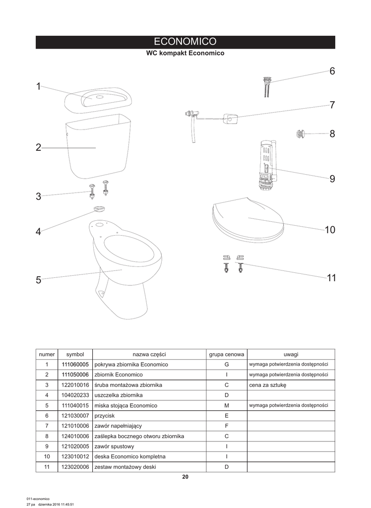 ECONOMICO WC kompakt Economico 6 1 7 8 2 9 3 4 10 5 11 numer symbol nazwa części grupa cenowa 1 111060005 pokrywa zbiornika Economico G wymaga potwierdzenia dostępności 2 111050006 zbiornik Economico I wymaga potwierdzenia dostępności 3 122010016 śruba montażowa zbiornika C cena za sztukę 4 104020233 uszczelka zbiornika D 5 111040015 M 6 121030007 przycisk E 7 121010006 zawór napełniający F 8 124010006 zaślepka bocznego otworu zbiornika C 9 121020005 zawór spustowy I 10 123010012 deska Economico kompletna I 11 123020006 zestaw montażowy deski D miska stojąca Economico 20 011-economico 27 pa dziernika 2016 11:45:51 uwagi wymaga potwierdzenia dostępności