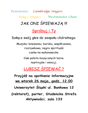 Pentatonix Cambridge Singers King’s Singers Westminster Choir JAK ONI ŚPIEWAJĄ !!! Spróbuj i Ty Dołącz swój głos do zespołu chóralnego. Muzyka renesansu, baroku, współczesna, rozrywkowa, negro spirituals czeka na wykonawców. Cała paleta muzycznych barw, nastrojów i emocji. LUBISZ ŚPIEWAĆ ? Przyjdź na spotkanie informacyjne we wtorek 26 maja, godz. 12.00 Uniwersytet Śląski ul. Bankowa 12 (rektorat), parter, Studencka Strefa Aktywności, sala 133