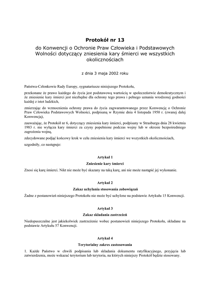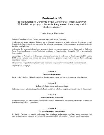 Protokół nr 13 do Konwencji o Ochronie Praw Człowieka i Podstawowych Wolności dotyczący zniesienia kary śmierci we wszystkich okolicznościach z dnia 3 maja 2002 roku Państwa-Członkowie Rady Europy, sygnatariusze niniejszego Protokołu, przekonane że prawo każdego do życia jest podstawową wartością w społeczeństwie demokratycznym i że zniesienie kary śmierci jest niezbędne dla ochrony tego prawa i pełnego uznania wrodzonej godności każdej z istot ludzkich, zmierzając do wzmocnienia ochrony prawa do życia zagwarantowanego przez Konwencję o Ochronie Praw Człowieka Podstawowych Wolności, podpisaną w Rzymie dnia 4 listopada 1950 r. (zwanej dalej Konwencją), zauważając, że Protokół nr 6, dotyczący zniesienia kary śmierci, podpisany w Strasburgu dnia 28 kwietnia 1983 r. nie wyłącza kary śmierci za czyny popełnione podczas wojny lub w okresie bezpośredniego zagrożenia wojną, zdecydowane podjąć końcowy krok w celu zniesienia kary śmierci we wszystkich okolicznościach, uzgodniły, co następuje: Artykuł 1 Zniesienie kary śmierci Znosi się karę śmierci. Nikt nie może być skazany na taką karę, ani nie może nastąpić jej wykonanie. Artykuł 2 Zakaz uchylania stosowania zobowiązań Żadne z postanowień niniejszego Protokołu nie może być uchylone na podstawie Artykułu 15 Konwencji. Artykuł 3 Zakaz składania zastrzeżeń Niedopuszczalne jest jakiekolwiek zastrzeżenie wobec postanowień niniejszego Protokołu, składane na podstawie Artykułu 57 Konwencji. Artykuł 4 Terytorialny zakres zastosowania 1. Każde Państwo w chwili podpisania lub składania dokumentu ratyfikacyjnego, przyjęcia lub zatwierdzenia, może wskazać terytorium lub terytoria, na których niniejszy Protokół będzie stosowany. 2. Każde Państwo może w każdym późniejszym czasie, w drodze deklaracji skierowanej do Sekretarza Generalnego Rady Europy, rozszerzyć stosowanie niniejszego Protokołu na inne terytorium wymienione w tej deklaracji. W stosunku do takiego terytorium Protokół wejdzie w życie pierwszego dnia miesiąca następującego po dacie wygaśnięcia trzymiesięcznego okresu od dnia przyjęcia takiej deklaracji przez Sekretarza Generalnego. 3. Każda deklaracja złożona zgodnie z dwoma poprzednimi ustępami może być, w stosunku do jakiegokolwiek terytorium wymienionego w takiej deklaracji, wycofana lub zmieniona w drodze notyfikacji skierowanej do Sekretarza Generalnego Rady Europy. Wycofanie lub zmiana stają się skuteczne pierwszego dnia miesiąca następującego po wygaśnięciu trzymiesięcznego okresu od dnia przyjęcia takiego zawiadomienia przez Sekretarza Generalnego. Artykuł 5 Stosunek do Konwencji Państwa-Strony uznają postanowienia Artykułów od 1 do 4 niniejszego Protokołu za dodatkowe artykuły Konwencji, a wszystkie przepisy Konwencji stosuje się odpowiednio. Artykuł 6 Podpisanie i ratyfikacja Niniejszy Protokół jest otwarty do podpisu dla Państw-Członków Rady Europy, które podpisały niniejszą Konwencję. Podlega on ratyfikacji, przyjęciu lub zatwierdzeniu. Państwo-Członek Rady Europy nie może ratyfikować, przyjąć lub zatwierdzić niniejszego Protokołu, o ile jednocześnie lub wcześniej nie ratyfikowało Konwencji. Dokumenty ratyfikacyjne, przyjęcia lub zatwierdzenia składa się Sekretarzowi Generalnemu Rady Europy. Artykuł 7 Wejście w życie 1. Niniejszy Protokół wejdzie w życie pierwszego dnia miesiąca następującego po upływie okresu trzech miesięcy po dacie, w której dziesięć Państw-Członków Rady Europy wyraziło zgodę na związanie się Protokołem zgodnie z postanowieniami Artykułu 6. 2. W stosunku do każdego Państwa-Członka, które później wyrazi zgodę na związanie się niniejszym Protokołem, wejdzie on w życie pierwszego dnia miesiąca następującego po upływie trzymiesięcznego okresu po dniu złożenia dokumentu ratyfikacyjnego, przyjęcia lub zatwierdzenia. Artykuł 8 Funkcje depozytariusza Sekretarz Generalny Rady Europy notyfikuje wszystkim Państwom-Członkom Rady Europy: a. każde podpisanie; b. złożenia każdego dokumentu ratyfikacyjnego, przyjęcia lub zatwierdzenia; c. każdą datę wejścia w życie niniejszego Protokołu zgodnie z Artykułami 4 i 7; d. każdy inny akt, notyfikację lub zawiadomienie dotyczące niniejszego Protokołu. Na dowód czego niżej podpisani, będąc do tego należycie upoważnieni, podpisali niniejszy Protokół. Sporządzono w Wilnie, dnia 3 maja 2002 roku w językach angielskim i francuskim, przy czym oba teksty są jednakowo autentyczne, w jednym egzemplarzu, który zostanie złożony w archiwach Rady Europy. Sekretarz Generalny Rady Europy przekaże uwierzytelnione kopie każdemu Państwu-Członkowi Rady Europy.