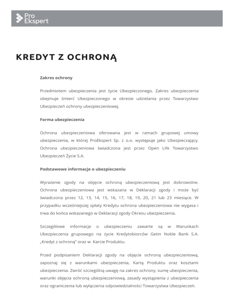 KREDY T Z OCHRONĄ Zakres ochrony Przedmiotem ubezpieczenia jest życie Ubezpieczonego. Zakres ubezpieczenia obejmuje śmierć Ubezpieczonego w okresie udzielania przez Towarzystwo Ubezpieczeń ochrony ubezpieczeniowej. Forma ubezpieczenia Ochrona ubezpieczeniowa oferowana jest w ramach grupowej umowy ubezpieczenia, w której ProEkspert Sp. z o.o. występuje jako Ubezpieczający. Ochrona ubezpieczeniowa świadczona jest przez Open Life Towarzystwo Ubezpieczeń Życie S.A. Podstawowe informacje o ubezpieczeniu Wyrażenie zgody na objęcie ochroną ubezpieczeniową jest dobrowolne. Ochrona ubezpieczeniowa jest wskazana w Deklaracji zgody i może być świadczona przez 12, 13, 14, 15, 16, 17, 18, 19, 20, 21 lub 23 miesiące. W przypadku wcześniejszej spłaty Kredytu ochrona ubezpieczeniowa nie wygasa i trwa do końca wskazanego w Deklaracji zgody Okresu ubezpieczenia. Szczegółowe informacje o ubezpieczeniu zawarte są w Warunkach Ubezpieczenia grupowego na życie Kredytobiorców Getin Noble Bank S.A. „Kredyt z ochroną” oraz w Karcie Produktu. Przed podpisaniem Deklaracji zgody na objęcie ochroną ubezpieczeniową, zapoznaj się z warunkami ubezpieczenia, Kartą Produktu oraz kosztami ubezpieczenia. Zwróć szczególną uwagę na zakres ochrony, sumę ubezpieczenia, warunki objęcia ochroną ubezpieczeniową, zasady wystąpienia z ubezpieczenia oraz ograniczenia lub wyłączenia odpowiedzialności Towarzystwa Ubezpieczeń. Świadczenie ubezpieczeniowe: W przypadku zajścia Zdarzenia ubezpieczeniowego Towarzystwo Ubezpieczeń, z zastrzeżeniem wyłączeń odpowiedzialności, wypłaci jednorazowe Świadczenie ubezpieczeniowe równe iloczynowi kwoty kapitału Kredytu pozostającego do spłaty w dniu zajścia Zdarzenia ubezpieczeniowego, oraz wskaźnika procentowego, zależnego od wybranego okresu ubezpieczenia, zgodnie z poniższą tabelą: Okresy Wskaźnik procentowy w oparciu o Ubezpieczenia który obliczana jest Suma Ubezpieczenia 12 100% 13 110% 14 120% 15 130% 16 140% 17 150% 18 160% 19 170% 20 180% 21 190% 22 200% W przypadku gdy doszło do wcześniejszej spłaty Kredytu lub wcześniejszego rozwiązania Umowy kredytu, Suma ubezpieczenia, stanowi, 50% kwoty kapitału Kredytu z dnia zawarcia Umowy kredytu, wskazanej w Umowie kredytu Ochroną ubezpieczeniową w ramach jednej Umowy kredytu może zostać objęta dowolna liczba kredytobiorców. Suma ubezpieczenia jest podzielona proporcjonalnie pomiędzy wszystkich ubezpieczonych kredytobiorców. W celu zapewnienia Klientom możliwości uzyskania rzetelnej i przejrzystej informacji dotyczącej oferowanego produktu ubezpieczeniowego oraz wysokiego standardu obsługi ProEkspert Sp. z o.o., w zakresie oferowanego produktu ubezpieczeniowego, stosuje się do zasad określonych w Rekomendacji U z dnia 24 czerwca 2014 r. dotyczącej dobrych praktyk w zakresie bancassurance wydanej przez Komisję Nadzoru Finansowego oraz w „Rekomendacji dobrych praktyk na polskim rynku bancassurance w zakresie ubezpieczeń ochronnych powiązanych z produktami bankowymi” wydanej przez Związek Banków Polskich. Jak zgłosić roszczenie? 1. Wypełnij wniosek o wypłatę świadczenia. 2. Skompletuj niezbędną dokumentację i załącz ją do wniosku o wypłatę świadczenia (lista dokumentów znajduje się w treści wniosku). 3. Złóż wniosek wraz z dokumentacją za pośrednictwem Ubezpieczającego lub w najbliższej placówce Agenta (Getin Noble Bank S.A.) albo prześlij wniosek wraz z dokumentacją na adres wskazany we wniosku o wypłatę świadczenia. Proszę pamiętać, że mogą Państwo liczyć na pomoc ze strony Ubezpieczającego w procesie ubiegania się o wypłatę świadczenia ubezpieczeniowego. DOKUMENTY DO POBRANIA Kredyt z ochroną - Open Life - Dyspozycja Zmian Niefinansowych Kredyt z ochroną - Open Life - Formularz wystapienia Kredyt z ochroną - Open Life - Formularz zgloszenia roszczenia Kredyt z ochroną - Open Life - Karta Produktu Kredyt z ochroną - Open Life - Warunki Ubezpieczenia