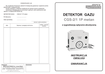 GWARANCJA Na urz¹dzenie Producent udziela12-miesiêcznej gwarancji i zapewnia serwis gwarancyjny i pogwarancyjny. Koszty zwi¹zane z dostaw¹ urz¹dzenia do serwisu ponosi u¿ytkownik. Gwarancja udzielana jest na warunkach ogólnych, jeœli u¿ytkowanie by³o zgodne z niniejsz¹ INSTRUKCJ¥. DETEKTOR GAZU: CGS-2/1 1P metan Nr fabryczny: ........................... Data sprzeda¿y: ........................... .................................................. DETEKTOR GAZU CGS-2/1 1P metan pieczêæ i podpis sprzedawcy data Naprawy I przegl¹dy techniczne podpis i pieczêæ serwisu z sygnalizacj¹ optyczno-akustyczn¹ INSTRUKCJA OBS£UGI Producent: IMPEX-ELECTRONICS in¿. Janusz Wójcik 81-423 GDYNIA ul. Partyzantów 35 POLSKA tel/fax.: +48 58 622 82 90 tel.: +48 58 622 75 21 www.impex-electronics.pl e-mail: [email protected] Dystrybutor: GWARANCJA DETEKTOR GAZU CGS-2/1 1P metan INSTRUKCJA OBS£UGI CGS-2/1 1P metan jest detektorem stacjonarnym, sygnalizacyjno-steruj¹cym, 1-progowym, przeznaczonym do wykrywania ulatniaj¹cego siê metanu i za³¹czania 1-biegunowego wentylatora wyci¹gu. W przypadku ulatniania siê gazu, przy stê¿eniu 10%DGW (Dolnej Granicy Wybuchowej) zostaje za³¹czony alarm akustyczny (buczek) i optyczny (dioda LED) DETEKTORA oraz zestyk zwierny przekaŸnika (zestyk NO - normalnie otwarty). Detektor przeznaczony jest do zainstalowania w Stacjach Kontroli Pojazdów, gara¿ach, pomieszczeniach mieszkalnych (kuchniach, ³azienkach, przedpokojach, korytarzach), lokalach us³ugowych i u¿ytecznoœci publicznej. Wykonany w obudowie metalowej malowanej farb¹ proszkow¹ bia³¹. Zasilanie: z sieci 230V/50 Hz za pomoc¹ kabla lub 24V/50 Hz zale¿nie od wersji. - sygnalizacja zasilania: zielona dioda LED, - sygnalizacja alarmowa: buczek i czerwona dioda LED, - zestyk przekaŸnika: NO (normalnie otwarty): - obci¹¿alnoœæ pr¹dowa trwa³a zestyku: 2A/24V DC, 0,5A/120V AC, - napiêcie znamionowe zestyku: 220V DC/250V AC, - temperatura otoczenia: od 0 st. C do +50 st. C, - wilgotnoœæ powietrza: do 80 %, - wymiary zewnêtrzne: 130 x 110 x 40 [mm], - d³ugoœæ kabla w wersji zasilania 230V/50 Hz: 1,5 m, - obudowa: metalowa, malowana farb¹ proszkow¹, - masa: 0,6 [kg], UWAGA Po up³ywie ka¿dego roku eksploatacji nale¿y obowi¹zkowo oddaæ DETEKTOR do serwisu Producenta w celu sprawdzenia i kalibracji jego parametrów. GDY GAZ SIÊ ULATNIA NALE¯Y: SPOSÓB POD£¥CZENIA Detektor nale¿y zainstalowaæ w pomieszczeniu, gdzie znajduje siê urz¹dzenie lub instalacja gazowa metanu, czyli gazu ziemnego na wysokoœci ok. 30 cm od sufitu. Nastêpnie nale¿y pod³¹czyæ do zasilania. Zestyk NO detektora mo¿na pod³¹czyæ do wentylatora wyci¹gu, pamiêtaj¹c o nie przekroczeniu parametrów dopuszczalnych zestyku. Detekor wykonany jest w II klasie izolacji, nie wymaga gniazda ze stykiem ochronnym. W³¹czenie zasilania spowoduje za³¹czenie siê sygnalizacji alarmowej co stanowi test sprawnoœci detektora. Po zakoñczeniu testu urz¹dzenie samoczynnie przechodzi w stan czuwania (œwieci siê tylko zielona dioda LED). Detektor nale¿y chroniæ przed wilgoci¹, zalaniem, wibracjami i wysok¹ temperatur¹. Nie montowaæ bezpoœrednio nad kuchenkami, w pobli¿u drzwi wejœciowych, okien i ci¹gów wentylacyjnych. 1. 2. 3. 4. 5. Nie gasiæ, nie zapalaæ œwiat³a, nie w³¹czaæ urz¹dzeñ elektrycznych, Wygasiæ wszystkie Ÿród³a ognia,. Zamkn¹æ zawór dop³ywu gazu,. Wywietrzyæ pomieszczenie,. Wezwaæ pogotowie gazowe w przypadku stwierdzenia nieszczelnoœci instalacji gazowej. CERTYFIKATY: - Certyfikat Zgodnoœci z dyrektywami UE wydany przez Zak³ad Certyfikacji ELTEST, - Deklaracja Zgodnoœci Producenta, - Oznaczenie CE, KONTROLA PRACY DETEKTORA W celu sprawdzenia poprawnoœci dzia³ania detektora, nale¿y co najmniej raz w miesi¹cu sprawdziæ: - czy urz¹dzenie w³¹czone jest do Ÿród³a zasilania, - czy urz¹dzenie dzia³a poprawnie. W tym celu, korzystaj¹c z rêcznej zapalniczki, wypuœciæ gaz w pobli¿u sensora detektora. Powinno nast¹piæ chwilowe za³¹czenie siê sygnalizacji alarmowej. PARAMETRY TECHNICZNE - zasilanie: 230V/50 Hz, lub 24V/50 Hz., - moc: 3,4W, - typ sensora: pó³przewodnikowy - FIGARO, - zasada pomiaru: spalanie katalityczne, - zakres stosowania: metan (gaz ziemny), Charakterystyka przyrz¹du wyskalowana jest na gaz metan, - stê¿enie alarmowe: 10 % DGW, STEROWANIE WENTYLATORA 230V/50Hz CZUJNIK GAZU z sygnalizacj¹ optyczno-akustyczn¹ 1P ZESTYK NO UWAGA! Sygnalizacja alarmowa detektora mo¿e w³¹czyæ siê chwilowo przy pojawieniu siê innych gazów w otoczeniu (np. propanu-butanu, czadu lub gazu biologicznego), pary wodnej, oparów farb, dezodorantów lub rozcieñczalników itp. Wiêksze i d³ugotrwa³e stê¿enia wy¿ej wymienionych czynników mog¹ spowodowaæ zatrucie sensora urz¹dzenia i za³¹czenie siê sygnalizacji alarmowej. W takim przypadku nale¿y dokonaæ odtrucia sensora poprzez przewietrzenie pomieszczenia. Wy³¹czenie sygnalizacji alarmowej detektora nast¹pi samoczynnie po odtruciu sensora. Nie wypuszczaæ gazu bezpoœrednio do sensora, gdy¿ grozi to jego uszkodzeniem. W przypadku uszkodzenia przewodu zasilaj¹cego lub stwierdzenia jakiejkolwiek nieprawid³owoœci, nale¿y niezw³ocznie oddaæ urz¹dzenie do serwisu Producenta w celu usuniêcia usterki lub ustawienia w³aœciwych parametrów detektora. EL TEST E STYCZNIK CGS-2/1 ZASILANIE 230V/50Hz Sposób pod³¹czenia detektora poprzez stycznik do wentylatora wyci¹gu.