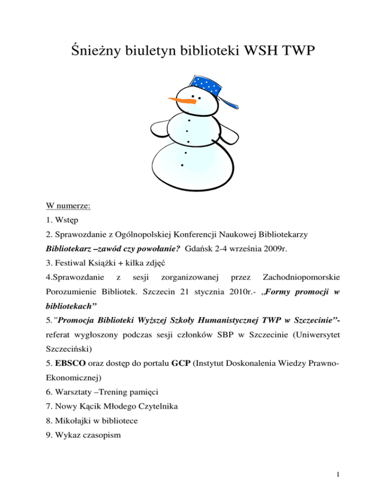 Śnieżny biuletyn biblioteki WSH TWP W numerze: 1. Wstęp 2. Sprawozdanie z Ogólnopolskiej Konferencji Naukowej Bibliotekarzy Bibliotekarz –zawód czy powołanie? Gdańsk 2-4 września 2009r. 3. Festiwal Książki + kilka zdjęć 4.Sprawozdanie z sesji zorganizowanej przez Zachodniopomorskie Porozumienie Bibliotek. Szczecin 21 stycznia 2010r.- „Formy promocji w bibliotekach” 5.”Promocja Biblioteki Wyższej Szkoły Humanistycznej TWP w Szczecinie”referat wygłoszony podczas sesji członków SBP w Szczecinie (Uniwersytet Szczeciński) 5. EBSCO oraz dostęp do portalu GCP (Instytut Doskonalenia Wiedzy PrawnoEkonomicznej) 6. Warsztaty –Trening pamięci 7. Nowy Kącik Młodego Czytelnika 8. Mikołajki w bibliotece 9. Wykaz czasopism 1 To już 21 spotkanie z Państwem na łamach biuletynu. Hu, hu, ha-zima zła! A my gorąco i serdecznie witamy po raz kolejny na łamach naszego Biuletynu. Grono korzystających z naszej biblioteki to blisko 7500 czytelników mających do dyspozycji ponad 32500 książek. Rozwijamy się bardzo intensywnie i zawsze z myślą o naszych czytelnikach. Biuletyn umożliwia Państwu zapoznanie się z innymi elementami pracy w bibliotece, która często kojarzy się czytelnikom tylko z wypożyczeniem książki. Przewodnim tematem tego wydania jest Public Relations bibliotek. Tradycyjnie biuletyn kończy wykaz czasopism prenumerowanych na bieżąco. Naszym Czytelnikom życzymy miłego korzystania z naszej biblioteki i jej zasobów . Zapraszamy do czytania i oglądania! Redaguje zespół: Marta Wiśniewska (redaktor prowadzący), Anna Skotarczak, Izabela Kumor, Joanna Siniakiewicz, Zdjęcia: Marcin Zieliński( i nie tylko) 2 Sprawozdanie z Ogólnopolskiej Konferencji Naukowej Bibliotekarzy Bibliotekarz –zawód czy powołanie? Gdańsk 2-4 września 2009r. Pierwszego dnia Konferencji odbyły się wybory nowego Zarządu Sekcji Bibliotek Szkół Wyższych Niepaństwowych przy Stowarzyszeniu Bibliotekarzy Polskich. Na to zebranie zostałam zaproszona na podstawie listy skompletowanej z meilowej ankiety, rozesłanej do wszystkich biblioteka szkół wyższych niepaństwowych. Wybrano nowego przewodniczącego, którym został Stefan Kubów z Biblioteki DSW Wrocław oraz dziesięcioosobowy Zarząd, w którego skład także weszłam. Opisane zostało to w ISBNiku, który dołączam do niniejszego sprawozdania. Po obradach kolacja szantowa na skraju plaży zrobiła dobry wstęp do pracowitego dnia następnego. Pierwsze cztery referaty Konferencji skupione były wokół tematyki zawodu bibliotekarza w aspektach motywacji i determinantów wyboru. Poruszenie wywołały dwa referaty przedstawicieli Biblioteki Uniwersytetu Szczecińskiego: Daniela Ziarkowskiego Bibliotekarz- zawód dla wybranych? i Mirosławy Różyckiej i Urszuli Ganakowskiej Parapsychologiczne determinanty wyboru zawodu bibliotekarzy. W drugiej sesji świetnie wystąpiła Maja Wojciechowska z Ateneum w Gdańsku z referatem Zarządzanie rozwojem kompetencji kadry zawodowej bibliotek. W części rekreacyjnej odbyło się zwiedzanie Gdańska, rejs do Westerplatte i kolacja na Starówce. Obrady następnego dnia obfitowały aż w piętnaście referatów. Na uwagę zasługiwało opracowanie gospodyni Konferencji Sylwii Baranowskiej nt. Bibliotekarz w oczach studentów Wyższej Szkoły Zarządzania w Gdańsku, oparte na bardzo ciekawej ankiecie. Mój referat pt. Wizerunek bibliotekarza w odbiorze społeczności akademickiej. Refleksje z pracy Biblioteki Wyższej Szkoły Humanistycznej TWP w Szczecinie był prezentowany jako trzynasty z kolei. Przyjęto go pozytywnie. Do końca obrad omawiany był jeszcze stres w zawodzie bibliotekarzy, koherencja w zawodzie bibliotekarza i powinności bibliotekarzy. Dwa ostatnie tematy omawiali przedstawiciele Biblioteki DSW z Wrocławia. W trakcie obrad prezentowali się także sponsorzy np. MOL-VULCAN (programy komputerowe), LIFT (meble biblioteczne), EMERALD (bazy bibliograficzne). Uważam, że Konferencja była wyjątkowo trafiona jeśli chodzi o tematykę i materiały pomocnicze (np. ankiety) i wykorzystam to doświadczenie w pracy w nowym roku akademickim. oprac. Anna Skotarczak 3 Festiwal Książki Akademickiej i Szkolnej na II Zachodniopomorskim Kongresie Edukacyjnym w Szczecinie. W dniach 19-20 października 2009r. Biblioteka Wyższej Szkoły Humanistycznej TWP w Szczecinie miała zaszczyt zorganizowania Festiwalu Książki Akademickiej i Szkolnej na II Zachodniopomorskim Kongresie Edukacyjnym w Szczecinie, jako imprezę towarzyszącą Kongresowi. Było to prestiżowe przedsięwzięcie skierowane do społeczeństwa wiedzy promujące nie tylko słowo pisane, czytelnictwo, ale również Bibliotekę oraz Uczelnię i nasz region. Współczesna biblioteka jest nie tylko miejscem, gdzie przechowywane są i udostępniane zbiory. Do zadań bibliotek należy kształtowanie kultury czytelniczej, szerzenie w społeczeństwie nawyku sięgania po książkę, oraz pomoc jej użytkownikom w szeroko rozumianym rozwoju. Czytelnictwo, jako jedna z form komunikacji społecznej, jest ważnym wskaźnikiem zapotrzebowania ludzi na informację.1 Czytanie jest życiowa koniecznością. To lektury, to książka, umożliwiają rozumienie kontekstów globalnych i lokalnych oraz tego, co się dzieje wokół nas.2 Niezbędne zatem jest wzmacnianie nawyków czytelniczych, wspomaganie edukacji indywidualnej, samokształcenia.3 Chodzi więc o to, by u progu XXI wieku czytelnictwo, zwłaszcza książek, było traktowane jako jeden z ważniejszych czynników rozwoju cywilizacyjnego społeczeństw na całym świecie. Biblioteki mają w tym 1 Rola biblioteki naukowej w tworzeniu społeczeństwa wiedzy, pod red. Zdzisławy DackoPikiewicz, Marzeny Chmielarskiej, wydaw. Wyższa Szkoła Biznesu w Dąbrowie Górniczej, Dąbrowa Górnicza 2005r., s.30 2 Tamże, s.30 3 Tamże, s.31 4 swój udział. Dokonuje się tego poprzez organizowanie różnego typu imprez kulturalnych, spotkań z ciekawymi ludźmi oraz zac