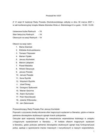 Protokół Nr VI/07 Z VI sesji III kadencji Rady Powiatu Zduńskowolskiego odbytej w dniu 30 marca 2007 r. w sali konferencyjnej Urzędu Miasta Zduńska Wola ul. Złotnickiego12 w godz.: 10.00 -13.00. Ustawowa liczba Radnych - 19 Stan faktyczny Radnych - 19 Obecnych na sesji Radnych - 19 Obecni na sesji radni: 1. Maria Adamiak 2. Elżbieta Andruszkiewicz 3. Tomasz Filipowski 4. Marian Fijołek 5. Janusz Kochelski 6. Marcin Łabędzki 7. Paweł Mataśka 8. Witold Oleszczyk 9. Janusz Parada 10. Janusz Pawęta 11. Ilona Rychlik 12. Wojciech Rychlik 13. Józef Śnieg 14. Grzegorz Śpikowski 15. Marian Szturma 16. Adam Synowiec 17. Piotr Warchlewski 18. Jolanta Witkowska 19. Jan Zaborowski Przewodniczący Rady Powiatu Pan Janusz Kochelski Poprosił o uczczenie chwilą milczenia ofiar tragicznych wydarzeń w Sieradzu, gdzie w trakcie pełnienia obowiązków służbowych zginęło trzech policjantów. Odczytał apel wojewody łódzkiego do mieszkańców województwa łódzkiego w związku z tragicznymi wydarzeniami w Sieradzu. „ W hołdzie ofiarom tragicznych wydarzeń w Sieradzu, gdzie podczas pełnienia obowiązków służbowych zginęli trzej funkcjonariusze policji, apeluje o ograniczenie imprez masowych i rozrywkowych w naszym województwie. 1 Zwracam się do wszystkich mieszkańców województwa łódzkiego, by poprzez godną postawę uczcili pamięć tragicznie zmarłych policjantów, a także uszanowali uczucia ich rodzin, bliskich i znajomych. Oddając hołd ofiarom, łącze się w bólu z ich najbliższymi. Jednocześnie wyrażam swoją solidarność ze wszystkimi policjantami Garnizonu Łódż”. Punkt 1 Otwarcie posiedzenia Otwarcia VI sesji III kadencji Rady Powiatu Zduńskowolskiego dokonał Przewodniczący Rady Powiatu Pan Janusz Kochelski witając Radnych i przybyłych gości. Komendant Powiatowej Państwowej Straży Pożarnej w Zduńskiej Woli Pan Paweł Stępień przedstawił olimpijczyka, starszego ogniomistrza Andrzeja Kuchnickiego - trzykrotnego mistrza świata w Mistrzostwach Świata Strażaków i Policjantów. Andrzej Kuchnicki wielokrotnie uczestniczył w zawodach sportowych w kraju i zagranicą. Od 2003 roku uczestniczy, w organizowanych co dwa lata, Mistrzostwach Świata Strażaków i Policjantów. W 2003 roku w Barcelonie zdobył srebrny medal w pchnięciu kulą, w 2005 roku Quebec - złoty medal w pchnięciu kulą. W 2007 roku w Adelajdzie – 3 złote medale: w pchnięciu kulą, w rzucie dyskiem i w rzucie młotem. Niecodzienna tężyzna fizyczna przydaje mu się niejednokrotnie w czasie akcji ratowniczogaśniczych. Wszyscy w komendzie kibicujemy mu podczas zawodów sportowych, a kiedy jest z nami w akcji wiemy, że możemy zawsze na niego liczyć. Za swoje osiągnięcia został uhonorowany Brązowym Krzyżem Zasługi oraz srebrną odznaką Zasłużony dla Ochrony Przeciwpożarowej. Jego postawa przyczynia się również do rozsławienia naszego powiatu. Starosta Pan Wojciech Rychlik Proszę o przyjęcie gratulacji oraz wyrazów szczerego uznania za zdobycie tytułów: Mistrza Świata w rzucie młotem, Mistrza Świata w rzucie dyskiem oraz Mistrza Świata w pchnięciu kulą podczas XII Mistrzostw Świata Policjantów i Strażaków w Adelajdzie w Australii. Tak wyjątkowe wyniki sportowe świadczą o niespotykanym talencie, wzorowej postawie w rywalizacji sportowej, ogromnej pracy oraz wytrwałości w dążeniu do wyznaczonego celu. Dziękując za promocję powiatu zduńskowolskiego w dalekiej Australii życzę satysfakcji czerpanej z uprawiania sportu, sukcesów w pracy zawodowej oraz wiele dobra w życiu osobistym. Punkt 2 Przyjęcie proponowanego porządku obrad. 2 Przewodniczący Rady Pan Janusz Kochelski poinformował, iż wpłynął wniosek Starosty Zduńskowolskiego o rozszerzenie porządku obrad o pkt 22 a w brzmieniu „Podjęcie uchwały Rady Powiatu w sprawie w sprawie zmian w Uchwale Nr III/23/06 Rady Powiatu Zduńskowolskiego z dnia 29 grudnia 2006 r. w sprawie uchwalenia budżetu na rok 2007, Dz. 710”. Rada Powiatu jednogłośnie (ogółem 17 głosów) przyjęła proponowaną zmianę w porządku obrad. Proponowany porządek obrad: 1. Otwarcie VI sesji Rady Powiatu Zduńskowolskiego i stwierdzenie prawomocności obrad. 2. Ustalenie porządku dziennego obrad. 3. Przyjęcie protokołu z V sesji III kadencji Rady Powiatu Zduńskowolskiego. 4. Informacja Przewodniczącego Rady Powiatu Zduńskowolskiego i Starosty Zduńskowolskiego o działaniach podejmowanych od ostatniej sesji. 5. Powołanie Komisji Uchwał. 6. Interpelacje i zapytania Radnych. 7. Wnioski i oświadczenia Radnych. 8. Przyjęcie Informacji o stanie bezpieczeństwa i porządku publicznego oraz skuteczności działania Komendy Powiatowej Policji w Zduńskiej Woli za 2006 r. 9. Przyjęcie Sprawozdania Starosty z realizacji programu zapobiegania przestępczości oraz ochrony bezpieczeństwa obywateli i porządku publicznego „Bezpieczny Powiat Zduńskowolski w latach 2004-2006” za rok 2006. 10. Przyjęcie Informacji Państwowego Powiatowego Inspektora Sanitarnego o stanie bezpieczeństwa sanitarnego powiatu zduńskowolskiego za rok 2006. 11. Przyjęcie Sprawozdania z wykonania planu finansowego Samodzielnego Publicznego Zespołu Opieki Zdrowotnej w Zduńskiej Woli za 2006 rok, uwzględniające w szczególności stan należności i zobowiązań, w tym wymagalnych. 12. Przyjęcie Sprawozdania Starosty Zduńskowolskiego z wykonania zadań i gospodarowania Powiatowym Funduszem Gospodarki Zasobem Geodezyjnym i Kartograficznym za 2006 r. 13. Podjęcie uchwały Rady przeprowadzającego Powiatu badanie w sprawie sprawozdania wyboru biegłego finansowego za rewidenta rok 2006 Samodzielnego Publicznego Zespołu Opieki Zdrowotnej w Zduńskiej Woli. 14. Przyjęcie Sprawozdania Powiatowego Urzędu Pracy w Zduńskiej Woli za rok 2006. 15. Podjęcie uchwały Rady Powiatu w sprawie zgłoszenia kandydatów powiatu na członków 3 Powiatowej Rady Zatrudnienia w Zduńskiej Woli. 16. Podjęcie uchwały Rady 