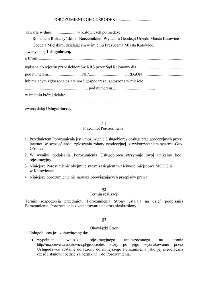 POROZUMIENIE GEO OŚRODEK nr ................................ zawarte w dniu ...................... w Katowicach pomiędzy: Romanem Rohaczyńskim - Naczelnikiem Wydziału Geodezji Urzędu Miasta Katowice Geodetą Miejskim, działającym w imieniu Prezydenta Miasta Katowice. zwany dalej Usługodawcą, a firmą ........................................................................................................................................... wpisaną do rejestru przedsiębiorców KRS przez Sąd Rejonowy dla.............................................. pod numerem ................................ NIP ................................... , REGON ........................................ lub mającym zgłoszoną działalność gospodarczą, zgłoszoną w mieście ............................................................ pod numerem ........................................ w imieniu której działa: ........................................................................................ zwaną dalej Usługobiorcą. §1 Przedmiot Porozumienia 1. Przedmiotem Porozumienia jest umożliwienie Usługobiorcy obsługi prac geodezyjnych przez internet w szczególności zgłoszenia roboty geodezyjnej, z wykorzystaniem systemu Geo Ośrodek. 2. W wyniku podpisania Porozumienia Usługobiorca otrzymuje swój unikalny kod rejestracyjny. 3. Niniejsze Porozumienie obejmuje swym zasięgiem właściwość miejscową MODGiK w Katowicach. 4. Niniejsze porozumienie nie narusza obowiązujących przepisów prawa. §2 Termin realizacji Termin rozpoczęcia przedmiotu Porozumienia Strony ustalają na dzień podpisania Porozumienia. Porozumienie zostaje zawarta na czas nieokreślony. §3 Obowiązki Stron 1. Usługobiorca jest zobowiązany do: a) wypełnienia wniosku rejestracyjnego umieszczonego na stronie http://mapserver.um.katowice.pl/geoosrodek który po jego wydrukowaniu przez Usługodawcę zostanie dołączony do niniejszego Porozumienia jako jej nieodłączna część i stanowił będzie załącznik nr 1 do Porozumienia. b) założenia sobie samodzielnie w systemie Geo-Ośrodek loginu i hasła składającego się z co najmniej 5 znaków (cyfr oraz małych i dużych liter). c) nie udostępniania kodu rejestracyjnego, loginu i hasła osobom trzecim oraz do ich zabezpieczenia w sposób uniemożliwiający pozyskanie i wykorzystanie ich przez osoby trzecie. d) zgłaszania prac geodezyjnych za pośrednictwem systemu Geo-Ośrodek. e) wykorzystania danych pobranych poprzez system Geo-Ośrodek wyłącznie do celów wynikających z przepisów ustawy z dnia 17 maja 1989 r. Prawo Geodezyjne i kartograficzne oraz aktów wykonawczych do w/w ustawy oraz do nie udostępniania ich osobom trzecim. f) zapewnienia sprzętu o minimalnej konfiguracji niezbędnej do prawidłowego działania systemu Geo-Ośrodek wskazanej w załączniku nr 2 do niniejszego Porozumienia. g) posiadania legalnego oprogramowania, a w szczególności systemu operacyjnego, umożliwiającego dostęp do Internetu poprzez przeglądarkę stron www, która będzie wykorzystywana do pracy z użyciem systemu Geo-Ośrodek. 2. Usługodawca jest zobowiązany do: a) przekazania Usługobiorcy unikalnego kodu rejestracyjnego do systemu Geo-Ośrodek niezwłocznie po podpisaniu Porozumienia. b) przekazania Usługobiorcy instrukcji użytkowania sytemu Geo-Ośrodek, stanowiącej załącznik nr 2 do niniejszego Porozumienia. Przedmiotowa Instrukcja jest również możliwa do pobrania ze strony http://mapserver.um.katowice.pl/geoosrodek. c) zapewnienia funkcjonowania systemu Geo-Ośrodek oraz do usuwania zgłaszanych przez Usługobiorcę awarii systemu. Zgłoszenia należy przesyłać drogą elektroniczną do administratora systemu na adres [email protected], wraz z opisem stwierdzonej awarii oraz danymi umożliwiającymi identyfikację zgłaszającego. d) umieszczania na stronie http://mapserver.um.katowice.pl/geoosrodek informacji o braku dostępności systemu np. z powodu awarii, czy w związku z pracami konserwacyjnymi w przypadku podjęcia takiej informacji. 1. 2. 3. 4. §4 Warunki płatności W ramach zgłoszonej pracy geodezyjnej Usługobiorca ma możliwość bezpłatnego podglądu oraz pobrania wszelkich danych udostępnionych przez Usługodawcę poprzez system Geo-Ośrodek, niezbędnych do wykonania zgłoszonej pracy geodezyjnej. Za pobrane przez Usługobiorcę poprzez system Geo-Ośrodek materiały Usługobiorca, naliczy opłatę zgodnie z aktualnie obowiązującymi w tym zakresie przepisami. Osobne opłaty naliczane w oparciu o aktualnie obowiązujące w tym zakresie akty prawa miejscowego za nośnik danych - informatyczny bądź papierowy naliczane są od Usługobiorcy, jedynie w przypadku materiałów udostępnianych przez Ośrodek Dokumentacji Geodezyjnej i Kartograficznej bez pośrednictwa Internetu, wzorem opłat za materiały przygotowywane do zgłoszeń prac geodezyjnych przekazywanych przez wykonawców prac geodezyjnych metodą tradycyjną. W sytuacji zalegania przez Usługobiorcę z płatnościami za pobrane materiały z systemu Geo-Ośrodek Usługodawca ma prawo zablokować w systemie konto Usługobiorcy. 1. 2. 3. 4. 1. 2. 3. §5 Zmiana lub wypowiedzenie Porozumienia Usługodawca zastrzega sobie prawo do wypowiedzenia Porozumienia ze skutkiem natychmiastowym, bez podawania powodów. Zmiana warunków Porozumienia może nastąpić w formie aneksu. Nie podpisanie przez Usługobiorcę aneksu do Porozumienia w terminie 7 dni od daty jego doręczenia jest równoznaczne z wypowiedzeniem Porozumienia. Zmiany w Porozumieniu wynikające ze zmiany przepisów prawa, w szczególności dotyczące wysokości opłat za udostępniane informacje, nie wymagają sporządzania aneksu do niniejszego Porozumienia. Wypowiedzenie Porozumienia powinno nastąpić w formie pisemnej pod rygorem nieważności takiego oświadczenia. Naruszenie któregokolwiek z punktów c), d) lub e) z § 3 ust. 1 lit. skutkuje rozwiązaniem Porozumienia z jej mocy, w trybie natychmiastowym, w zw