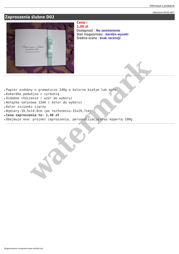 Informacje o produkcie Utworzono 04-03-2017 Zaproszenia ślubne D02 Cena : 1,40 zł ● ● ● ● ● ● ● Papier ozdobny o gramaturze 240g w kolorze białym lub ecru Kokardka podwójna z cyrkonią Ozdobne tłoczenie ( wzór do wyboru) Wstążka satynowa 12mm ( kolor do wyboru) Kolor czcionki czarny Wymiary:10,5x14,8cm (po rozłożeniu:15x29,7cm) Cena zaproszenia to: 1,40 zł Obejmuje ona: projekt zaproszenia, personalizację oraz kopertę 100g w at ● er m ar k Dostępność : Na zamówienie Stan magazynowy : bardzo wysoki Średnia ocena : brak recenzji Wygenerowano w programie www.oscGold.com