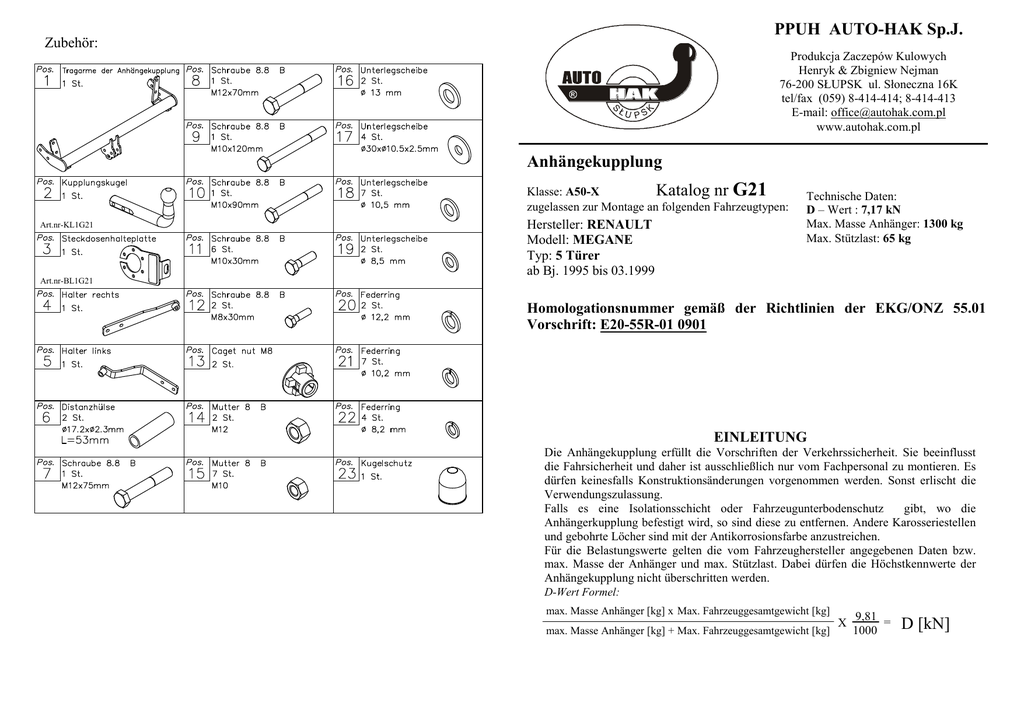 PPUH AUTO-HAK Sp.J. Zubehör: Produkcja Zaczepów Kulowych Henryk & Zbigniew Nejman 76-200 SŁUPSK ul. Słoneczna 16K tel/fax (059) 8-414-414; 8-414-413 E-mail: [email protected] www.autohak.com.pl Anhängekupplung G21 Klasse: A50-X Katalog nr zugelassen zur Montage an folgenden Fahrzeugtypen: Art.nr-KL1G21 Hersteller: RENAULT Modell: MEGANE Typ: 5 Türer ab Bj. 1995 bis 03.1999 Technische Daten: D – Wert : 7,17 kN Max. Masse Anhänger: 1300 kg Max. Stützlast: 65 kg Art.nr-BL1G21 Homologationsnummer gemäß der Richtlinien der EKG/ONZ 55.01 Vorschrift: E20-55R-01 0901 EINLEITUNG Die Anhängekupplung erfüllt die Vorschriften der Verkehrssicherheit. Sie beeinflusst die Fahrsicherheit und daher ist ausschließlich nur vom Fachpersonal zu montieren. Es dürfen keinesfalls Konstruktionsänderungen vorgenommen werden. Sonst erlischt die Verwendungszulassung. Falls es eine Isolationsschicht oder Fahrzeugunterbodenschutz gibt, wo die Anhängerkupplung befestigt wird, so sind diese zu entfernen. Andere Karosseriestellen und gebohrte Löcher sind mit der Antikorrosionsfarbe anzustreichen. Für die Belastungswerte gelten die vom Fahrzeughersteller angegebenen Daten bzw. max. Masse der Anhänger und max. Stützlast. Dabei dürfen die Höchstkennwerte der Anhängekupplung nicht überschritten werden. D-Wert Formel: max. Masse Anhänger [kg] x Max. Fahrzeuggesamtgewicht [kg] max. Masse Anhänger [kg] + Max. Fahrzeuggesamtgewicht [kg] X 9,81 = 1000 D [kN] MONTAGE - und BETRIEBSANLEITUNG DER ANHÄNGEKUPPLUNG Anbauanleitung 10 6 4 A 13 C 12 C 5 A A 1 6 8 11 7 17 9 B 17 3 2 11 1. Die verdeckten Löcher (obere Löcher der Anhängerkupplung) im hinteren Teil des Fahrzeuges links und rechts finden, dann frei machen und die Korbmuttern M8 (Pos.15) einsetzen. 2. Die Tragarme der Anhängerkupplung (Pos.1) an das Fahrzeug von unten anlegen und durch die Löcher (Pos.A) mit den Schrauben M8x30mm (Pos.12) und M10x30mm (Pos.11) verschrauben. Dabei die großen Unterlegscheiben (Pos. 17) verwenden. 3. Die mitgelieferten Distanzhülsen (Pos.6) von außen in die originalen Löcher in den Längsträger einsetzen. 4. Die Seitenhalter (Pos. 4 u. 5) an die montierten Tragarme der Anhängerkupplung (Pos.1) durch die Löcher (Pos. B) mit den Schrauben M10x30mm (Pos.11) verschrauben. 5. Durch die vorher in den Längsträgern montierten Distanzhülsen und durch die Löcher (Pos.C) mit den mitgelieferten Schrauben M10x120mm (Pos.9) und M10x90mm (Pos.10) verschrauben. 6. Die Kupplungskugel der Anhängerkupplung (Pos.2) mit den mitgelieferten Schrauben M12x75mm (Pos.7) und M12x70mm (Pos.8) verschrauben. Den Steckdosenhalter (Pos.3) mit der ersten der Schrauben verschrauben. Siehe Zeichnung. 7. Die Elektroinstallation gemäß der Anschlussanleitung des Herstellers anschließen. 8. Falls nötig, den beschädigten Farbanstrich ausbessern. Die Anhängekupplung (Katalognummer G21) ist für folgende Fahrzeugtypen zugelassen: RENAULT MEGANE I, 5 Türer, ab Bj. 1995 bis 03.1999, dient zum ziehen der Anhänger mit der Gesamtlast von 1300 kg und der Kugelstützlast von max.65 kg. Drehmomente für Schrauben und Muttern 8.8: M6 - 11 Nm M 8 - 25 Nm M 10 - 50 Nm M 12 - 87 Nm M 14 - 138 Nm M16 - 210 Nm ACHTUNG VON DEM HERSTELLER Die Zuverlässigkeit der Anhängekupplung ist jedoch auch von der ordnungsgemäßen Montage und der richtigen Nutzung abhängig. Daher werden Sie gebeten, sorgfältig die folgende Montageanleitung zu lesen und sich an die entsprechenden Anweisungen zu beachten. Die Anhängekupplung muss an den vom Fahrzeughersteller vorgeschriebenen Befestigungsstellen montiert werden. Nach dem Anbau der Anhängekupplung sind die nationalen Vorschriften zur Anbauabnahme und zur Änderung der Fahrzeugpapiere zu beachten. Das Fahrzeug sollte mit seitlichen Blinkern und Rückspiegeln, deren Abstand mindestens der Anhängerbreite entspricht, ausgestattet werden. Alle Befestigungsschrauben sind nach ca. 1 000 km Anhängerbetrieb zu prüfen und nachzuziehen. Die Kugel der Anhängekupplung ist sauber zu halten und zu fetten. (D) (CZ) (F) (GB) (PL) (SK) Der Freiraum nach Anhang VII, Abbildung 30 der Richtlinie 94/20/EG ist zu gewährleisten. Volný prostor ve smyslu Přílohy VII,obr. 30 Směrnice č. 94/20/EG musí být zaručen. L´espace libre doit être garanti conformément à ľannexe VII, illustracion 30 de la directive 94/20/ CE. The clearance specified in apendix VII, diagram 30 of guideline 94/20/EC must be guaranteed. Zagwarantować swobodną przestrzeń zgodnie z załącznikiem VII, rysunek 30 dyrektywy 94/20/CE. Volný priestor v zmysle Prílohy VII, obr. 30 Smernice 94/20/EC musí byť zaručená. (D) (CZ) (F) (GB) (PL) (SK) * bei zulässigem Gesamtgewicht des Fahrzeuges * při celkové přípustné hmotnosti vozidla * pour poids total en charge autorizé du véhicule * at gross vehicle weight rating * przy dopuszczalnym ciężarze całkowitym pojazdu * pri celkovej prípustnej hmotnosti vozidla FITTING INSTRUCTION Clamp mark in acc. with ISO PN 1 L 2 + 3 31 4 R 5 58R 6 54 7 58L The instruction of the assembly Cables joining 10 Left directional lights Rear fog lights Ground Right directional lights Right side parking lights Stoplights Left side parking lights 6 4 A 13 C 12 C A A 5 1 6 8 11 7 17 9 B 17 3 2 11 This towing hitch is designed to assembly in following cars: RENAULT MEGANE I, 5 doors, produced since 1995 till 03.1999, catalogue no. G21 and is prepared to tow trailers max total weight 1300 kg and max vertical load 65 kg. From manufacturer Thank you for buying our product. Their reliability has been confirmed in many tests. Reliability of towing hitch depends also on correct assembly and right operation. For this reasons we kindly ask to read carefully this instruction and apply to hints. The towing hitch should be install in points described by a car producer. 1. Underside the car (in the rear panel) find plugged holes on the right and left side, then make them available and put round cage nut together with M8 nut (po