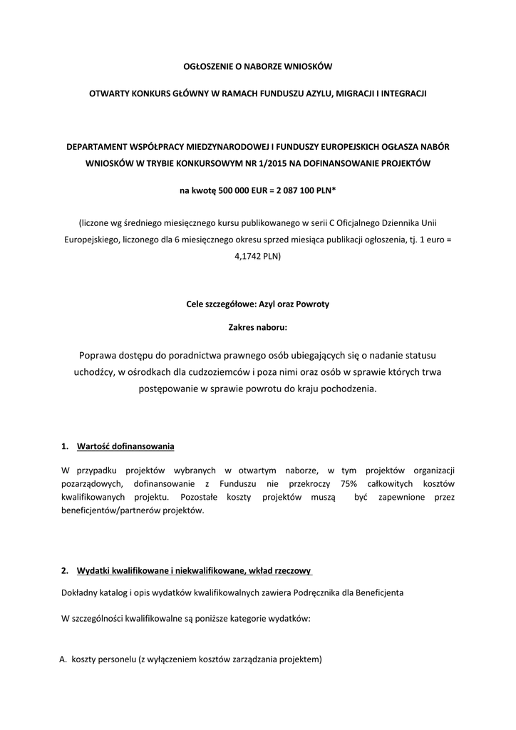 OGŁOSZENIE O NABORZE WNIOSKÓW OTWARTY KONKURS GŁÓWNY W RAMACH FUNDUSZU AZYLU, MIGRACJI I INTEGRACJI DEPARTAMENT WSPÓŁPRACY MIEDZYNARODOWEJ I FUNDUSZY EUROPEJSKICH OGŁASZA NABÓR WNIOSKÓW W TRYBIE KONKURSOWYM NR 1/2015 NA DOFINANSOWANIE PROJEKTÓW na kwotę 500 000 EUR = 2 087 100 PLN* (liczone wg średniego miesięcznego kursu publikowanego w serii C Oficjalnego Dziennika Unii Europejskiego, liczonego dla 6 miesięcznego okresu sprzed miesiąca publikacji ogłoszenia, tj. 1 euro = 4,1742 PLN) Cele szczegółowe: Azyl oraz Powroty Zakres naboru: Poprawa dostępu do poradnictwa prawnego osób ubiegających się o nadanie statusu uchodźcy, w ośrodkach dla cudzoziemców i poza nimi oraz osób w sprawie których trwa postępowanie w sprawie powrotu do kraju pochodzenia. 1. Wartość dofinansowania W przypadku projektów wybranych w otwartym naborze, w tym projektów organizacji pozarządowych, dofinansowanie z Funduszu nie przekroczy 75% całkowitych kosztów kwalifikowanych projektu. Pozostałe koszty projektów muszą być zapewnione przez beneficjentów/partnerów projektów. 2. Wydatki kwalifikowane i niekwalifikowane, wkład rzeczowy Dokładny katalog i opis wydatków kwalifikowalnych zawiera Podręcznika dla Beneficjenta W szczególności kwalifikowalne są poniższe kategorie wydatków: A. koszty personelu (z wyłączeniem kosztów zarządzania projektem) B. C. D. E. F. G. H. I. J. K. wolontariat koszty transportu, podróży i utrzymania sprzęt i wyposażenie nieruchomości (zakup, budowa, remont, najem, usługi ogólne) towary zużywające się i zaopatrzenie, inne wydatki drobne usługi zewnętrzne informacje, publikacje i promocja inne koszy bezpośrednie koszty niestanowiące podstawy obliczenia kosztów pośrednich koszty pośrednie Koszty pośrednie Kalkulację kosztów pośrednich w projektach dokonuje się w sposób określony w rozdziale 3.12 Podręcznika dla Beneficjenta Wkład rzeczowy W przypadku projektów wdrażanych przez organizacje pozarządowe wkład rzeczowy w formie nieodpłatnej dobrowolnej pracy – wolontariatu. Zasady kwalifikowalności wkładu rzeczowego zostały określone w rozdziale 3.3 Podręcznika dla Beneficjenta. 3. System przepływów finansowych Państwowe Jednostki Budżetowe Wydatki państwowych jednostek budżetowych objęte zostaną w całości prefinansowaniem z budżetu państwa. Podmioty niebędące państwowymi jednostkami budżetowymi Pierwsza płatność zaliczki - Beneficjent składa wniosek o pierwszą zaliczkę do Organu Delegowanego w terminach określonych w zawartej Umowie. Druga płatność zaliczki - może być przekazana, jeżeli Beneficjent rozliczy w raporcie kwartalnym za pierwszy kwartał realizacji Projektu min. 70% wydatków planowanych w pierwszym kwartale. Jeżeli wydatki rozliczone w pierwszym kwartale realizacji Projektu nie osiągną progu 70% wydatków planowanych w tym kwartale Beneficjent może złożyć raport dodatkowy za kolejne miesiące realizacji Projektu, jeżeli w tym okresie osiągnie próg 70% wydatków planowanych w pierwszym kwartale. Trzecia płatność zaliczki - może być przekazana, jeżeli Beneficjent rozliczy w raportach kwartalnych za drugi i trzeci kwartał realizacji Projektu min. 70% wydatków planowanych w tych kwartałach. Jeżeli wydatki rozliczone w drugim i trzecim kwartale realizacji Projektu nie osiągną progu 70% wydatków planowanych w tych kwartałach Beneficjent może złożyć raport dodatkowy za kolejne miesiące realizacji Projektu, jeżeli w tym okresie osiągnie próg 70% wydatków planowanych w kwartałach drugim i trzecim. Czwarta i następne płatności zaliczki - czwarta i następne płatności zaliczki wypłacane są w sposób analogiczny do zaliczki trzeciej, tj. zaliczka na kwartały n i n+1 może być przekazana, jeżeli Beneficjent rozliczy w raportach kwartalnych za kwartały n-2 i n-3 realizacji Projektu min. 70% wydatków planowanych w tych kwartałach, z uwzględnieniem możliwości składania raportów dodatkowych. 4. Okres kwalifikowalności wydatków ‒ Początkowa data kwalifikowalności wydatków to 1 lipca 2015 r. ‒ Końcowa data kwalifikowalności wydatków nie może wykraczać poza dzień 31 grudnia 2022 r. Uwaga! Maksymalny czas realizacji projektu dla tego naboru to 12 miesięcy 5. Ocena projektów Ocena formalna Wnioski o dofinansowanie podlegają ocenie formalnej niezwłocznie po ich złożeniu do MSW przez ekspertów DWMiFE MSW przy użyciu Arkusza oceny formalnej, którego wzór został załączony do niniejszego ogłoszenia. Po stwierdzeniu braków lub błędów formalnych (np. niezgodność ze standardowym wnioskiem, brak odpowiednich załączników), technicznych (np. niewłaściwy czas trwania projektu) lub finansowych (np. niezgodność przedstawionego budżetu ze wzorem ) do wnioskodawcy wysyłane jest pismo z prośbą o korektę wniosku. Przesłana przez wnioskodawcę korekta nie może powodować zmiany merytorycznej zawartości wniosku . Wprowadzenie we wniosku zmian wykraczających poza prośbę o korektę skierowaną do wnioskodawcy może zostać potraktowane jako niedopuszczalna modyfikacja wniosku i skutkować jego odrzuceniem. Uwaga! Jeżeli uzupełnienie wniosku nie zmieni ogólnego układu dokumentu należy przysyłać jedynie zmienioną część wniosku. Jeżeli w terminie określonym w piśmie do wnioskodawcy korekta nie zostanie przesłana wniosek zostanie odrzucony. Odwołanie od oceny formalnej Wnioskodawca ma prawo do złożenia odwołania na tym etapie oceny. Odwołanie będzie rozpatrywane przez eksperta wybranego w drodze losowania z puli ekspertów wybranych do oceny projektów dla przedmiotowego naboru. W celu rozpatrzenia odwołania DWMiFE MSW analizuje wniosek pod względem kryteriów formalnych, biorąc pod uwagę argumentację Wnioskodawcy zawartą w odwołaniu. Po zakończonej ponownej ocenie Wnioskodawca jest informowany o wyniku rozpatrzenia odwołania. W przypadku uznania odwołania Wnioskodawcy i pozytywne