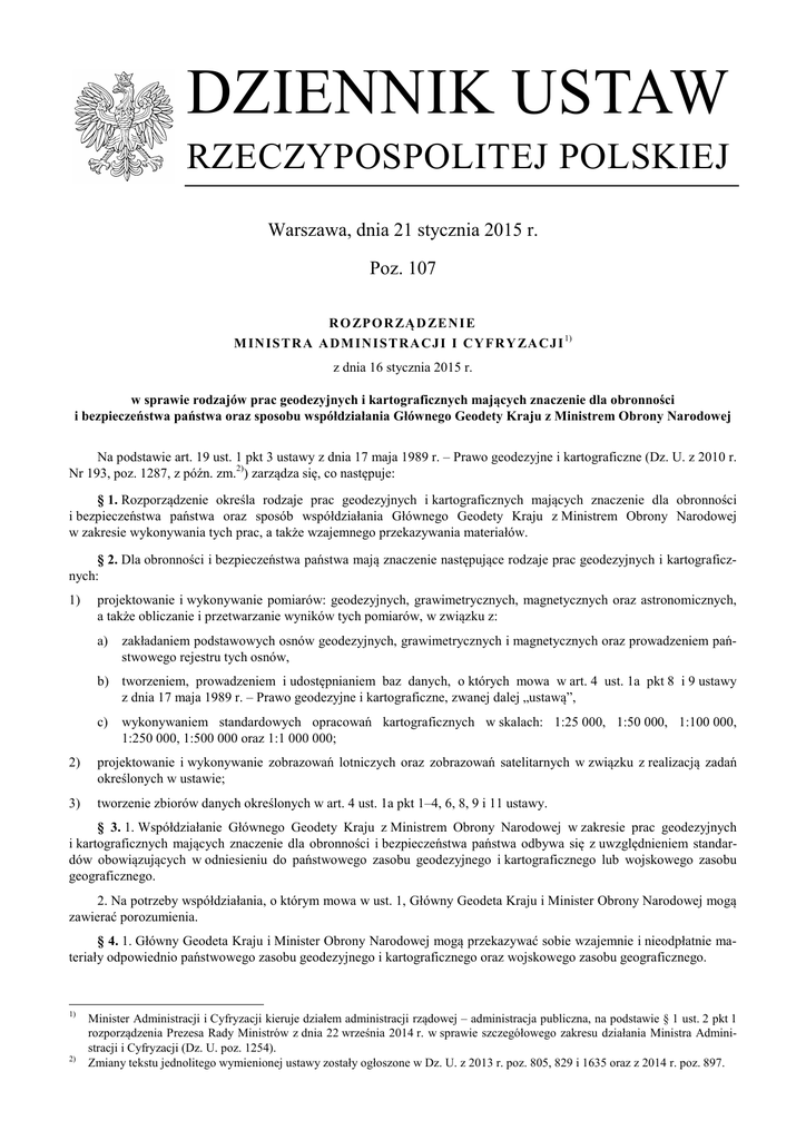 DZIENNIK USTAW RZECZYPOSPOLITEJ POLSKIEJ Warszawa, dnia 21 stycznia 2015 r. Poz. 107 RO ZPO R ZĄ D ZE N I E M INI S TR A A DM IN I S T RA CJ I I CY FR Y ZA CJ I 1) z dnia 16 stycznia 2015 r. w sprawie rodzajów prac geodezyjnych i kartograficznych mających znaczenie dla obronności i bezpieczeństwa państwa oraz sposobu współdziałania Głównego Geodety Kraju z Ministrem Obrony Narodowej Na podstawie art. 19 ust. 1 pkt 3 ustawy z dnia 17 maja 1989 r. – Prawo geodezyjne i kartograficzne (Dz. U. z 2010 r. Nr 193, poz. 1287, z późn. zm.2)) zarządza się, co następuje: § 1. Rozporządzenie określa rodzaje prac geodezyjnych i kartograficznych mających znaczenie dla obronności i bezpieczeństwa państwa oraz sposób współdziałania Głównego Geodety Kraju z Ministrem Obrony Narodowej w zakresie wykonywania tych prac, a także wzajemnego przekazywania materiałów. § 2. Dla obronności i bezpieczeństwa państwa mają znaczenie następujące rodzaje prac geodezyjnych i kartograficznych: 1) projektowanie i wykonywanie pomiarów: geodezyjnych, grawimetrycznych, magnetycznych oraz astronomicznych, a także obliczanie i przetwarzanie wyników tych pomiarów, w związku z: a) zakładaniem podstawowych osnów geodezyjnych, grawimetrycznych i magnetycznych oraz prowadzeniem państwowego rejestru tych osnów, b) tworzeniem, prowadzeniem i udostępnianiem baz danych, o których mowa w art. 4 ust. 1a pkt 8 i 9 ustawy z dnia 17 maja 1989 r. – Prawo geodezyjne i kartograficzne, zwanej dalej „ustawą”, c) wykonywaniem standardowych opracowań kartograficznych w skalach: 1:25 000, 1:50 000, 1:100 000, 1:250 000, 1:500 000 oraz 1:1 000 000; 2) projektowanie i wykonywanie zobrazowań lotniczych oraz zobrazowań satelitarnych w związku z realizacją zadań określonych w ustawie; 3) tworzenie zbiorów danych określonych w art. 4 ust. 1a pkt 1–4, 6, 8, 9 i 11 ustawy. § 3. 1. Współdziałanie Głównego Geodety Kraju z Ministrem Obrony Narodowej w zakresie prac geodezyjnych i kartograficznych mających znaczenie dla obronności i bezpieczeństwa państwa odbywa się z uwzględnieniem standardów obowiązujących w odniesieniu do państwowego zasobu geodezyjnego i kartograficznego lub wojskowego zasobu geograficznego. 2. Na potrzeby współdziałania, o którym mowa w ust. 1, Główny Geodeta Kraju i Minister Obrony Narodowej mogą zawierać porozumienia. § 4. 1. Główny Geodeta Kraju i Minister Obrony Narodowej mogą przekazywać sobie wzajemnie i nieodpłatnie materiały odpowiednio państwowego zasobu geodezyjnego i kartograficznego oraz wojskowego zasobu geograficznego. 1) 2) Minister Administracji i Cyfryzacji kieruje działem administracji rządowej – administracja publiczna, na podstawie § 1 ust. 2 pkt 1 rozporządzenia Prezesa Rady Ministrów z dnia 22 września 2014 r. w sprawie szczegółowego zakresu działania Ministra Administracji i Cyfryzacji (Dz. U. poz. 1254). Zmiany tekstu jednolitego wymienionej ustawy zostały ogłoszone w Dz. U. z 2013 r. poz. 805, 829 i 1635 oraz z 2014 r. poz. 897. Dziennik Ustaw –2– Poz. 107 2. Materiały, o których mowa w ust. 1, zostają włączone do państwowego zasobu geodezyjnego i kartograficznego albo wojskowego zasobu geograficznego z uwzględnieniem przepisów dotyczących odpowiednio gromadzenia materiałów w państwowym zasobie geodezyjnym i kartograficznym albo w wojskowym zasobie geograficznym. 3. Główny Geodeta Kraju i Minister Obrony Narodowej prowadzą na bieżąco, każdy w swoim zakresie, ewidencję przekazywanych wzajemnie opracowań i materiałów. § 5. 1. Główny Geodeta Kraju i Minister Obrony Narodowej informują się wzajemnie do dnia 31 października każdego roku o zamierzeniach na rok następny w zakresie wykonywania prac określonych w § 2. 2. Główny Geodeta Kraju i Minister Obrony Narodowej informują się wzajemnie do dnia 31 marca każdego roku o zakresie wykonania w roku poprzednim prac określonych w § 2. § 6. Rozporządzenie wchodzi w życie z dniem następującym po dniu ogłoszenia.3) Minister Administracji i Cyfryzacji: A. Halicki 3) Niniejsze rozporządzenie było poprzedzone rozporządzeniem Ministra Spraw Wewnętrznych i Administracji z dnia 26 maja 2010 r. w sprawie rodzajów prac geodezyjnych i kartograficznych mających znaczenie dla obronności i bezpieczeństwa państwa oraz współdziałania Służby Geodezyjnej i Kartograficznej z jednostką organizacyjną Sztabu Generalnego Wojska Polskiego właściwą w sprawach geodezji i kartografii (Dz. U. Nr 109, poz. 718), które utraciło moc na podstawie art. 14 ustawy z dnia 5 czerwca 2014 r. o zmianie ustawy – Prawo geodezyjne i kartograficzne oraz ustawy o postępowaniu egzekucyjnym w administracji (Dz. U. poz. 897).