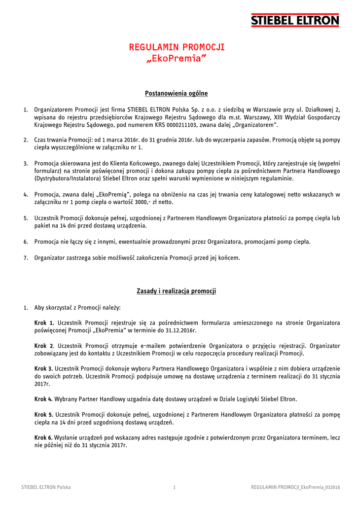 REGULAMIN PROMOCJI „EkoPremia” Postanowienia ogólne 1. Organizatorem Promocji jest firma STIEBEL ELTRON Polska Sp. z o.o. z siedzibą w Warszawie przy ul. Działkowej 2, wpisana do rejestru przedsiębiorców Krajowego Rejestru Sądowego dla m.st. Warszawy, XIII Wydział Gospodarczy Krajowego Rejestru Sądowego, pod numerem KRS 0000211103, zwana dalej „Organizatorem”. 2. Czas trwania Promocji: od 1 marca 2016r. do 31 grudnia 2016r. lub do wyczerpania zapasów. Promocją objęte są pompy ciepła wyszczególnione w załączniku nr 1. 3. Promocja skierowana jest do Klienta Końcowego, zwanego dalej Uczestnikiem Promocji, który zarejestruje się (wypełni formularz) na stronie poświęconej promocji i dokona zakupu pompy ciepła za pośrednictwem Partnera Handlowego (Dystrybutora/Instalatora) Stiebel Eltron oraz spełni warunki wymienione w niniejszym regulaminie. 4. Promocja, zwana dalej „EkoPremią”, polega na obniżeniu na czas jej trwania ceny katalogowej netto wskazanych w załączniku nr 1 pomp ciepła o wartość 3000,- zł netto. 5. Uczestnik Promocji dokonuje pełnej, uzgodnionej z Partnerem Handlowym Organizatora płatności za pompę ciepła lub pakiet na 14 dni przed dostawą urządzenia. 6. Promocja nie łączy się z innymi, ewentualnie prowadzonymi przez Organizatora, promocjami pomp ciepła. 7. Organizator zastrzega sobie możliwość zakończenia Promocji przed jej końcem. Zasady i realizacja promocji 1. Aby skorzystać z Promocji należy: Krok 1. Uczestnik Promocji rejestruje się za pośrednictwem formularza umieszczonego na stronie Organizatora poświęconej Promocji „EkoPremia” w terminie do 31.12.2016r. Krok 2. Uczestnik Promocji otrzymuje e-mailem potwierdzenie Organizatora o przyjęciu rejestracji. Organizator zobowiązany jest do kontaktu z Uczestnikiem Promocji w celu rozpoczęcia procedury realizacji Promocji. Krok 3. Uczestnik Promocji dokonuje wyboru Partnera Handlowego Organizatora i wspólnie z nim dobiera urządzenie do swoich potrzeb. Uczestnik Promocji podpisuje umowę na dostawę urządzenia z terminem realizacji do 31 stycznia 2017r. Krok 4. Wybrany Partner Handlowy uzgadnia datę dostawy urządzeń w Dziale Logistyki Stiebel Eltron. Krok 5. Uczestnik Promocji dokonuje pełnej, uzgodnionej z Partnerem Handlowym Organizatora płatności za pompę ciepła na 14 dni przed uzgodnioną dostawą urządzeń. Krok 6. Wysłanie urządzeń pod wskazany adres następuje zgodnie z potwierdzonym przez Organizatora terminem, lecz nie później niż do 31 stycznia 2017r. STIEBEL ELTRON Polska 1 REGULAMIN PROMOCJI_EkoPremia_032016 Gwarancja 1. Pompy ciepła objęte akcją promocyjną „EkoPremia” podlegają standardowym warunkom gwarancyjnym pomp ciepła Stiebel Eltron zgodnie z kartą gwarancyjną serii PA. 2. Organizator informuje, że przy zakupie pompy ciepła WPL 25AC istnieje możliwość wydłużenia okresu trwania gwarancji do 5 lat przy spełnieniu poniższych warunków: a. odnotowanie indywidualnego wydłużenia okresu gwarancji w ostatecznej ofercie wskazującej konkretny obiekt. b. dokonywanie odpłatnych przeglądów technicznych przez Autoryzowany Zakład Serwisowy Organizatora po 1, 3 i 4 roku eksploatacji potwierdzonych protokołem przeglądu oraz fakturą. c. pozostałe warunki gwarancji zgodnie z kartą serii PA. Postanowienia końcowe 1. Udział Uczestnika w Promocji „EkoPremia” oznacza jego akceptację zasad Promocji zawartych w niniejszym regulaminie. 2. Organizator zastrzega sobie prawo zmiany regulaminu, jeżeli nie wpłynie to na pogorszenie warunków uczestnictwa w Promocji. 3. Zasady przeprowadzania Promocji „EkoPremia” określa wyłącznie niniejszy regulamin. Wszelkie materiały promocyjno-reklamowe mają charakter wyłącznie informacyjny. 4. Regulamin wchodzi w życie z dniem 1 marca 2016r. i obowiązuje przez okres trwania promocji. STIEBEL ELTRON Polska 2 REGULAMIN PROMOCJI_EkoPremia_032016 ZAŁĄCZNIK 1 DO PROMOCJI „EkoPremia” Wykaz pomp ciepła objętych promocją. 1. Pompy ciepła powietrze-woda. Szczegółowe opisy: WPL Nr katalogowy Model 23475901 WPL 15 ACS 23476001 WPL 25 AC 22775601 WPL 13 E 22775701 WPL 18 E 22775801 WPL 23 E 22340001 WPL 13 cool 22340101 WPL 18 cool 22340201 WPL 23 cool 2. Pompy ciepła solanka-woda: Szczegółowe opisy: WPC, WPF, WPF…basic Nr katalogowy Model 23292601 WPC 04 23292701 WPC 05 23292801 WPC 07 23292901 WPC 10 23293001 WPC 13 23293101 WPC 04 cool 23293201 WPC 05 cool 23293301 WPC 07 cool 23293401 WPC 10 cool 23293501 WPC 13 cool 23290901 WPF 04 23291001 WPF 05 23291101 WPF 07 23291201 WPF 10 23291301 WPF 13 23291401 WPF 16 23291501 WPF 04 cool 23291601 WPF 05 cool 23291701 WPF 07 cool 23291801 WPF 10 cool 23291901 WPF 13 cool 23292001 WPF 16 cool 23094401 WPF 5 basic 23094501 WPF 7 basic 23094601 WPF 10 basic 23094701 WPF 13 basic 23094801 WPF 16 basic STIEBEL ELTRON Polska 3 REGULAMIN PROMOCJI_EkoPremia_032016