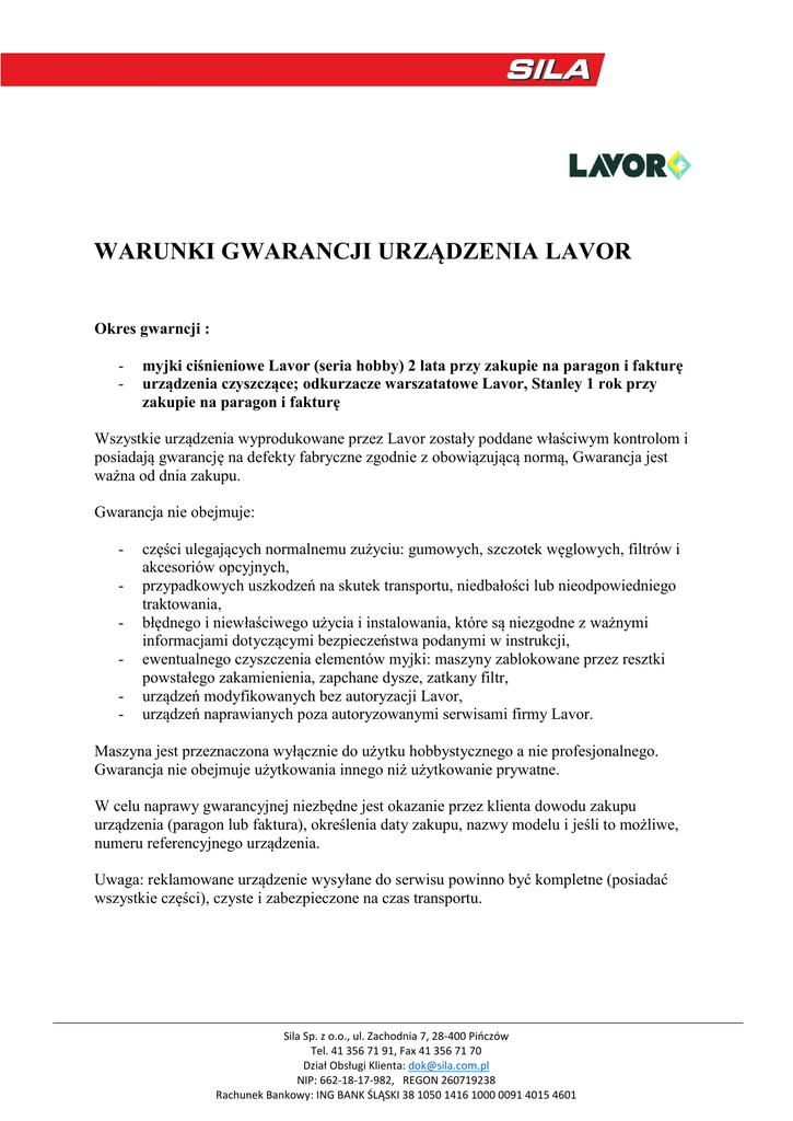 WARUNKI GWARANCJI URZĄDZENIA LAVOR Okres gwarncji : - myjki ciśnieniowe Lavor (seria hobby) 2 lata przy zakupie na paragon i fakturę urządzenia czyszczące; odkurzacze warszatatowe Lavor, Stanley 1 rok przy zakupie na paragon i fakturę Wszystkie urządzenia wyprodukowane przez Lavor zostały poddane właściwym kontrolom i posiadają gwarancję na defekty fabryczne zgodnie z obowiązującą normą, Gwarancja jest ważna od dnia zakupu. Gwarancja nie obejmuje: - części ulegających normalnemu zużyciu: gumowych, szczotek węglowych, filtrów i akcesoriów opcyjnych, przypadkowych uszkodzeń na skutek transportu, niedbałości lub nieodpowiedniego traktowania, błędnego i niewłaściwego użycia i instalowania, które są niezgodne z ważnymi informacjami dotyczącymi bezpieczeństwa podanymi w instrukcji, ewentualnego czyszczenia elementów myjki: maszyny zablokowane przez resztki powstałego zakamienienia, zapchane dysze, zatkany filtr, urządzeń modyfikowanych bez autoryzacji Lavor, urządzeń naprawianych poza autoryzowanymi serwisami firmy Lavor. Maszyna jest przeznaczona wyłącznie do użytku hobbystycznego a nie profesjonalnego. Gwarancja nie obejmuje użytkowania innego niż użytkowanie prywatne. W celu naprawy gwarancyjnej niezbędne jest okazanie przez klienta dowodu zakupu urządzenia (paragon lub faktura), określenia daty zakupu, nazwy modelu i jeśli to możliwe, numeru referencyjnego urządzenia. Uwaga: reklamowane urządzenie wysyłane do serwisu powinno być kompletne (posiadać wszystkie części), czyste i zabezpieczone na czas transportu. Sila Sp. z o.o., ul. Zachodnia 7, 28-400 Pińczów Tel. 41 356 71 91, Fax 41 356 71 70 Dział Obsługi Klienta: [email protected] NIP: 662-18-17-982, REGON 260719238 Rachunek Bankowy: ING BANK ŚLĄSKI 38 1050 1416 1000 0091 4015 4601