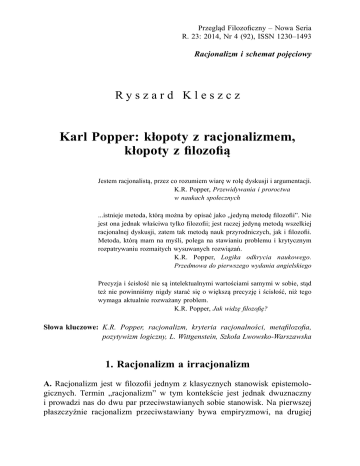 Przegląd Filozoficzny – Nowa Seria R. 23: 2014, Nr 4 (92), ISSN 1230–1493 Racjonalizm i schemat pojęciowy Ryszard Kleszcz Karl Popper: kłopoty z racjonalizmem, kłopoty z filozofią Jestem racjonalistą, przez co rozumiem wiarę w rolę dyskusji i argumentacji. K.R. Popper, Przewidywania i proroctwa w naukach społecznych ...istnieje metoda, którą można by opisać jako „jedyną metodę filozofii”. Nie jest ona jednak właściwa tylko filozofii; jest raczej jedyną metodą wszelkiej racjonalnej dyskusji, zatem tak metodą nauk przyrodniczych, jak i filozofii. Metoda, którą mam na myśli, polega na stawianiu problemu i krytycznym rozpatrywaniu rozmaitych wysuwanych rozwiązań. K.R. Popper, Logika odkrycia naukowego. Przedmowa do pierwszego wydania angielskiego Precyzja i ścisłość nie są intelektualnymi wartościami samymi w sobie, stąd też nie powinniśmy nigdy starać się o większą precyzję i ścisłość, niż tego wymaga aktualnie rozważany problem. K.R. Popper, Jak widzę filozofię? Słowa kluczowe: K.R. Popper, racjonalizm, kryteria racjonalności, metafilozofia, pozytywizm logiczny, L. Wittgenstein, Szkoła Lwowsko-Warszawska 1. Racjonalizm a irracjonalizm A. Racjonalizm jest w filozofii jednym z klasycznych stanowisk epistemologicznych. Termin „racjonalizm” w tym kontekście jest jednak dwuznaczny i prowadzi nas do dwu par przeciwstawianych sobie stanowisk. Na pierwszej płaszczyźnie racjonalizm przeciwstawiany bywa empiryzmowi, na drugiej 140 Ryszard Kleszcz zaś irracjonalizmowi. Ta płaszczyzna sporu filozoficznego, którą określamy mianem sporu racjonalizmu (aprioryzmu) z empiryzmem (aposterioryzmem), dotyczy kwestii drogi (dróg), na której dochodzimy do nabycia przeświadczeń uzasadnionych (wartościowych poznawczo). Racjonalista metodologiczny przyjmuje, że poznaniem wartościowym jest to, które uzyskujemy na drodze pozadoświadczalnej, a więc poznanie a priori. Z kolei empirysta (aposteriorysta) przyjmuje, że wartościowy poznawczo charakter ma poznanie uzyskane w drodze doświadczenia, czyli a posteriori. Druga para przeciwstawnych stanowisk odróżnia racjonalizm i irracjonalizm. Mówiąc o irracjonalizmie, pamiętać należy o wieloznaczności tego terminu. Nas w tym miejscu interesuje irracjonalizm zwany epistemologicznym1. W przypadku tej pary stanowisk racjonalizm/irracjonalizm pytamy o to, czy to rozum, szeroko tutaj pojmowany, czy też jakaś inna władza jest ostatecznym czynnikiem, w oparciu o który dokonujemy oceny walorów naszego poznania, przyznając mu lub odbierając cechę poznania poznawczo wartościowego2. Irracjonalista przynajmniej niekiedy lub w pewnym zakresie dopuszcza te inne czynniki. To przeciwstawienie wymaga wskazania, jakie to czynniki, inne niż rozum, mogą pełnić tę funkcję. Wymienia się tutaj czynniki takie jak: intuicja swoiście rozumiana, autorytet, duchowy wgląd, ekstaza religijna, przeżycie mistyczne, uczucie czy wiara. Ten katalog, z pewnością niewyczerpujący, wydaje się niejednorodny, zaś cała kwestia dosyć skomplikowana, nie może być jednak tutaj przedmiotem rzeczowych analiz3. B. Racjonalizm, widziany na tejże płaszczyźnie i przeciwstawiany tak czy inaczej rozumianemu irracjonalizmowi, nie powinien być utożsamiany z charakteryzowanym w punkcie powyższym aprioryzmem, czyli stanowiskiem przeciwstawianym aposterioryzmowi (empiryzmowi). W tym bowiem miejscu, gdy mówimy o racjonalizmie, to mamy na uwadze nie tylko odwoływanie się do narzędzi charakterystycznych dla władz rozumu, lecz także do operacji o charakterze eksperymentalnym, czy szerzej, empirycznym. Racjo1 Termin „irracjonalizm”, jak wskazuje Izydora Dąmbska, może być nazwą: 1) pewnej własności twierdzeń, 2) kierunku teoriopoznawczego, 3) stanowiska metafizycznego, 4) postawy psychicznej. Pozwala to wyróżniać irracjonalizm: logiczny, epistemologiczny, metafizyczny, psychologiczny. Por. I. Dąmbska, Irracjonalizm a poznanie naukowe, „Kwartalnik Filozoficzny” 1938, tom XIV, s. 85–110; zwłaszcza s. 85–86 i 93–105. 2 Dąmbska określa irracjonalizm epistemologiczny jako stanowisko, zgodnie z którym „istnieje naukowo uprawniony sposób poznawania, gwarantujący słuszność niektórych logicznie irracjonalnych zdań o rzeczywistości”. Takimi logicznie irracjonalnymi zdaniami o rzeczywistości byłyby zdania wewnętrznie sprzeczne lub zasadniczo nierozstrzygalne. Por. I. Dąmbska, Irracjonalizm..., dz. cyt., s. 94. 3 Por. na ten temat: R. Kleszcz, O irracjonalizmie, jego rodzajach i kłopotach z nim związanych, w: tegoż, O rozumie i wartościach, Wydawnictwo WSHE, Łódź 2007, s. 49–65. Karl Popper: kłopoty z racjonalizmem, kłopoty z filozofią 141 nalista, generalnie rzecz biorąc, preferuje intelekt, uznając też, że to poznanie intelektualne jest gwarantem wartości tak uzyskanego poznania. W tego typu poznaniu preferuje się językową klarowność, krytycyzm, w przeciwieństwie do tego, co lokuje się w sferze pozaintelektualnej. Kazimierz Ajdukiewicz, zgodnie z tradycją idącą od Twardowskiego, a żywą w Szkole Lwowsko-Warszawskiej, mówiąc o kryteriach racjonalizmu (racjonalności) wskazywał na dwa: a) intersubiektywną komunikowalność, b) intersubiektywną kontrolowalność4. Widać więc, że takie racjonalne przekonanie nie mogłoby odwoływać się np. li tylko do sfery subiektywnego przeżycia, jako swego jedynego uzasadnienia. W tradycji Szkoły Lwowsko-Warszawskiej przyjęło się tego typu stanowisko, przeciwne irracjonalizmowi, określać mianem antyirracjonalizmu. W ten sposób antyirracjonalizm przeciwstawiałby się irracjonalizmowi. Spróbujmy teraz nieco szerzej scharakteryzować własności stanowiska antyirracjonalizmu, a więc stanowiska cechującego się tym, że poglądy na jego gruncie spełniają wymóg racjonalności. Przedstawione propozycje są rozwinięciami tego, co już pojawia się, w postaci mniej rozbudowanej, w propozycjach autor