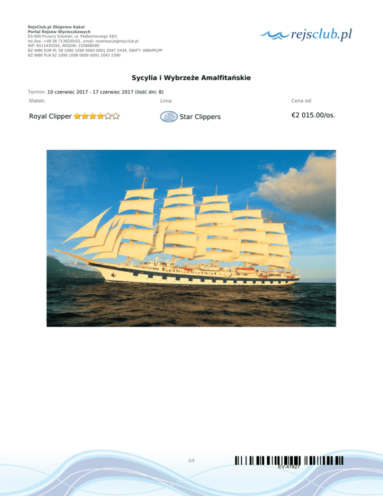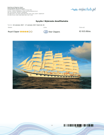 RejsClub.pl Zbigniew Kąkol Portal Rejsów Wycieczkowych 83-000 Pruszcz Gdański, ul. Podkomorzego 58/1 tel./fax: +48 58 7138200/01, email: [email protected] NIP: 6511430265, REGON: 220868580 BZ WBK EUR PL 58 1090 1098 0000 0001 2047 2434, SWIFT: WBKPPLPP BZ WBK PLN 82 1090 1098 0000 0001 2047 2390 Sycylia i Wybrzeże Amalfitańskie Termin: 10 czerwiec 2017 - 17 czerwiec 2017 (ilość dni: 8) Statek: Royal Clipper Linia: Cena od: Star Clippers €2 015.00/os. 1/3 EV:47827 RejsClub.pl Zbigniew Kąkol Portal Rejsów Wycieczkowych 83-000 Pruszcz Gdański, ul. Podkomorzego 58/1 tel./fax: +48 58 7138200/01, email: [email protected] NIP: 6511430265, REGON: 220868580 BZ WBK EUR PL 58 1090 1098 0000 0001 2047 2434, SWIFT: WBKPPLPP BZ WBK PLN 82 1090 1098 0000 0001 2047 2390 TRASA REJSU dzień 1 dzień 2 dzień 2 dzień 3 dzień 4 dzień 5 Data Port Wpłynięcie Wypłynięcie sobota 10.06.2017 Civitavecchia, Rzym --:-- --:-- --:-- --:-- --:-- --:-- --:-- --:-- --:-- --:-- --:-- --:-- --:-- --:-- --:-- --:-- niedziela 11.06.2017 Włochy Ponza Włochy niedziela 11.06.2017 Palmarola poniedziałek 12.06.2017 Sorrento wtorek 13.06.2017 Włochy Włochy Amalfi Włochy środa 14.06.2017 Taormina, Sycylia czwartek 15.06.2017 Lipari, Sycylia czwartek 15.06.2017 Stromboli, Wyspy Liparyjskie dzień 7 piątek 16.06.2017 Dzień na morzu --:-- --:-- dzień 8 sobota 17.06.2017 Civitavecchia, Rzym --:-- --:-- dzień 6 dzień 6 Legenda Włochy Włochy Włochy Włochy Godziny przypłynięcia i wypłynięcia do/z poszczególnych portów uzależnione są od warunków pogodowych. CENNIK Cena katalogowa Kabina wewnętrzna od €2 015.00 Kabina zewnętrzna z oknem od €2 130.00 Suite (apartament) Cena promocyjna €4 175.00 2/3 EV:47827 RejsClub.pl Zbigniew Kąkol Portal Rejsów Wycieczkowych 83-000 Pruszcz Gdański, ul. Podkomorzego 58/1 tel./fax: +48 58 7138200/01, email: [email protected] NIP: 6511430265, REGON: 220868580 BZ WBK EUR PL 58 1090 1098 0000 0001 2047 2434, SWIFT: WBKPPLPP BZ WBK PLN 82 1090 1098 0000 0001 2047 2390 Kabina jednoosobowa €2 445.00 3 osoba dorosła w kabinie €700.00 dziecko do 18 lat jako 3 i 4 osoba w kabinie €700.00 Opłaty portowe €235.00 Uwaga! Ceny za osobę w kabinie dwuosobowej. Cena zawiera: zakwaterowanie w kabinie wybranej kategorii; wyżywienie - 3 główne posiłki, przekąski między posiłkami, bufet lub przekąski o północy; napoje serwowane do śniadania i w bufetach samoobsługowych; serwis bagażowy podczas wejścia i zejścia ze statku; serwis kabinowy; korzystanie ze wszystkich urządzeń sportowo - rekreacyjnych znajdujących się na pokładzie statku (basen, jacuzzi, sala fitness, itp.); udział we wszystkich imprezach organizowanych na statku (przedstawienia w teatrze, koncerty, programy animacyjne itp.). Cena nie zawiera: kosztów dojazdu do portu; ewentualnych noclegów w hotelu przed/po rejsie i transferów; wycieczek fakultatywnych w trakcie rejsu; korzystania z barów, mini baru w kabinie oraz napojów zamawianych w restauracji; korzystania z punktów usługowych (fryzjer, pralnia, fotograf, salon piękności i odnowy biologicznej, internet) i wydatków osobistych; napiwków dla obsługi na statku (kwota uzależniona od długości rejsu); ubezpieczenia KL, NNW i bagaż, kosztów wiz (tam gdzie wymagane). 3/3 EV:47827