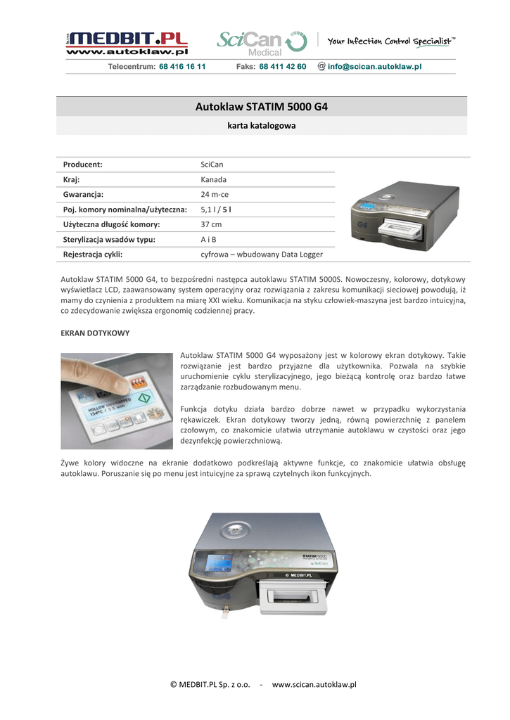 Autoklaw STATIM 5000 G4 karta katalogowa Producent: SciCan Kraj: Kanada Gwarancja: 24 m-ce Poj. komory nominalna/użyteczna: 5,1 l / 5 l Użyteczna długość komory: 37 cm Sterylizacja wsadów typu: AiB Rejestracja cykli: cyfrowa – wbudowany Data Logger Autoklaw STATIM 5000 G4, to bezpośredni następca autoklawu STATIM 5000S. Nowoczesny, kolorowy, dotykowy wyświetlacz LCD, zaawansowany system operacyjny oraz rozwiązania z zakresu komunikacji sieciowej powodują, iż mamy do czynienia z produktem na miarę XXI wieku. Komunikacja na styku człowiek-maszyna jest bardzo intuicyjna, co zdecydowanie zwiększa ergonomię codziennej pracy. EKRAN DOTYKOWY Autoklaw STATIM 5000 G4 wyposażony jest w kolorowy ekran dotykowy. Takie rozwiązanie jest bardzo przyjazne dla użytkownika. Pozwala na szybkie uruchomienie cyklu sterylizacyjnego, jego bieżącą kontrolę oraz bardzo łatwe zarządzanie rozbudowanym menu. Funkcja dotyku działa bardzo dobrze nawet w przypadku wykorzystania rękawiczek. Ekran dotykowy tworzy jedną, równą powierzchnię z panelem czołowym, co znakomicie ułatwia utrzymanie autoklawu w czystości oraz jego dezynfekcję powierzchniową. Żywe kolory widoczne na ekranie dodatkowo podkreślają aktywne funkcje, co znakomicie ułatwia obsługę autoklawu. Poruszanie się po menu jest intuicyjne za sprawą czytelnych ikon funkcyjnych. © MEDBIT.PL Sp. z o.o. - www.scican.autoklaw.pl MENU G4 Zastosowany w autoklawie STATIM 5000 G4 ekran dotykowy udostępnił użytkownikowi oprócz wygody obsługi również dostęp do zupełnie nowych funkcji. Oprócz przycisków do wyboru i uruchamiania cyklu sterylizacyjnego mamy dostęp do kliku bardzo ciekawych i unikalnych funkcji: 1. Ustawień sieciowych (np. aktualny adres IP) 2. Zawartości pendriv'a wbudowanego systemu rejestracji cykli Data Logger z możliwością przeglądania zapisanych rejestrów. © MEDBIT.PL Sp. z o.o. - www.scican.autoklaw.pl 3. Odczytu jakości wody destylowanej znajdującej się w zbiorniku autoklawu. 4. Pozycji kasety sterylizacyjnej w autoklawie. 5. Aktualnej informacji o stanie autoklawu oraz dostępu do menu ustawień użytkownika i serwisanta. © MEDBIT.PL Sp. z o.o. - www.scican.autoklaw.pl PRACA W SIECI LAN Autoklaw STATIM 5000 G4 oprócz nowoczesnego interfejsu komunikacji z użytkownikiem został wyposażony w znakomicie działającą usługę zdalnego dostępu poprzez standardową sieć komputerową. Autoklaw po bezpośrednim podłączeniu do Routera sieciowego za pomocą kabla lub bezprzewodowo poprzez Access Point pobiera automatycznie adres IP sieci lokalnej. Użytkownik z dowolnego komputera bezpośrednio podłączonego do lokalnej sieci lub komputera zewnętrznego podłączonego do sieci poprzez internet uzyskuje możliwość połączenia się bezpośrednio ze STATIMem 5000 G4. Do komunikacji wystarcza standardowa przeglądarka internetowa. Po wpisaniu adresu IP uzyskanego przez STATIM G4 (np. 192.168.0.188) wchodzimy do portalu operatora ON-LINE. © MEDBIT.PL Sp. z o.o. - www.scican.autoklaw.pl Na pierwszej stronie widzimy podstawowe dane autoklawu, z którym się połączyliśmy oraz jego aktualny status pracy. Możemy konfigurować stronę kontaktu ustawiając min. automatyczne powiadomienia via e-mail dla serwisu. Dzięki temu każdy problem pojawiający się w trakcie pracy autoklawu może być raportowany do autoryzowanego serwisu. Ułatwia, to diagnozę awarii oraz przyspiesza działanie serwisu. © MEDBIT.PL Sp. z o.o. - www.scican.autoklaw.pl Możemy również przeglądać zapisane na pendriv'e rejestry cykli sterylizacyjnych. Opcja ta jest bardzo rozbudowana. Oprócz samego rejestru portal generuje również wykres jego przebiegu oraz umożliwia wydrukowanie rejestru na dowolnej drukarce lub wysłanie go za pośrednictwem poczty e-mail w formacie pliku txt oraz PDF. © MEDBIT.PL Sp. z o.o. - www.scican.autoklaw.pl KASETA STERYLIZACYJNA Autoklaw STATIM 5000G4, to większy brat STATIM 2000 G4. Ich starsze wersje były przez długi czas wizytówkami firmy SciCan. W naszym Kraju pracuje bardzo dużo autoklawów STATIM 5000 i 5000S, szczególnie na szpitalnych oddziałach okulistycznych. STATIM 2000 G4 STATIM 5000 G4 STATIM 5000 G4, to właściwie powiększona kopia STAIMA 2000 G4. Poza zdecydowanie większą kasetą sterylizacyjną oraz dłuższymi czasami cykli nie oferuje nowych funkcjonalności, czy też lepszych parametrów sterylizacji. © MEDBIT.PL Sp. z o.o. - www.scican.autoklaw.pl W wielu przypadkach większa kaseta może być istotnym elementem przemawiającym za wyborem autoklawu STATIM 5000 G4. Jej pojemność pozwala na zmieszczenie 12 testowych pakietów o wymiarach 10x20 cm. Jest, to ilość znacznie większa od tej oferowanej przez STATIM 2000 G4. STATIM 5000 G4 odziedziczył niestety po swoim mniejszym bracie kiepską zdolność do sterylizacji narzędzi opakowanych. O ile sama sterylizacja jest szybka, to suszenie zajmuje ponad 60 min. © MEDBIT.PL Sp. z o.o. - www.scican.autoklaw.pl Rejestracja cykli. Jak wspomnieliśmy na początku autoklaw STATIM 2000 G4 jest świetnie przygotowany do automatycznej rejestracji przebiegu cykli sterylizacyjnych. Posiada wbudowany rejestrator Data Logger, który zapisuje przebiegi wszystkich przeprowadzonych cykli sterylizacyjnych na podłączonym do autoklawu pendriv'e. Zapisane rejestry można odczytać za pośrednictwem Web portalu i z jego poziomu wydrukować lub przesłać rejestr via e-mail. Można również zwyczajnie odłączyć pendriv'e od autoklawu i podłączy go do portu USB w komputerze. Pliki zapisywane są w jednocześnie w dwóch formatach: PDF i txt. Można je zatem otworzyć, wydrukować i archiwizować w dowolnym systemie operacyjnym komputera. Norma EN13060. Autoklawy STATIM spełniają w 100% założenia normy EN13060 dla sterylizacji wsadów typu A i B. Można zatem w nich skutecznie sterylizować wsady o budowie kapilarnej (wgłębione). Co oznaczają typy wsadów oraz jak można sprawdzić, czy autoklaw według 