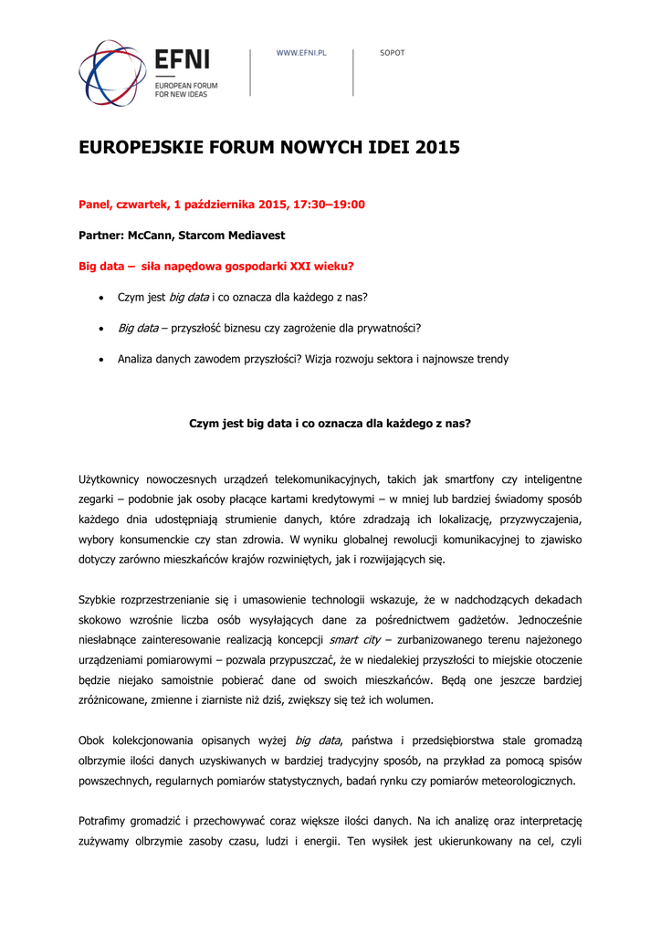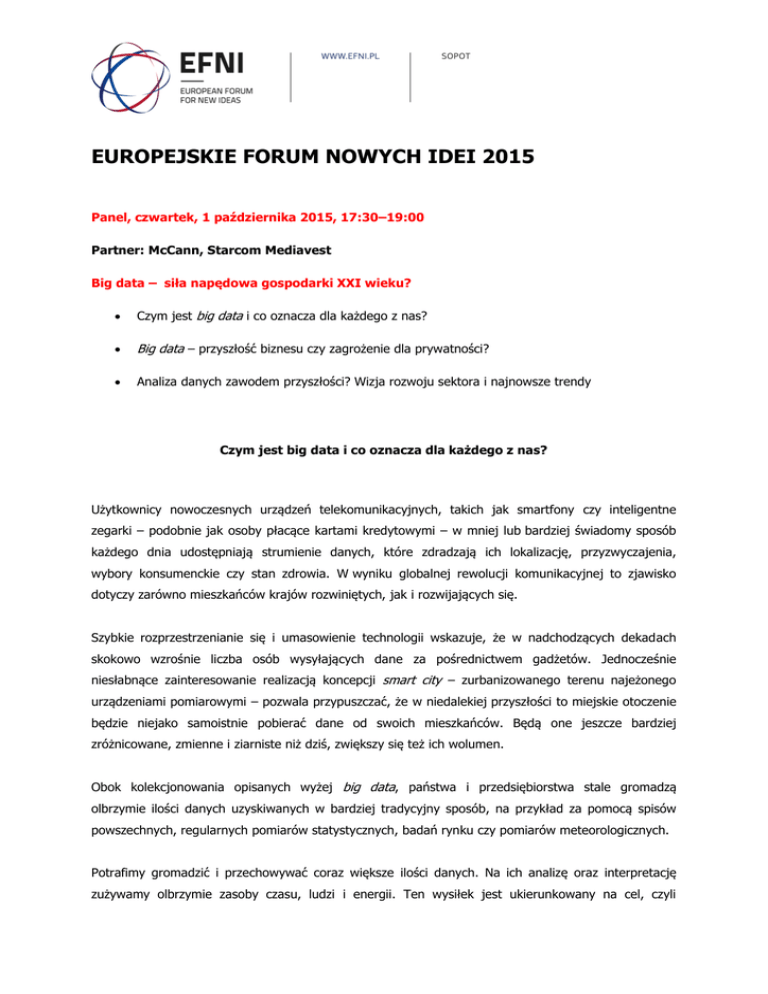 EUROPEJSKIE FORUM NOWYCH IDEI 2015 Panel, czwartek, 1 października 2015, 17:30–19:00 Partner: McCann, Starcom Mediavest Big data – siła napędowa gospodarki XXI wieku? Czym jest big data i co oznacza dla każdego z nas? Big data – przyszłość biznesu czy zagrożenie dla prywatności? Analiza danych zawodem przyszłości? Wizja rozwoju sektora i najnowsze trendy Czym jest big data i co oznacza dla każdego z nas? Użytkownicy nowoczesnych urządzeń telekomunikacyjnych, takich jak smartfony czy inteligentne zegarki – podobnie jak osoby płacące kartami kredytowymi – w mniej lub bardziej świadomy sposób każdego dnia udostępniają strumienie danych, które zdradzają ich lokalizację, przyzwyczajenia, wybory konsumenckie czy stan zdrowia. W wyniku globalnej rewolucji komunikacyjnej to zjawisko dotyczy zarówno mieszkańców krajów rozwiniętych, jak i rozwijających się. Szybkie rozprzestrzenianie się i umasowienie technologii wskazuje, że w nadchodzących dekadach skokowo wzrośnie liczba osób wysyłających dane za pośrednictwem gadżetów. Jednocześnie niesłabnące zainteresowanie realizacją koncepcji smart city – zurbanizowanego terenu najeżonego urządzeniami pomiarowymi – pozwala przypuszczać, że w niedalekiej przyszłości to miejskie otoczenie będzie niejako samoistnie pobierać dane od swoich mieszkańców. Będą one jeszcze bardziej zróżnicowane, zmienne i ziarniste niż dziś, zwiększy się też ich wolumen. Obok kolekcjonowania opisanych wyżej big data, państwa i przedsiębiorstwa stale gromadzą olbrzymie ilości danych uzyskiwanych w bardziej tradycyjny sposób, na przykład za pomocą spisów powszechnych, regularnych pomiarów statystycznych, badań rynku czy pomiarów meteorologicznych. Potrafimy gromadzić i przechowywać coraz większe ilości danych. Na ich analizę oraz interpretację zużywamy olbrzymie zasoby czasu, ludzi i energii. Ten wysiłek jest ukierunkowany na cel, czyli zwiększenie zasobu wiedzy. Wiedza zaś ma pozwolić na przewidywanie kierunku rozwoju wydarzeń, a w rezultacie umożliwić podejmowanie lepszych decyzji i doprowadzić do zoptymalizowania działania. W optymistycznej narracji o big data opracowanie tego rodzaju danych ma przynieść pożytek wszystkim partnerom społecznym. Big data może zwiększyć produktywność różnych sektorów gospodarki, usprawnić badania i przyspieszyć innowacje. Przewiduje się, że w gospodarce kognitywnej dane będą cenniejsze niż ropa. Dzięki ich analizie przedsiębiorcy mają optymalizować koszty swojej działalności oraz zarabiać na nowych usługach i produktach opracowanych zgodnie z oczekiwaniami i potrzebami konsumentów. Z perspektywy biznesu analiza big data może pozwolić na trafniejszą ocenę zapotrzebowania na produkty i usługi, lepsze oraz tańsze przewidywanie trendów popytu i podaży, precyzyjne określenie grupy odbiorców działań marketingowych, szybsze diagnozowanie i reagowanie na kryzysy, optymalizację zapasów i logistyki. Dla rynku usług finansowych big data oznacza możliwość właściwej oceny zdolności kredytowej. Jest też kluczowe dla sektora ubezpieczeń oraz zarządzania ryzykiem. Ekspercka wiedza uzyskana z analizy big data ma ułatwić politykom i urzędnikom państwowym mapowanie zapotrzebowania na usługi publiczne, a później projektowanie oraz wdrażanie lepszych rozwiązań w interesie obywateli (data-driven policy). Big data ma szansę zrewolucjonizować służbę zdrowia – monitorowanie stanu zdrowia populacji pozwoli na zapobieganie rozprzestrzenianiu się globalnych i lokalnych epidemii, a także na łatwiejsze oraz tańsze porównywanie skuteczności różnych metod prewencji i leczenia chorób. W zakresie edukacji może ułatwić diagnozowanie luk w wiedzy czy umiejętnościach, a przez to pozwolić na szybsze i lepsze dopasowanie systemu nauczania do wymagań dynamicznie zmieniającego się rynku pracy. Big data może też usprawnić zarządzanie komunalne i sprawić, że będziemy żyć w czystszych, bezpieczniejszych, wygodniejszych oraz lepiej skomunikowanych miastach. Jak pokierować większym nasyceniem urządzeń pomiarowych w naszym otoczeniu, żeby oprócz ilościowego wzrostu strumienia danych przynieść poprawę jakości życia społeczeństw? W jaki sposób interpretować dane, żeby lepiej zrozumieć potrzeby obywateli oraz konsumentów, a następnie dostarczyć adekwatne usługi publiczne i konsumpcyjne? Jak wykorzystać big data do wzrostu innowacyjności oraz produktywności gospodarek? Analiza danych zawodem przyszłości? Wizja rozwoju sektora i najnowsze trendy Analitycy danych potrafią zarządzać strumieniem informacji oraz wskazywać istniejące w jego obrębie zależności. Ich umiejętności techniczne i interpretacyjne pozwalają na wyciąganie wniosków z ogromnych zasobów pozornie nieskorelowanych ze sobą danych. Z big data pracują inżynierowie produkcji oprogramowania, architekci i analitycy systemów komputerowych, analitycy zarządzania, specjaliści od marketingu, administratorzy sieci, analitycy rynku czy bezpieczeństwa informacji. Według Harvard Business Review „badacz danych” to „najseksowniejsza profesja XXI wieku”. Od kilku lat rośnie popyt na specjalistów w tym zakresie, a o ich zarobkach krążą legendy. Według „Forbesa” w 2015 roku najwięcej z nich znajdzie zatrudnienie w branży usług naukowych i technicznych, nowych technologii, produkcji przemysłowej, usług finansowych i ubezpieczeń oraz handlu detalicznym. Analiza big data znajduje zastosowanie również poza tymi dziedzinami. Przewiduje się, że w ciągu 5– 10 lat w każdym sektorze gospodarki pojawi się na nią zapotrzebowanie. Dzisiaj big data zmienia też rynek mediów. Po pierwsze umożliwia nowy typ dziennikarstwa śledczego, opowiadającego historie na podstawie interpretacji publicznie dostępnych danych (open data) za pomocą programów obliczeniowych dostępnych na wolnych li