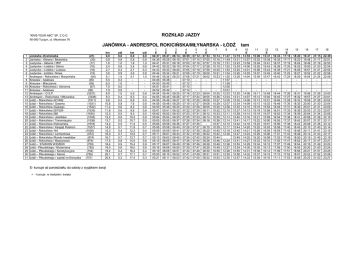 ROZKŁAD JAZDY "KRIS-TOUR ABC" SP. Z O.O. 95-080 Tuszyn, ul. Młynkowa 76 JANÓWKA - ANDRESPOL ROKICIŃSKA/MŁYNARSKA - ŁÓDŹ 1 2 3 4 5 6 7 8 9 10 11 12 13 14 15 16 17 18 19 20 21 22 23 24 25 26 27 28 29 30 31 Janówka -Krańcówka Janówka - Główna / Bedońska Justynów - Główna / PKP Justynów – Łódzka / Górna Justynów – Łódzka / Ludowa Justynów - Łódzka / Nowa Andrespol - Rokicińska / Marysińska Kraszew - Azaliowa Kraszew - Mleczarnia Kraszew - Rokicińska / Ustronna Kraszew - Azaliowa Andrespol – O.S.P. Andrespol – Rokicińska / Młynarska Łódź – Rokicińska 427/482 Łódź – Rokicińska / Gwarna Łódź – Rokicińska /Gajcego Łódź – Rokicińska 297/324 Łódź – Rokicińska 280 Łódź – Rokicińska / Józefiaka Łódź – Rokicińska / Transmisyjna Łódź – Rokicińska /Hetmańska Łódź – Rokicińska / Książąt Polskich Łódź – Rokicińska 144 Łódź – Rokicińska / Lermontowa Łódź – Rokicińska /Rondo Inwalidów Łódź – Rokicińska / Maszynowa Łódź – STADION WIDZEW Łódź - Piłsudskiego / Niciarniana Łódź – Piłsudskiego / Konstytucyjna Łódź – Piłsudskiego / Sarnia Łódź – Piłsudskiego / szpital im.Korczaka (21) (20) (17) (18) (16) (15) (04) (05) (09) (07) (06) (3237) (3236) (1911) (1531) (1532) (1533) (1534) (1535) (1536) (1918) (1537) (1538) (972) (974) (979) (750) (752) (754) (756) (757) km 0,0 0,8 1,8 2,4 2,7 3,6 5,1 5,5 6,5 7,0 7,9 8,9 9,3 9,8 10,6 11,2 11,8 12,3 13,2 13,7 14,2 14,9 15,3 16,0 16,7 17,5 18,4 19,0 19,4 20,1 20,4 E- kursuje od poniedziałku do soboty z wyjątkiem świąt + - kursuje w niedziele i święta odl 0,0 0,8 1,0 0,6 0,3 0,9 1,5 0,4 1,0 0,5 0,9 1,0 0,4 0,5 0,8 0,6 0,6 0,5 0,9 0,5 0,5 0,7 0,4 0,7 0,7 0,8 0,9 0,6 0,4 0,7 0,3 km 0,0 0,8 1,8 2,4 2,7 3,6 5,1 5,9 6,3 6,8 7,6 8,2 8,8 9,3 10,2 10,7 11,2 11,9 12,3 13,0 13,7 14,5 15,4 16,0 16,4 17,1 17,4 odl 0,0 0,8 1,0 0,6 0,3 0,9 1,5 0,8 0,4 0,5 0,8 0,6 0,6 0,5 0,9 0,5 0,5 0,7 0,4 0,7 0,7 0,8 0,9 0,6 0,4 0,7 0,3 1 E 04:37 04:39 04:41 04:42 04:43 04:44 04:46 04:48 04:50 04:51 04:52 04:54 04:55 04:56 04:58 04:59 05:01 05:02 05:04 05:05 05:06 05:08 05:09 05:11 05:13 05:15 05:17 05:18 05:19 05:20 05:21 2 E 05:27 05:29 05:31 05:32 05:33 05:34 05:36 05:38 05:40 05:41 05:42 05:44 05:45 05:46 05:48 05:49 05:51 05:52 05:54 05:55 05:56 05:58 05:59 06:01 06:03 06:05 06:07 06:08 06:09 06:10 06:11 3 E 06:14 06:16 06:18 06:19 06:20 06:21 06:23 06:25 06:26 06:27 06:29 06:30 06:32 06:33 06:35 06:37 06:38 06:40 06:41 06:43 06:45 06:47 06:49 06:50 06:51 06:52 06:53 4 E 06:59 07:01 07:03 07:04 07:05 07:06 07:08 07:10 07:12 07:13 07:14 07:16 07:17 07:18 07:19 07:20 07:22 07:23 07:25 07:26 07:27 07:29 07:30 07:32 07:34 07:36 07:38 07:39 07:40 07:41 07:42 5 + 07:12 07:14 07:16 07:17 07:18 07:19 07:21 - 6 E 07:53 07:55 07:57 07:58 07:59 08:00 08:02 - 7 8 9 10:14 10:16 10:18 10:19 10:20 10:21 10:23 - 07:23 07:24 07:25 07:27 07:28 07:30 07:31 07:33 07:34 07:35 07:37 07:38 07:40 07:42 07:44 07:46 07:47 07:48 07:49 07:50 08:04 08:05 08:06 08:08 08:09 08:11 08:12 08:14 08:16 08:19 08:20 08:22 08:24 08:26 08:28 08:29 08:30 08:31 08:32 10:25 10:26 10:27 10:29 10:30 10:32 10:33 10:35 10:36 10:37 10:39 10:40 10:42 10:44 10:46 10:48 10:49 10:50 10:51 10:52 11:47 11:49 11:51 11:52 11:53 11:54 11:55 11:57 11:59 12:00 12:01 12:03 12:04 12:05 12:07 12:08 12:10 12:11 12:13 12:14 12:15 12:17 12:18 12:20 12:22 12:24 12:26 12:27 12:28 12:29 12:30 tam 13:19 13:21 13:23 13:24 13:25 13:26 13:28 - 10 E 13:55 13:57 13:59 14:00 14:01 14:02 14:04 - 13:30 13:31 13:32 13:34 13:35 13:37 13:38 13:40 13:41 13:42 13:44 13:45 13:47 13:49 13:51 13:53 13:54 13:55 13:56 13:57 14:06 14:07 14:08 14:09 14:10 14:13 14:14 14:16 14:17 14:18 14:20 14:21 14:23 14:25 14:27 14:29 14:30 14:31 14:32 14:33 11 15:00 15:02 15:04 15:05 15:06 15:07 15:09 - 12 E 15:37 15:39 15:41 15:43 15:44 15:45 15:47 - 15:11 15:12 15:13 15:15 15:16 15:18 15:19 15:21 15:22 15:23 15:25 15:26 15:28 15:30 15:32 15:34 15:35 15:36 15:37 15:38 15:49 15:50 15:51 15:53 15:54 15:56 15:57 15:59 16:00 16:01 16:03 16:04 16:06 16:08 16:10 16:12 16:13 16:14 16:15 16:16 13 15 16 17 18 16:33 16:35 16:37 16:38 16:39 16:40 16:42 - 14 E 17:15 17:17 17:19 17:20 17:21 17:22 17:24 - 18:20 18:22 18:24 18:25 18:26 18:27 18:29 - 19:47 19:48 19:49 19:50 19:51 19:52 19:54 - 21:15 21:17 21:19 21:20 21:21 21:22 21:24 - 22:49 22:51 22:53 22:54 22:55 22:56 22:58 - 16:44 16:45 16:46 16:48 16:49 16:51 16:52 16:54 16:55 16:56 16:58 16:59 17:01 17:03 17:05 17:07 17:08 17:09 17:10 17:11 17:26 17:27 17:28 17:30 17:31 17:33 17:34 17:36 17:37 17:38 17:40 17:42 17:43 17:45 17:47 17:49 17:50 17:51 17:52 17:53 18:31 18:32 18:33 18:35 18:36 18:38 18:39 18:41 18:42 18:43 18:45 18:46 18:48 18:50 18:52 18:54 18:55 18:56 18:57 18:58 19:56 19:57 19:58 20:00 20:01 20:03 20:04 20:06 20:07 20:08 20:10 20:11 20:13 20:15 20:17 20:19 20:20 20:21 20:22 20:23 21:26 21:27 21:28 21:30 21:31 21:33 21:34 21:36 21:37 21:38 21:40 21:41 21:43 21:45 21:47 21:49 21:50 21:51 21:52 21:53 23:00 23:01 23:02 23:04 23:05 23:07 23:08 23:10 23:11 23:12 23:14 23:15 23:17 23:19 23:21 23:23 23:24 23:25 23:26 23:27