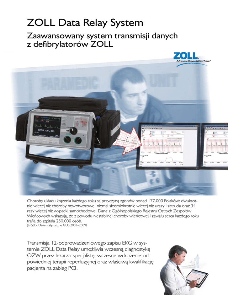 ZOLL Data Relay System Zaawansowany system transmisji danych z defibrylatorów ZOLL Choroby układu krążenia każdego roku są przyczyną zgonów ponad 177.000 Polaków: dwukrotnie więcej niż choroby nowotworowe, niemal siedmiokrotnie więcej niż urazy i zatrucia oraz 34 razy więcej niż wypadki samochodowe. Dane z Ogólnopolskiego Rejestru Ostrych Zespołów Wieńcowych wskazują, że z powodu niestabilnej choroby wieńcowej i zawału serca każdego roku trafia do szpitala 250.000 osób. (źródło: Dane statystyczne GUS 2003–2009) Transmisja 12-odprowadzeniowego zapisu EKG w systemie ZOLL Data Relay umożliwia wczesną diagnostykę OZW przez lekarza-specjalistę, wczesne wdrożenie odpowiedniej terapii reperfuzyjnej oraz właściwą kwalifikację pacjenta na zabieg PCI. Rozbudowany system teletransmisji, pomagający skrócić czas do PCI. Optymalne pierwotne PCI (przezskórna interwencja wieńcowa) powinno być przeprowadzone w ciągu 90 minut od czasu pierwszego kontaktu z osobą podejmującą decyzję o leczeniu lub przekazaniu pacjenta. (źródło: Wytyczne 2005 Resuscytacji krążeniowo-oddechowej Europejskiej Rady Resuscytacji – Pierwotne interwencje przezskórne, Kraków 2005) Europejskie Towarzystwo Kardiologiczne zaleca określone przedziały czasowe w trakcje udzielania pomocy medycznej: <10 minut dla przekazania zapisu EKG, < – 5 minut na telekonsultację, <30 minut od przybycia ambulansu sanitarnego do wdrożenia leczenia fibrynolitycznego lub < – 90 – 120 minut od przybycia ambulansu sanitarnego do pierwszego rozprężenia balonu. (źródło: Europejskie Towarzystwo Kardiologiczne) Ambulans sanitarny / SOR Transmisja danych ZOLL Data Relay System (ZDRS) to system telemedyczny dedykowany do defibrylatorów ZOLL: M Series, M Series CCT oraz E Series. Umożliwia teletransmisję zapisu 12-odprowadzeniowych badań EKG wraz z raportami trendów funkcji życiowych, w czasie rzeczywistym, bezpośrednio z miejsca zdarzenia do lekarza-konsultanta lub do Ośrodków Kardiologii Inwazyjnej. Natychmiastowy wynik. Transmisja bez zakłóceń. Zwiększone szanse pacjenta. •Możliwość analizowania zarejestrowanych zapisów EKG i parametrów życiowych przed przybyciem pacjenta do specjalistycznego Ośrodka Kardiologii Inwazyjnej. •Skrócenie czasu transportu pacjenta z Ostrym Zespołem Wieńcowym do pracowni kardiologii inwazyjnej w celu wykonania zabiegu angioplastyki. •Możliwość oceny stanu pacjenta „na odległość”. •Wsparcia podstawowych zespołów Ratownictwa Medycznego przez lekarza konsultanta / koordynatora. •Optymalizacja procedur medycznych. •Obniżenie kosztów leczenia i transportu chorych oraz ich późniejszej rehabilitacji. •Zmniejszenie umieralności z powodu zawałów serca w regionie. Reperfuzja w czasie mniejszym niż 90 min. Konsultacje medyczne Główne zalety systemu teletransmisji ZDRS: •System o wyjątkowo prostej, intuicyjnej obsłudze, chętnie przyjmowanej przez ratowników medycznych. •Wysoka, diagnostyczna jakość zapisów EKG. •Automatyczne, bezzakłóceniowe przesyłanie zapisów EKG wraz z parametrami życiowymi pacjenta. •Natychmiastowe podjęcie decyzji terapeutycznych i ewentualne rozpoczęcie specjalistycznej terapii. •Monitorowanie transportu w przypadku kwalifikacji pacjenta do Oddziału Kardiologii Inwazyjnej. •Możliwość przekierowania transmisji na dedykowane adresy e-mail lub numery fax. •Kontrola dostępu tylko dla uprawnionych użytkowników. •Bezpieczeństwo transmisji i archiwizacji danych (spełnia wymogi Ustawy o Ochronie Danych Osobowych, Dz.U. 1997 Nr 133 poz. 883). Technologiczne aspekty systemu ZDRS: System umożliwia przesyłanie diagnostycznego zapisu EKG wraz z raportami trendów funkcji życiowych przez standardowy telefon komórkowy (transmisja w systemie DUN – Dial-Up Networking) lub za pośrednictwem komputera kieszonkowego typu Palmtop/ Smartfon. • Każda transmisja zawiera identyfikator urządzenia nadawczego, zapis EKG z tabelą parametrów życiowych (Vital Trends), jak również wszystkie informacje dotyczące pacjenta, wpisane przez ratownika na miejscu zdarzenia. • System umożliwia archiwizację i grupowanie przesyłanych danych pod względem miejsca, czasu, zespołu wysyłającego zapis, etc. • Każda transmisja przesłana do komputera sygnalizowana jest powiadomieniem dźwiękowym. • Transmisja może być przesyłana do dowolnej ilości dedykowanych odbiorców (dotyczy ZDRS System z Dial-Up). • Odbiorca transmisji może być wybrany z poziomu defibrylatora. • Nowy, wcześniej nie zdefiniowany odbiorca może być wprowadzony z poziomu urządzenia nadawczego. Schemat funkcjonowania systemu ZDRS: ð Połączenie typu ZOLL Data Relay – defibrylator M Series / M Series CCT + PDA Windows Mobile Urządzenie odbiorcze Urządzenie PDA z wgranym systemem ZDRS Bluetooth M Series CCT Serwer ZDRS Firewall Transmisja Sieć komórkowa Lub Internet Intranet M Series Dane są przesyłane przez Bluetooth do urządzenia PDA z zainstalowanym oprogramowaniem ZOLL Data Relay, które przesyła je automatycznie przez Internet do serwera ZDRS. Docelowi odbiorcy otrzymują transmisję na adres e-mail lub fax. ð Połączenie typu Dial-Up Networking (DUN) – defibrylator E Series + telefon komórkowy Urządzenie odbiorcze E Series Telefon komórkowy Bluetooth Transmisja DUN Serwer ZDRS Firewall Sieć komórkowa Internet Intranet Dane przesyłane są przez Bluetooth do telefonu komórkowego (z DUN), a następnie przez Internet do serwera ZDRS. Stamtąd transmisja przekierowywana jest do dowolnej ilości skonfigurowanych odbiorców e-mail, fax. Wymagania konfiguracyjne systemu ZDRS: Ambulans sanitarny defibrylator M-Series / M Series CCT + PDA Windows Mobile ZDRS BRO: 0513WER.02 lub defibrylator E-Series + telefon komórkowy Serwer ZDRS Sprzęt •Serwer •Zestaw komputerowy •System podtrzymania zasilania UPS (opcja). Oprogramowanie Zoll Data Relay System Wymagania instalacy