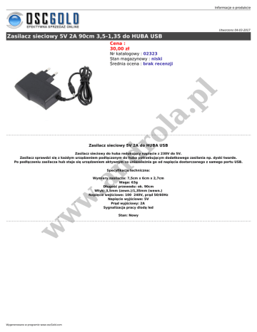 Informacje o produkcie Utworzono 04-03-2017 Zasilacz sieciowy 5V 2A 90cm 3,5-1,35 do HUBA USB Cena : 30,00 zł ro la .p l Nr katalogowy : 02323 Stan magazynowy : niski Średnia ocena : brak recenzji Zasilacz sieciowy 5V 2A do HUBA USB nd Zasilacz sieciowy do huba redukujący napięcie z 230V do 5V. Zasilacz sprawdzi się z każdym urządzeniem podłączonym do huba potrzebującym dodatkowego zasilania np. dyski twarde. Po podłączeniu zasilacza hub staje się urządzeniem aktywnym co uniezależnia go od napięcia dostarczanego z samego portu USB. Specyfikacja techniczna: w w w .a Wymiary zasilacza: 7,5cm x 6cm x 2,7cm Waga: 63g Długość przewodu: ok. 90cm Wtyk: 3,5mm (zewn.)/1,35mm (wewn.) Napięcie wejściowe: 100 240V, prąd 50/60Hz Napięcie wyjściowe: 5V Prąd wyjściowy: 2A Sygnalizacja pracy diodą led Wygenerowano w programie www.oscGold.com Stan: Nowy