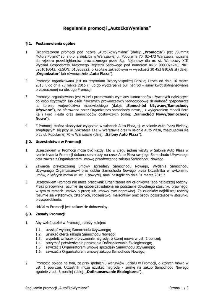 Regulamin promocji „AutoEkoWymiana” § 1. Postanowienia ogólne 1. Organizatorem promocji pod nazwą „AutoEkoWymiana” (dalej: „Promocja”) jest „Summit Motors Poland” sp. z o.o. z siedzibą w Warszawie, ul. Popularna 70, 02-473 Warszawa, wpisana do rejestru przedsiębiorców prowadzonego przez Sąd Rejonowy dla m. st. Warszawy XIII Wydział Gospodarczy Krajowego Rejestru Sądowego pod numerem KRS: 0000024240, NIP: 5261016043, REGON: 010863822, o kapitale zakładowym w wysokości 20 452 810,68 zł (dalej: „Organizator” lub równoważnie „Auto Plaza”). 2. Promocja organizowana jest na terytorium Rzeczypospolitej Polskiej i trwa od dnia 16 marca 2015 r. do dnia 23 marca 2015 r. lub do wyczerpania puli nagród – sumy kwot dofinansowania przeznaczonej na obsługę Promocji. 3. Promocja organizowana jest w celu promowania wymiany samochodów używanych należących do osób fizycznych lub osób fizycznych prowadzących jednoosobową działalność gospodarczą na terenie województwa mazowieckiego (dalej: „Samochód Używany/Samochody Używane”), na oferowane przez Organizatora samochody nowe, , z wyłączeniem modeli Ford Ka i Ford Fiesta oraz samochodów dostawczych (dalej: „Samochód Nowy/Samochody Nowe”). 4. Z Promocji można skorzystać wyłącznie w salonach Auto Plaza, tj. w salonie Auto Plaza Bielany, znajdującym się przy ul. Sokratesa 11a w Warszawie oraz w salonie Auto Plaza, znajdującym się przy ul. Popularnej 70 w Warszawie (dalej: „Salony Auto Plaza”). § 2. Uczestnictwo w Promocji 1. Uczestnikiem w Promocji może być każdy, kto w ciągu jednej wizyty w Salonie Auto Plaza w czasie trwania Promocji dokona sprzedaży na rzecz Auto Plaza swojego Samochodu Używanego oraz zawrze z Organizatorem umowę przedwstępną zakupu Samochodu Nowego. 2. Zawarcie przyrzeczonej umowy sprzedaży Samochodu Nowego, Wydanie Samochodu Używanego Organizatorowi oraz odbiór Samochodu Nowego przez Uczestnika w wykonaniu umów, o których mowa w ust. 1 powyżej, musi nastąpić do dnia 31 marca 2015 r. 3. Uczestnikiem Promocji nie może pracownik Organizatora ani członkowie jego najbliższej rodziny. Przez pracownika rozumie się osobę zatrudnioną na podstawie dowolnego stosunku prawnego, w tym w ramach umowy o pracę lub umowy cywilnoprawnej. Za członków najbliższej rodziny rozumie się wstępnych, zstępnych, rodzeństwo, małżonków oraz osoby pozostające w stosunku przysposobienia. 4. Udział w Promocji jest całkowicie dobrowolny. § 3. Zasady Promocji 1. Aby wziąć udział w Promocji, należy kolejno: 1.1. 1.2. 1.3. 1.4. 1.5. 1.6. 2. uzyskać wycenę Samochodu Używanego; uzyskać ofertę zakupu Samochodu Nowego; wypełnić wniosek o przyznanie nagrody, o której mowa w ust. 2 poniżej; otrzymać potwierdzenie przyznania Dofinansowania Ekologicznego; zawrzeć z Organizatorem umowę sprzedaży Samochodu Używanego; zawrzeć z Organizatorem umowę zakupu Samochodu Nowego; Promocja polega na tym, że przy spełnieniu warunków udziału w Promocji, o których mowa w ust. 1 powyżej, Uczestnik może uzyskać nagrodę - zniżkę na zakup Samochodu Nowego zgodnie z ust. 3 poniżej (dalej: „Dofinansowanie Ekologiczne”). Regulamin promocji „AutoEkoWymiana” Strona 1 / 3 3. W zależności od wieku Samochodu Używanego, Uczestnicy Dofinansowanie Ekologiczne wedle następujących zasad: będą mogli otrzymać Wiek Samochodu Używanego Kwota Dofinansowania Ekologicznego od 4 lat do 5 lat do 5 000 zł od 3 lat do 4 lat do 4 000 zł od 2 lat do 3 lat do 3 000 zł od 1 roku do 2 lat do 2 000 zł do 1 roku do 1 000 zł 4. Salony Auto Plaza dokonują w ramach Promocji odkupu Samochodów Używanych, które w chwili wzięcia udziału w Promocji nie są starsze niż 5 lat. Wiek Samochodu Używanego liczony jest w pełnych latach kalendarzowych, niezależnie od daty pierwszej rejestracji pojazdu (przykładowo: samochód z 2011 roku to auto 4-letnie). 5. Cena odkupu Samochodu Używanego ustalana jest przez Organizatora przy użyciu elektronicznej wersji programu Eurotax. Wycena ta musi zostać zaakceptowana przez Uczestnika. 6. Wniosek o przyznanie Dofinansowania Ekologicznego, o którym mowa w ust. 1 pkt 1.4 powyżej, rozpatrywany jest przez Organizatora niezwłocznie po jego złożeniu przez Uczestnika, na podstawie kryterium wieku Samochodu Używanego oraz dostępności Dofinansowania Ekologicznego w puli. 7. Pula Dofinansowań Ekologicznych jest ograniczona i wynosi: 7.1. 7.2. 7.3. 7.4. 7.5. dla dla dla dla dla Samochodów Samochodów Samochodów Samochodów Samochodów Używanych Używanych Używanych Używanych Używanych do do do do do 5 4 3 2 1 lat: 10 Dofinansowań Ekologicznych; lat: 8 Dofinansowań Ekologicznych; lat: 6 Dofinansowań Ekologicznych; lat: 4 Dofinansowań Ekologicznych; roku: 2 Dofinansowań Ekologicznych. 8. Dofinansowanie Ekologiczne nie podlega wypłacie w pieniądzu ani wymianie na nagrody innego rodzaju. 9. Uczestnik może wziąć udział w Promocji więcej niż jeden raz. § 4. Reklamacje 1. Reklamacje dotyczące Promocji mogą być składane pisemnie, na adres pocztowy Organizatora („Summit Motors Poland” sp. z o.o., ul. Popularna 70, 02-473 Warszawa), lub za pomocą wiadomości e-mail, na adres [email protected]. 2. Reklamacja powinna zawierać imię, nazwisko i adres osoby składającej reklamację, wskazanie przyczyny reklamacji oraz treść żądania. 3. Reklamacje rozpatrywane są w terminie 14 dni od ich otrzymania przez Organizatora. Reklamacje rozpatrywane są na podstawie Regulaminu oraz powszechnie obowiązujących przepisów prawa polskiego. 4. Składający reklamację zostanie o decyzji Organizatora powiadomiony za pomocą wiadomości email lub listu poleconego (w zależności od wybranej przez Uczestnika drogi kontaktu), wysłanego na adres podany w reklamacji. Regulamin promocji „AutoEkoWymiana” Strona 2 / 3 § 5. Postanowienia końcowe 1. Promocja nie łączy się z innymi promocjami i zniżkami, oferowanymi 