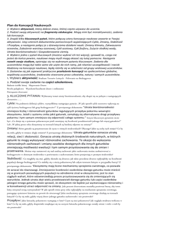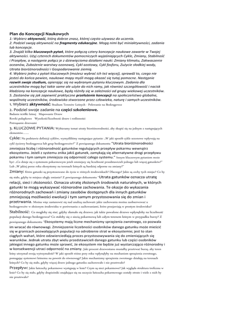 Plan do Koncepcji Naukowych 1: Wybierz aktywność, którą dobrze znasz, której często używasz do uczenia. 2. Podziel swoją aktywność na fragmenty edukacyjne. Mogą nimi być miniaktywności, zadania lub koncepcje. 3. Znajdź kilka kluczowych pytań, które połączą cztery koncepcje naukowe zawarte w Twojej aktywności. Użyj czterech dokumentów pomocniczych wyjaśniających Cykle, Zmiany, Stabilność i Przepływ, a następnie połącz je z dziewięcioma działami nauki: Zmiany klimatu, Zakwaszenie oceanów, Zubożenie warstwy ozonowej, Cykl azotowy, Cykl fosforu, Zużycie słodkiej wody, Utrata bioróżnorodności i Gospodarowanie ziemią. 4. Wybierz jedno z pytań kluczowych (możesz wybrać ich też więcej), sprawdź to, czego nie jesteś do końca pewien, naukowe mapy myśli mogą okazać się tutaj pomocne. Następnie rozwiń swoje studium, opierając się na wybranym pytaniu kluczowym. Zadania dla uczestników mogą być takie same ale użyte do nich ramy, jak również szczegółowość i nacisk kładziony na koncepcje naukowe, będą różniły się w zależności od grupy wiekowej uczestników. 5. Zastanów się jak zapewnić praktyczne przełożenie koncepcji na społeczeństwo globalne, wspólnotę uczestników, środowisko stworzone przez człowieka, naturę i samych uczestników. 1. Wybierz aktywność: Studium Terenów Leśnych - Polowanie na Bezkręgowce 2. Podziel swoje zadanie na części szkoleniowe. Badanie ściółki leśnej Mapowanie Drzew Rowki pułapkowe Wysokość/liczebność drzew i roślinności Potrząsanie drzewami 3. KLUCZOWE PYTANIA: Wybieramy temat utraty bioróżnorodności, aby skupić się na jednym z następujących elementów……. Cykle: Na podstawie definicji cyklów, wymyśliliśmy następujące pytanie: „W jaki sposób cykle sezonowe wpływają na cykl życiowy bezkręgowca lub grup bezkręgowców?” Z powiązanego dokumentu “Utrata bioróżnorodności zmniejsza liczbę i różnorodność gatunków regulujących przepływ pokarmu wewnątrz ekosystemu. Jeżeli z systemu znika jakiś gatunek, zamykają się alternatywne drogi przepływu pokarmu i tym samym zmniejsza się odporność całego systemu.” Innym kluczowym pytaniem może być: „Co dzieje się z systemem pokarmowym jeżeli zmniejszy się liczebność przedstawicieli jednego lub więcej gatunków?” Lub „W jakiej porze roku ekosystemy na terenach leśnych są bardziej odporne na zmiany?” Zmiany: Które gatunki są przystosowane do życia w różnych środowiskach? Dlaczego? Jakie są cechy tych miejsc? Co by się stało, gdyby te miejsca uległy zmianie? Z powiązanego dokumentu “Utrata gatunków oznacza utratę relacji, sieci i złożoności. Oznacza utratę złożonych środowisk naturalnych, w których gatunki te mogą wykazywać różnorodne zachowania. Te okazje do wykazania różnorodnych zachowań i zmiany zasobów dostępnych dla innych gatunków zmniejszają możliwości ewolucji i tym samym przystosowania się do zmian i przetrwania. Można więc zastanowić się nad analizą zachowań: jakie zachowania można zaobserwować u bezkręgowców w złożonym środowisku w porównaniu z zachowaniami, które przejawiają w prostym środowisku? Stabilność: Co mogłoby się stać, gdyby złamało się drzewo; jak takie powalone drzewo wpłynęłoby na liczebność populacji danego bezkręgowca? Co stałoby się z siecią pokarmową lub całym terenem leśnym w przypadku burzy? Z powiązanego dokumentu ”Ekosystemy mają liczne mechanizmy sprzężenia zwrotnego, co pozwala im wracać do równowagi. Zmniejszenie liczebności osobników danego gatunku może mieścić się w granicach pozwalających populacji na odrobienie strat w ekosystemie; jest to stan ciągłych wahań, które odzwierciedlają proces przystosowywania się do zmieniających się warunków. Jednak utrata zbyt wielu przedstawicieli danego gatunku lub części osobników jakiegoś innego gatunku może sprawić, że ekosystem nie będzie już wystarczająco różnorodny i w konsekwencji utraci odporność na zmiany. Jaki procent drzewostanu musiałby przetrwać burzę, aby teren leśny utrzymał swoją wytrzymałość? W jaki sposób różne pory roku wpłynęłyby na mechanizm sprzężenia zwrotnego, pomagając systemowi leśnemu na powrót do równowagi? Jakie mechanizmy sprzężenia zwrotnego działają na terenach leśnych? Co by się stało, gdyby więcej drzew jednego gatunku zachorowało i nie przetrwało? Przepływ: Jakie łańcuchy pokarmowe występują w lesie? Czym są sieci pokarmowe? Jak wygląda struktura troficzna w lesie? Co by się stało, gdyby drapieżniki znajdujące się na szczycie łańcucha pokarmowego zostały otrute i wiele z nich by nie przetrwało? Przekładanie nauki: Pokazanie w jaki sposób zdobyta wiedza łączy się z doświadczeniem uczących się (i to w różnych kontekstach), jest ważnym krokiem na drodze do motywowania do działania na rzecz zrównoważonego rozwoju. Dbając o przekładalność wiedzy, możemy spróbować pokazać w jaki sposób kluczowe kwestie z programu edukacji mogą być użyteczne w szerszym kontekście. Ponownie mogą nam tutaj pomóc kluczowe koncepcje naukowe. Przyjrzyj się wszystkim tym, które zostały opracowane w twoim projekcie edukacyjnym i zastanów się w jaki sposób mogą one zostać przełożone na inne dziedziny życia. Cykle: cykle sezonowe odgrywają dużą rolę w wyborze czasu i miejsca naszych podróży wakacyjnych. Lecąc za ocean, mamy większy wpływ na globalne społeczeństwo. Można również zastanowić się nad tym, gdzie – w środowisku stworzonym przez człowieka – pojawiają się cykle. Czy możemy znaleźć je na przykład w sposobie wytwarzania produktów? Nie, są to najczęściej procesy linearne (wydobyć – wyprodukować – wyrzucić). Czy upodobniająć te procesy do cyklów obecnych w naturze można zwiększyć ich stabilność i szanse na przetrwanie? Zmiany: w ciągu roku u bezkręgowców