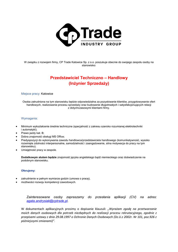 W związku z rozwojem firmy, CP Trade Katowice Sp. z o.o. poszukuje obecnie do swojego zespołu osoby na stanowisko: Przedstawiciel Techniczno – Handlowy (Inżynier Sprzedaży) Miejsce pracy: Katowice Osoba zatrudniona na tym stanowisku będzie odpowiedzialna za pozyskiwanie klientów, przygotowywanie ofert handlowych, realizowanie procesu sprzedaży oraz budowanie długotrwałych i satysfakcjonujących relacji z dotychczasowymi klientami firmy. Wymagania: Minimum wykształcenie średnie techniczne (specjalność z zakresu szeroko rozumianej elektrotechniki i automatyki); Prawo jazdy kat. B; Dobra znajomość obsługi MS Office; Predyspozycji do wykonywania zawodu handlowca/przedstawiciela handlowego (komunikatywność, wysoko rozwinięte zdolności interpersonalne, samodzielność i zaangażowanie, silna motywacja do pracy na tym stanowisku); Umiejętność pracy w zespole. Dodatkowym atutem będzie znajomość języka angielskiego bądź niemieckiego oraz doświadczenie na podobnym stanowisku. Oferujemy: zatrudnienie w pełnym wymiarze godzin (umowa o pracę), możliwości rozwoju kompetencji zawodowych. Zainteresowane osoby zapraszamy [email protected]. do przesłania aplikacji (CV) na adres: W dokumentach aplikacyjnych prosimy o dopisanie klauzuli: „Wyrażam zgodę na przetwarzanie moich danych osobowych dla potrzeb niezbędnych do realizacji procesu rekrutacyjnego, zgodnie z przepisami ustawy z dnia 29.08.1997 o Ochronie Danych Osobowych (Dz.U.z 2002r. Nr 101, poz.926 z późniejszymi zmianami)”.