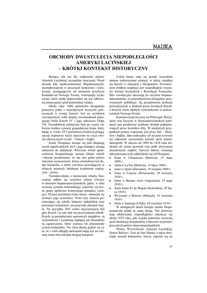 OBCHODY DWUSTULECIA NIEPODLEGŁOŚCI AMERYKI ŁACIŃSKIEJ – KRÓTKI KONTEKST HISTORYCZNY Bieżący rok ma dla większości państw Ameryki Łacińskiej szczególne znaczenie. Przed dwustu laty społeczeństwami Hispanoameryki, ukształtowanymi w procesach konkwisty i kolonizacji, postępujących od momentu przybycia Kolumba do Nowego Świata, wstrząsnęły wydarzenia, które miały doprowadzić do ich całkowitej emancypacji spod kolonialnej władzy. Około roku 1808 monarchia hiszpańska przeżywa jeden z największych kryzysów politycznych w swojej historii. Jest on wynikiem wewnętrznych walk między zwolennikami panującego króla Karola IV i jego sukcesora Filipa VII. Niestabilność polityczna była po części odbiciem trudnej sytuacji gospodarczej kraju, który będąc w wieku XVI prawdziwą światową potęgą, zaczął stopniowo tracić znaczenie na rzecz swoich odwiecznych rywali – Francji i Anglii. Kiedy Hiszpania dostaje się pod okupację wojsk napoleońskich, król i jego następca zostają zmuszeni do abdykacji. Wówczas wśród społeczeństwa hiszpańskiego narasta klimat rebelii i słuszne przekonanie, że ma ono pełne prawo odzyskać suwerenność, której strażnikiem był dotąd monarcha, a którą zawierza powstającym w różnych miastach lokalnym komitetom rządzącym – juntas. Niezadowolenie z narzuconej władzy francuskiej odbiło się szerokim echem również w miastach hispanoamerykańskich, gdzie, w toku rozwoju systemu kolonialnego, pojawiły się liczne grupy społeczne kontestujące panujący status quo. Protest przybierał różne formy, zmieniali się również jego uczestnicy. Przez trzy stulecia powtarzające się rebelie ludności indiańskiej oraz powstania kolonistów utrzymywały płomień buntu. Na początku XIX wieku najważniejszy był głos Kreoli i to oni stali się przywódcami rebelii. Kreole są posiadaczami ogromnych majątków, są wykształceni i rozumieją najlepiej jak absurdalne są ograniczenia, które narzuca im przestarzały system kolonialny. Nie chcą dłużej godzić się na to, że z woli odległej metropolii mają być na własnej ziemi obywatelami drugiej kategorii. Celem buntu staje się przede wszystkim zmiana niekorzystnej sytuacji, w jakiej znajdują się Kreole w relacjach z Hiszpanami. Zewnętrznym źródłem inspiracji jest niepodległość trzynastu kolonii brytyjskich i Rewolucja Francuska. Idee rewolucyjne docierają na terytoria hispanoamerykańskie za pośrednictwem nielegalnie przywożonych publikacji. Są przedmiotem dyskusji prowadzonych w klubach przez światłych Kreoli, z których wielu zdobyło wykształcenie w uniwersytetach Nowego Świata. Konsekwencją kryzysu na Półwyspie Iberyjskim oraz kryzysu w latynoamerykańskich koloniach jest gwałtowne nasilenie działań podejmowanych przez kreolskie elity. W niektórych przypadkach protest wspierany jest przez lud – Metysów i Indian. Jako nadrzędny cel zaczyna rysować się całkowite wyzwolenie kolonii spod władzy metropolii. W okresie od 1809 do 1810 roku dochodzi do ośmiu powstań oraz prób utworzenia niezależnych rządów, których liderzy wyrażają zdecydowaną wolę oddzielenia się od Hiszpanii. Junta w Chuquisaca (Boliwia), 25 maja 1809 r. Junta w La Paz (Boliwia), 16 lipca 1809 r. Junta w Quito (Ekwador), 10 sierpnia 1809 r. Junta w Caracas (Wenezuela), 19 kwietnia 1810 r. Junta w Buenos Aires (Argentyna), 25 maja 1810 r. Junta Santa Fe de Bogota (Kolumbia), 20 lipca 1810 r. Wezwanie z Dolores (Meksyk), 16 września 1810 r. Junta w Santiago (Chile), 18 września 1810 r. W następnych latach kolejne miasta Hispanoameryki pójdą tą samą drogą. Ten pierwszy etap zdobywania niepodległości zakończy się około 1825 roku, gdy wojska patriotów wyzwolą spod dominacji hiszpańskiej większość terytoriów przyszłych państw latynoamerykańskich. Wielcy Wyzwoliciele Ameryki Łacińskiej, Simon Bolívar i José de San Martín, a także dziesiątki innych bohaterów, którzy zapisali się na 57 AMERYKA ŁACIŃSKA 2 (68) 2010 zawsze w historii swoich krajów i całego kontynentu, potrafili właściwie ukierunkować i rozniecić tę iskrę, która pojawiła się w czasie pierwszych przejawów dążenia do niepodległości. Po dwustu latach narody Ameryki Łacińskiej, odwołując się do tamtego momentu historycznego, znajdują w nimi punkt odniesienia, by podkreślać swoje wspólne korzenie oraz upamiętniać moment narodzenia tożsamości latynoamerykańskiej. Z tego względu między innymi, w wielu krajach latynoamerykańskich rok 2010 został ustanowiony Rokiem Dwustulecia Niepodległości. Została powołana grupa koordynująca obchody tej rocznicy w całym regionie latynoamerykańskim – Grupo Bicentenario (http://www.grupobicentenario.org), której członkiem jest również Hiszpania. I to jest, być może, najpiękniejsze przesłanie wśród wszystkich, które docierają do nas przy okazji tych obchodów: fakt, że historia, nawet w odniesieniu do konfliktów z przeszłości, jeśli zostanie właściwie ujęta, może stanowić podstawę do zbliżenia i współpracy między narodami. Uroczystości z okazji Dwustulecia Niepodległości Ameryki Łacińskiej mają charakter coraz bardziej powszechny i odbywają się w różnych krajach i regionach świata. Uniwersytet Warszawski włączył się również w te obchody. W dniach 17-30 maja br. odbyły się różne okolicznościowe uroczystości o charakterze akademickim i kulturalnym. Mamy nadzieję, że w ten sposób damy wyraz dążeniom środowiska akademickiego w Polsce do wzmacniania więzów współpracy, jakie już istnieją z krajami Ameryki Łacińskiej, ich instytucjami akademickimi i naukowymi. Obchody Dwustulecia Niepodległości Ameryki Łacińskiej odbywały się pod patronatem Jej Magnificencji Rektor Uniwersytetu Warszawskiego, prof. Katarzyny Chałasińskiej-Macukow. Współorganizatorem obchodów był Urząd Miasta Węgrów. Program został zrealizowany przy wsp