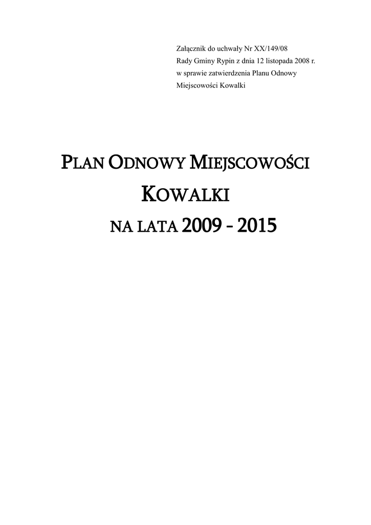 Załącznik do uchwały Nr XX/149/08 Rady Gminy Rypin z dnia 12 listopada 2008 r. w sprawie zatwierdzenia Planu Odnowy Miejscowości Kowalki PLAN ODNOWY MIEJSCOWOŚCI KOWALKI NA LATA 2009 - 2015 SPIS TREŚCI 1. Charakterystyka miejscowości Kowalki 1.1 Środowisko przyrodnicze 1.2 Turystyka 1.3 Infrastruktura - komunikacja - gospodarka wodna - gospodarka ściekowa - gospodarka odpadami - ogrzewanie 1.4 Sfera społeczna 1.5 Wykaz zadań zaplanowanych do realizacji w miejscowości Kowalki w latach 2009 – 2015 1.6 Szczegółowa charakterystyka zadania inwestycyjnego p.n. Remont i modernizacja świetlicy wiejskiej Kowalki 1.7 Harmonogram planowanego przedsięwzięcia Załączniki: - Analiza zasobów miejscowości, - JACY JESTEŚMY ? - diagnoza aktualnej sytuacji miejscowości, - Analiza SWOT. 1. Charakterystyka miejscowości Miejscowość Kowalki jest sołectwem wchodzącym w skład gminy Rypin. Położona jest w jej południowej części. Graniczy z miejscowościami: Balin, Dębiany, Dylewo, Głowińsk i Sikory oraz w swej południowej części z Lasotami i Pręczkami należącymi do gminy Rogowo. Położona jest w powiecie rypińskim, w południowo-wschodniej części województwa kujawskopomorskiego, na Ziemi Dobrzyńskiej. Przez wieś biegnie droga powiatowa z Rypina do Pręczek. Utwardzone są trzy drogi gminne: z Kowalk do Nadroża, z Kowalk do Głowińska oraz droga Kowalki – Lasoty. Pozostałe drogi gminne to drogi gruntowe. 1.1 Środowisko przyrodnicze Ogólna powierzchnia wsi Kowalki wynosi 489,36 ha, z czego 410,44 ha to użytki rolne, dobrej jakości, w większości o klasie bonitacji gleby III b i IV a. Lasy zajmują pow. 9,68 ha. Pozostałe tereny to tereny zurbanizowane, grunty pod wodami, luźne zadrzewienia i nieużytki. 1.2 Rozwój turystyki Na rozwój turystyki może wpłynąć fakt istnienia w Kowalkach miejsca naturalnego występowania żółwia błotnego. Aby stworzyć rezerwat żółwia albo przynajmniej teren prawnie chroniony, gmina powinna wykupić grunty i nieużytki, na których on występuje. 1.3 Infrastruktura techniczna Komunikacja kołowa jest realizowana za pośrednictwem drogi powiatowej Rypin – Pręczki, która łączy się z drogą wojewódzką Rypin – Lipno. Komunikację ułatwiają też drogi gminne Kowalki - Głowińsk, Kowalki Lasoty i Kowalki - Pręczki. Źródłem poboru wody dla zaopatrzenia mieszkańców wsi Kowalki jest ujęcie wód podziemnych znajdujące się w Kowalkach o wydajności z dwóch studni łącznie 78 m3/h, a 624 m3/d. Woda do gospodarstw domowych dostarczana jest przez wybudowaną sieć wodociągową. Cała wieś jest zwodociągowana, ale podłączyło się do niej 116 gospodarstw z istniejących 138. Pozostałe gospodarstwa czerpią wodę z własnych studni. Wytwarzane w gospodarstwach domowych ścieki w 59 przypadkach trafiają do przydomowych oczyszczalni ekologicznych, pozostałe kierowane są do wybieralnych szamb. Odpady komunalne są wstępnie segregowane – szkło, plastik i papier trafiają do pojemników do selektywnej zbiórki odpadów ustawionych w centrum wsi. Pozostałe, najczęściej odpady organiczne są kompostowane. 21 gospodarstw wydzierżawiło pojemniki na odpady w przedsiębiorstwo komunalne KOMES. System grzewczy w miejscowości Kowalki tak jak w całej gminie to indywidualne kotłownie domowe i piece. Względy ekonomiczne decydują, że surowcem opałowym jest węgiel i częściowo drewno. Należy upowszechnić kolektory słoneczne i piece na słomę oraz odpady drzewne. 1.4 Sfera społeczna Ludność wsi Kowalki liczy 595 osób, w tym 308 mężczyzn i 287 kobiet. Większość pracujących mieszkańców utrzymuje się z pracy we własnych gospodarstwach rolnych. 35 rodzin korzysta z pomocy społecznej a 30 z nich pobiera stałe lub okresowe zasiłki. W miejscowości Kowalki 22 osoby mają zarejestrowaną działalność gospodarczą. 1.5 Wykaz zadań zaplanowanych do realizacji w miejscowości Kowalki w latach 2009-2015 remont i modernizacja świetlicy, budowa boiska sportowego na terenie szkolnym (szacunkowy koszt 1.000.000 zł.), budowa placu zabaw dla dzieci (25.000 zł.), budowa parkingu przy świetlicy (5.000 zł.), zainstalowanie nowej kawiarenki internetowej (30.000 zł). 1.6. Szczegółowa charakterystyka zadania inwestycyjnego p.n. Remont i modernizacja świetlicy wiejskiej w Kowalkach Nazwa zadania: Remont i modernizacja świetlicy wiejskiej w Kowalkach Beneficjent: Gmina Rypin Lokalizacja: Miejscowość Kowalki Charakterystyka zadania: Remont obiektu przewiduje: rozebranie pokrycia dachowego, pokrycie dachu blachodachówką, wymiana stolarki okiennej i drzwiowej, ocieplenie ścian budynku styropianem, położenie tynków elewacyjnych, rozebranie podsufitki z desek, położenie okładzin gipsowo-kartonowych, rozebranie drewnianych łazienek, pobudowanie ścianek łazienek z płytek gazobetonowych z montażem umywalek, ustępów i pisuarów, wymiana instalacji elektrycznej, instalacja centralnego ogrzewania, dobudowa pomieszczeń gospodarczych. Celem inwestycji jest: podniesienie komfortu życia mieszkańców poprzez stworzenie możliwości spotykania się w świetlicy. poprawa estetyki i zagospodarowanie terenu, Efekty realizacji inwestycji będą miały znaczenie lokalne. Skutki planowanego zadania będą oddziaływały głównie na społeczność lokalną poprzez poprawę estetyki, zagospodarowanie terenu, w przyszłości dostęp społeczeństwa do sieci internetowej. 1.7 Harmonogram planowanego przedsięwzięcia: Wykonanie prac remontowych na obiekcie świetlicy w Kowalkach przedstawia się następująco: Roboty rozbiórkowe podłóg, ścianek działowych stolarki okiennej i drzwiowej oraz stropów i dachu planuje się wykonać w miesiącach maj czerwiec 2009 roku. Pokrycie dachu blachodachówką, montaż okien i drzwi oraz wykonanie ścianek działowych zamierza się wykonać w miesiącu czerwcu 2009 r. Wymianę instalacji elektrycznej, remont ogrzewania i instalacji wod-kan przewiduje s