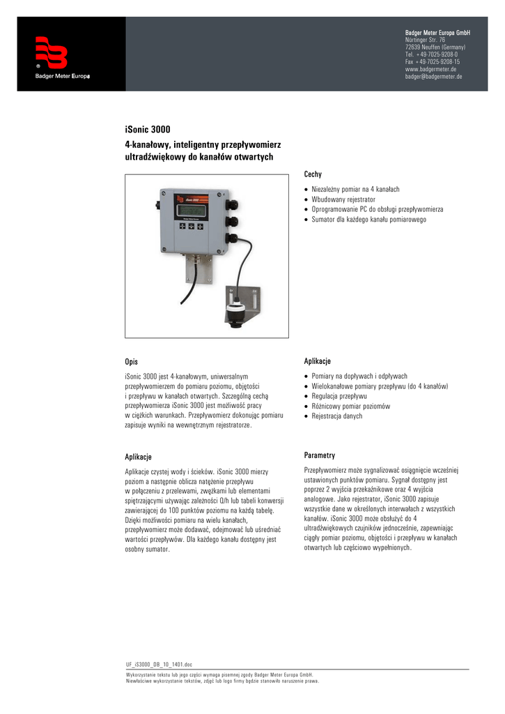 Badger Meter Europa GmbH Nürtinger Str. 76 72639 Neuffen (Germany) Tel. +49-7025-9208-0 Fax +49-7025-9208-15 www.badgermeter.de [email protected] iSonic 3000 4-kanałowy, inteligentny przepływomierz ultradźwiękowy do kanałów otwartych Cechy Niezależny pomiar na 4 kanałach Wbudowany rejestrator Oprogramowanie PC do obsługi przepływomierza Sumator dla każdego kanału pomiarowego Opis Aplikacje iSonic 3000 jest 4-kanałowym, uniwersalnym przepływomierzem do pomiaru poziomu, objętości i przepływu w kanałach otwartych. Szczególną cechą przepływomierza iSonic 3000 jest możliwość pracy w ciężkich warunkach. Przepływomierz dokonując pomiaru zapisuje wyniki na wewnętrznym rejestratorze. Aplikacje Parametry Aplikacje czystej wody i ścieków. iSonic 3000 mierzy poziom a następnie oblicza natężenie przepływu w połączeniu z przelewami, zwężkami lub elementami spiętrzającymi używając zależności Q/h lub tabeli konwersji zawierającej do 100 punktów poziomu na każdą tabelę. Dzięki możliwości pomiaru na wielu kanałach, przepływomierz może dodawać, odejmować lub uśredniać wartości przepływów. Dla każdego kanału dostępny jest osobny sumator. Przepływomierz może sygnalizować osiągnięcie wcześniej ustawionych punktów pomiaru. Sygnał dostępny jest poprzez 2 wyjścia przekaźnikowe oraz 4 wyjścia analogowe. Jako rejestrator, iSonic 3000 zapisuje wszystkie dane w określonych interwałach z wszystkich kanałów. iSonic 3000 może obsłużyć do 4 ultradźwiękowych czujników jednocześnie, zapewniając ciągły pomiar poziomu, objętości i przepływu w kanałach otwartych lub częściowo wypełnionych. Pomiary na dopływach i odpływach Wielokanałowe pomiary przepływu (do 4 kanałów) Regulacja przepływu Różnicowy pomiar poziomów Rejestracja danych UF_iS3000_DB_10_1401.doc Wykorzystanie tekstu lub jego części wymaga pisemnej zgody Badger Meter Europa GmbH. Niewłaściwe wykorzystanie tekstów, zdjęć lub logo firmy będzie stanowiło naruszenie prawa. Dane techniczne Typ Obudowa Wymiary Stopień ochrony Zakres temp. pracy Wyjścia Wejścia Wyświetlane funkcje Język Zasilanie Programowanie Rejestrator Interfejs Czujniki iSonic 3000 (pomiar 4-kanałowy) Metal / Aluminium 180 x 180 x 80 mm (wys. x szer. x głęb.) IP67 od -25°C do +45°C 4 wyjścia analogowe 4-20 mA, izolowane 2 przekaźniki, 200 V / 500 mA programowalne, galwanicznie izolowane 2 wyjścia cyfrowe, maks. 35 VDC / 50 mA ModBus® RS485 lub RS422 4 wejścia analogowe 4-20 mA 4 linie dla poziomu, przepływu, sumy, objętości, dystansu i statusu Angielski 85 – 230 VAC lub 12 VDC (opcja) Oprogramowanie PC (zabezpieczone hasłem dostępu) Karta SD, programowalne czasy zapisu, dane dostępne w postaci tabeli USB, opcjonalnie: Ethernet, M-Bus Typ DL10 DL24 ULM53 ULM70 Dokładność pomiaru w zakresie pomiarowym Zakres pomiaru 0-1250mm 0-3000mm 0-6000mm 0-2000mm Offset 50mm 100mm 200mm 200mm DL10 DL24 ULM53 ULM70 Aplikacje UF_iS3000_DB_10_1401.doc Wykorzystanie tekstu lub jego części wymaga pisemnej zgody Badger Meter Europa GmbH. Niewłaściwe wykorzystanie tekstów, zdjęć lub logo firmy będzie stanowiło naruszenie prawa. Kąt wiązki 2° 2° 14° 10° Materiał PVDF PVDF PVC/PVDF PVC/PVDF Dopuszczenie II 1/2G Ex ia IIB T5 ±0,5 % ±0,5 % ±0,5 % ±0,5 %